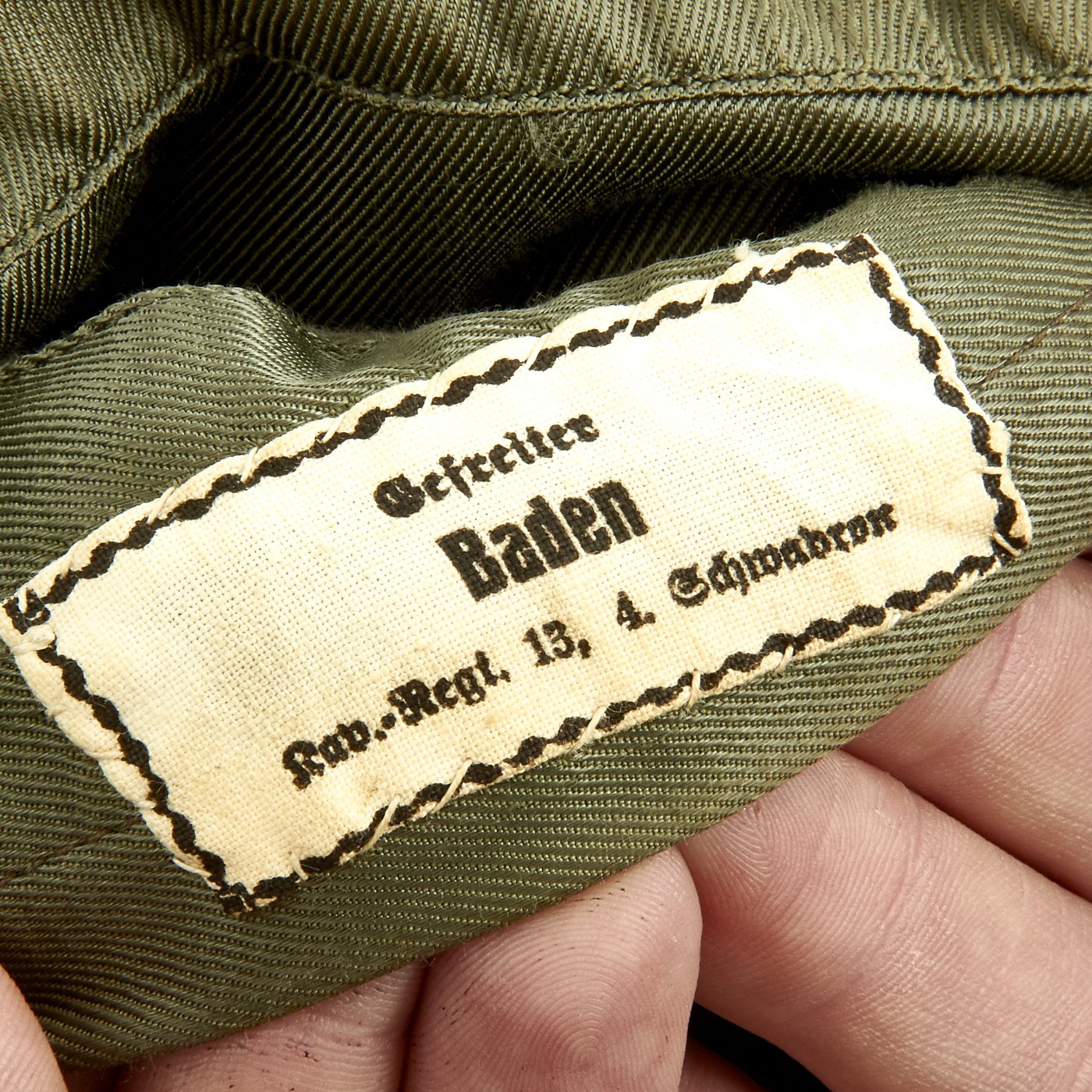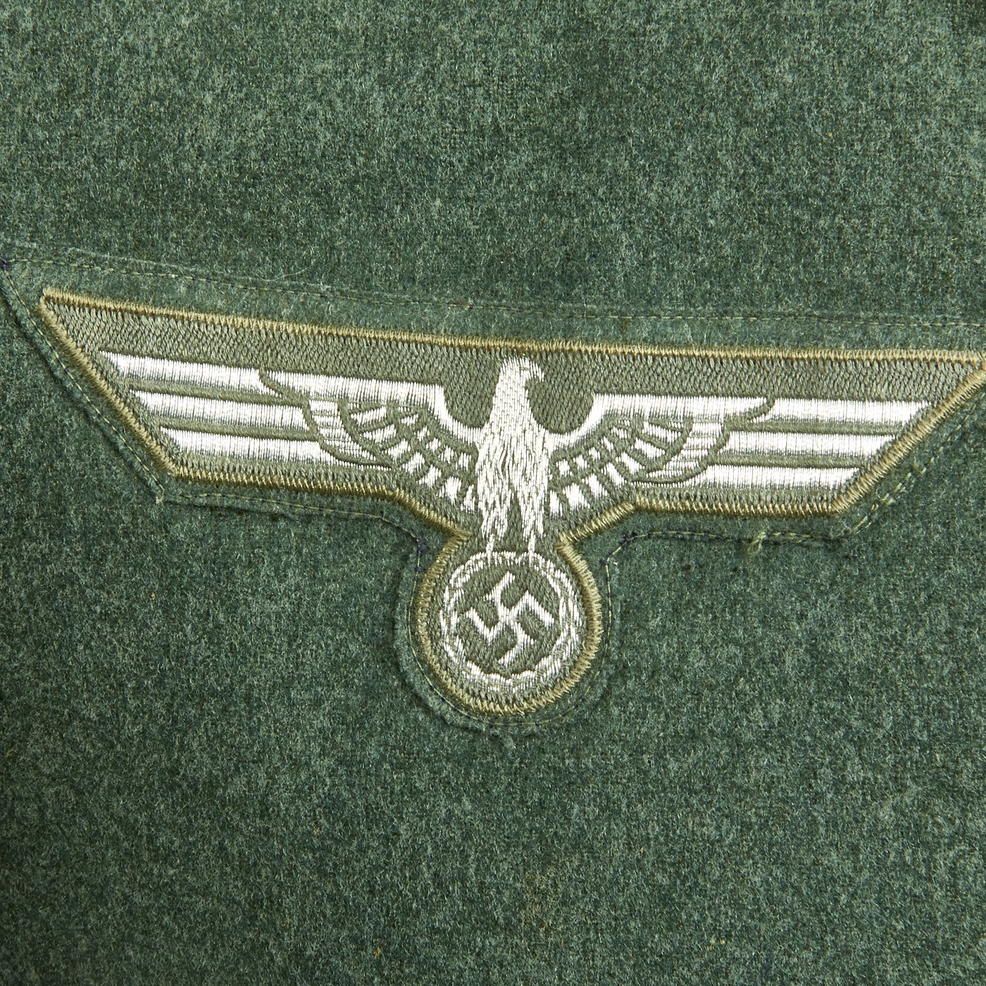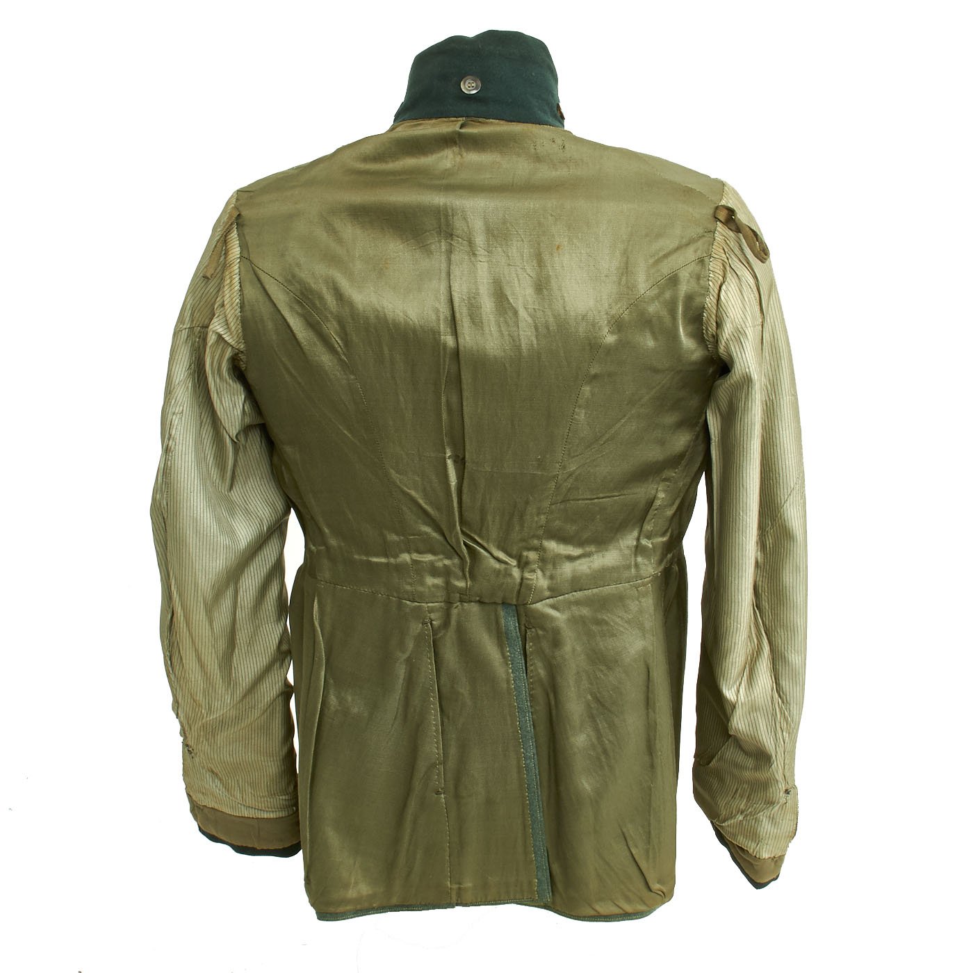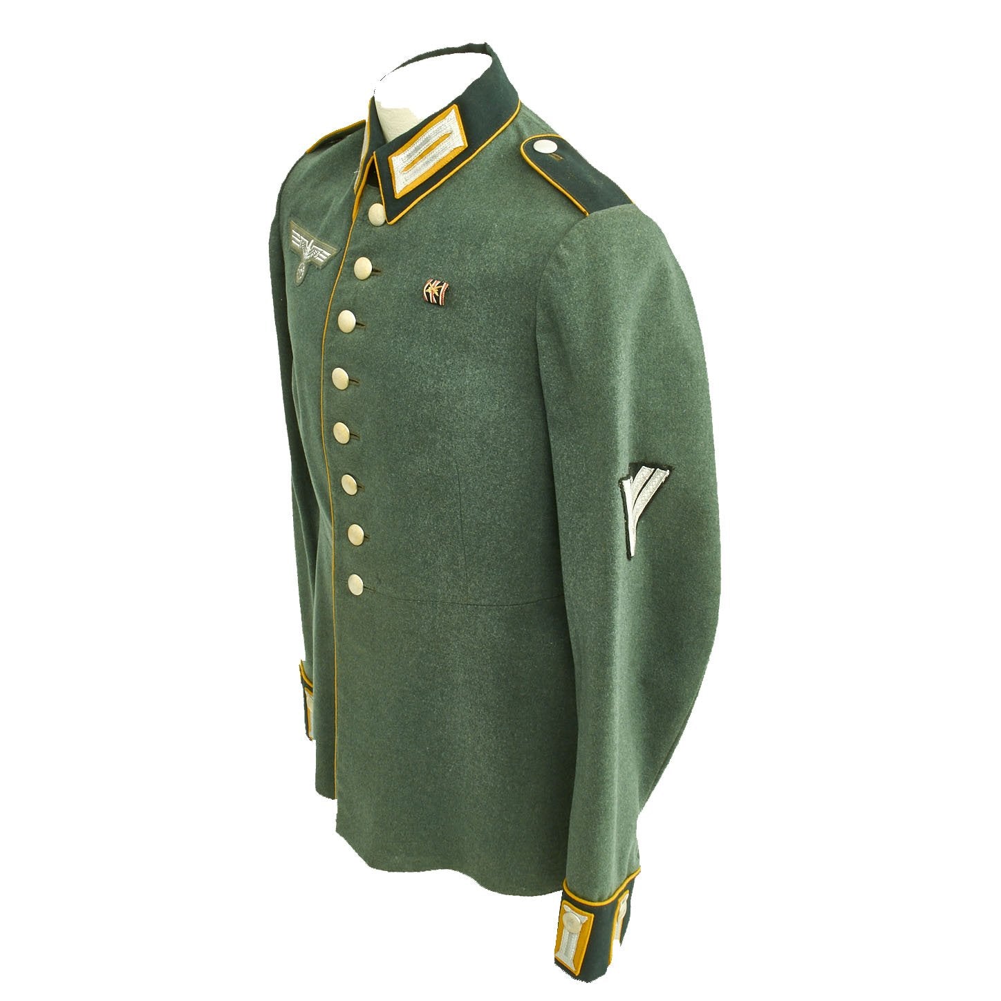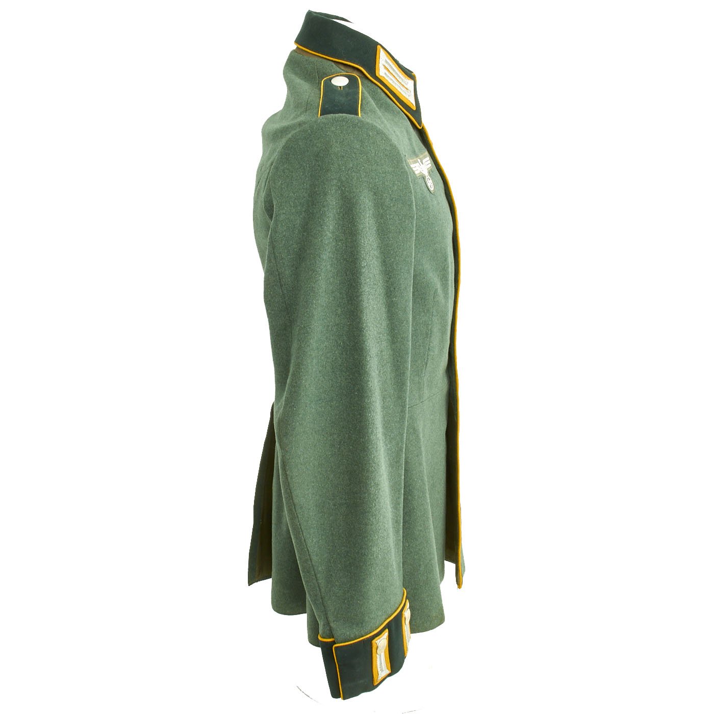 Original Item: Only One Available. This is a wonderful condition Obergefreiter (Corporal) Cavalry Division Waffenrock tunic. The breast features a machine embroidered silver wire eagle, embroidered on a light green base that was machine sewn to a field gray wool backer. The shoulder stripes are piped in golden yellow for cavalry. . The collar, and its insignia, are without any noticeable damage or mothing. The “sew-in” style shoulder boards of this Waffenrock have a dark green base wool, which is piped in golden yellow. Eight silvered pebbled buttons adorn the front of the tunic and all appear to be originally attached. The lower french style cuffs of the sleeves have a dark-green based wool, and is adorned with white piping and silver litzen. The interior of the Waffenrock is lined with a fine rayon. The interior of the Waffenrock is marked with depot stamp and date E36 which stands for Erfurt 1936. Internal name label. Overall excellent condition.