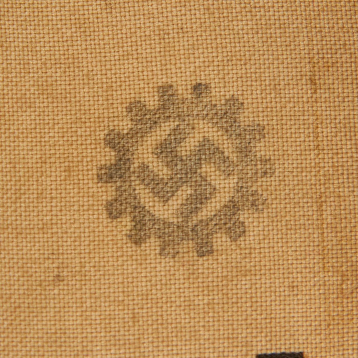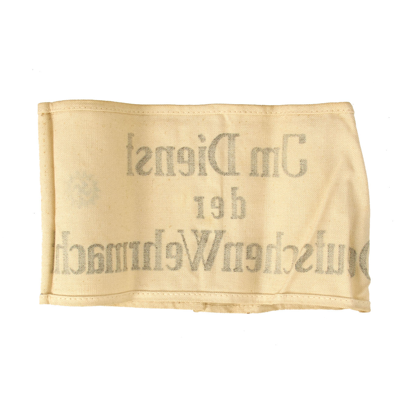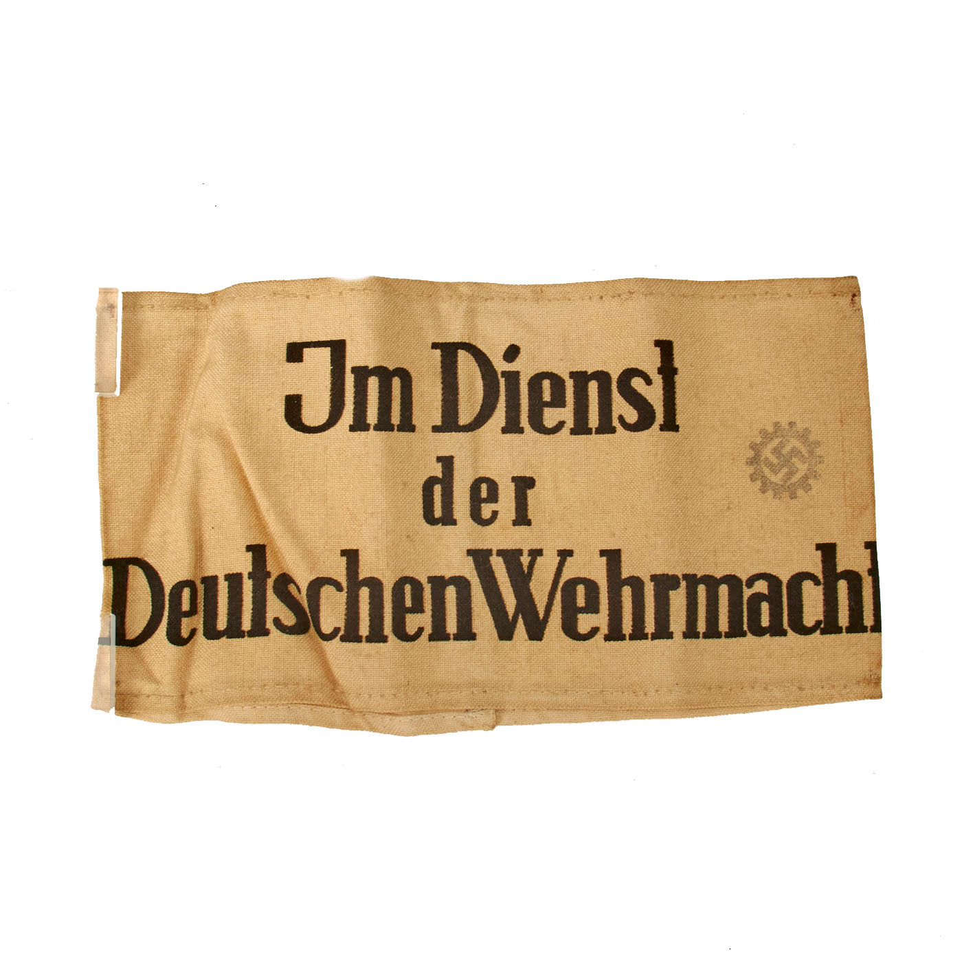 The Im Dienst der Deutschen Wehrmacht (In Service of the German Armed Forces) ärmelbind (armband) was introduced on October 1st 1941 for use by non-German civilians serving the Armed Forces and Russian Auxiliaries when not in uniform. Additionally, this example is stamped with the DAF (German Labor Front) insignia, possibly indicating that the civilian was a member of that group.