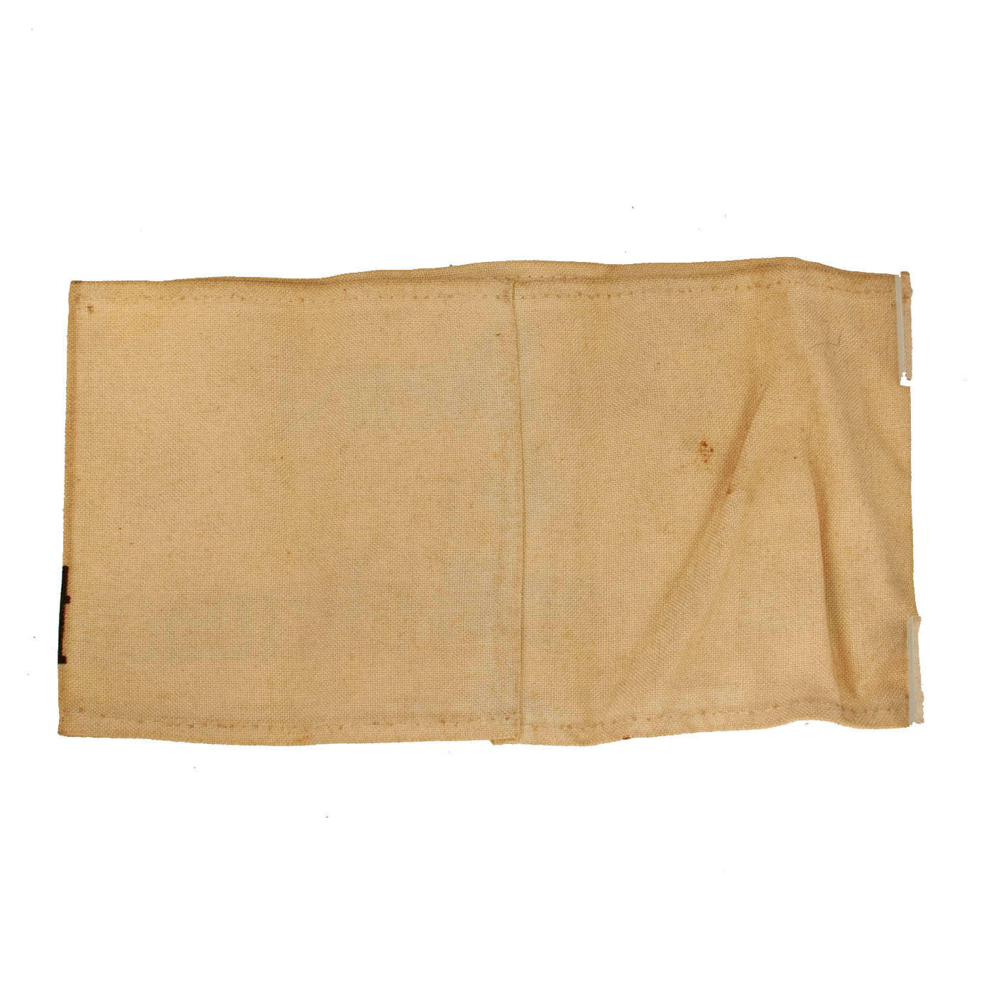 It measures approximately 15" x 4", and is sewn together in the back. There is overall age toning and light staining, which has made the armband look almost beige now. It does not look to have been attached to a uniform or sleeve, however it does look to have been hung on a display board with pins at the four corners for a while.