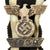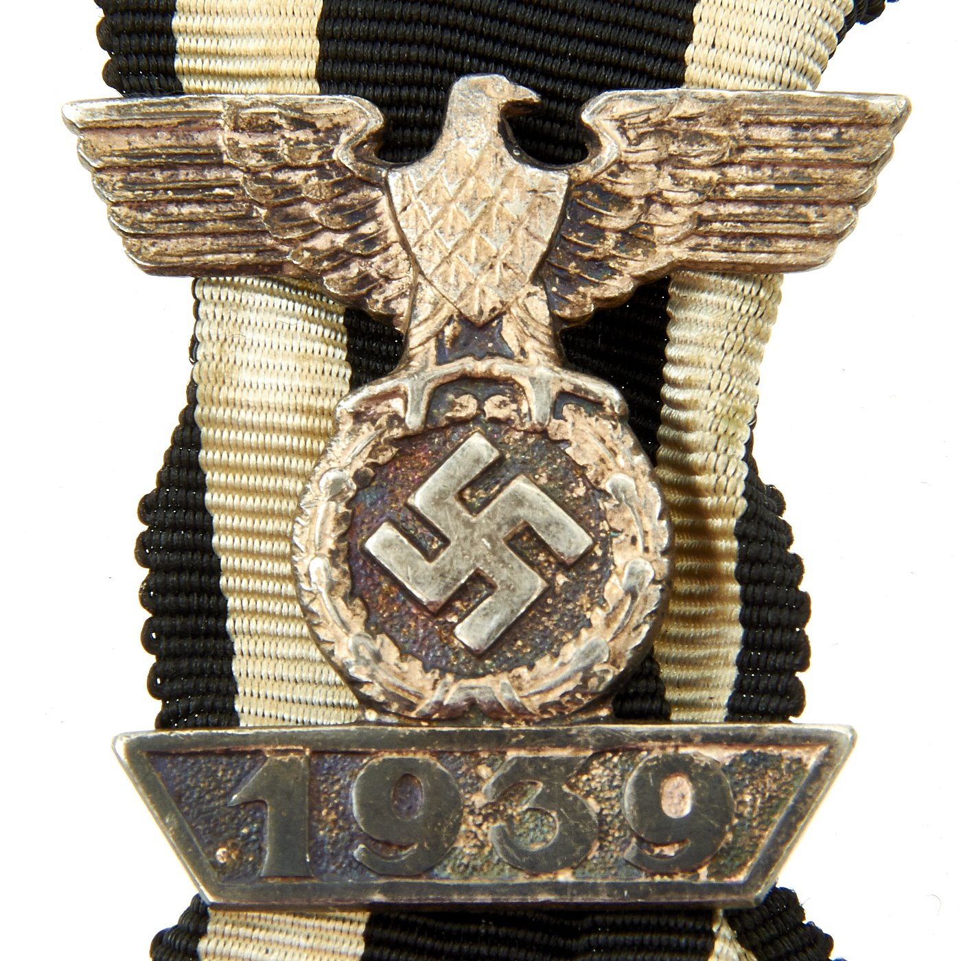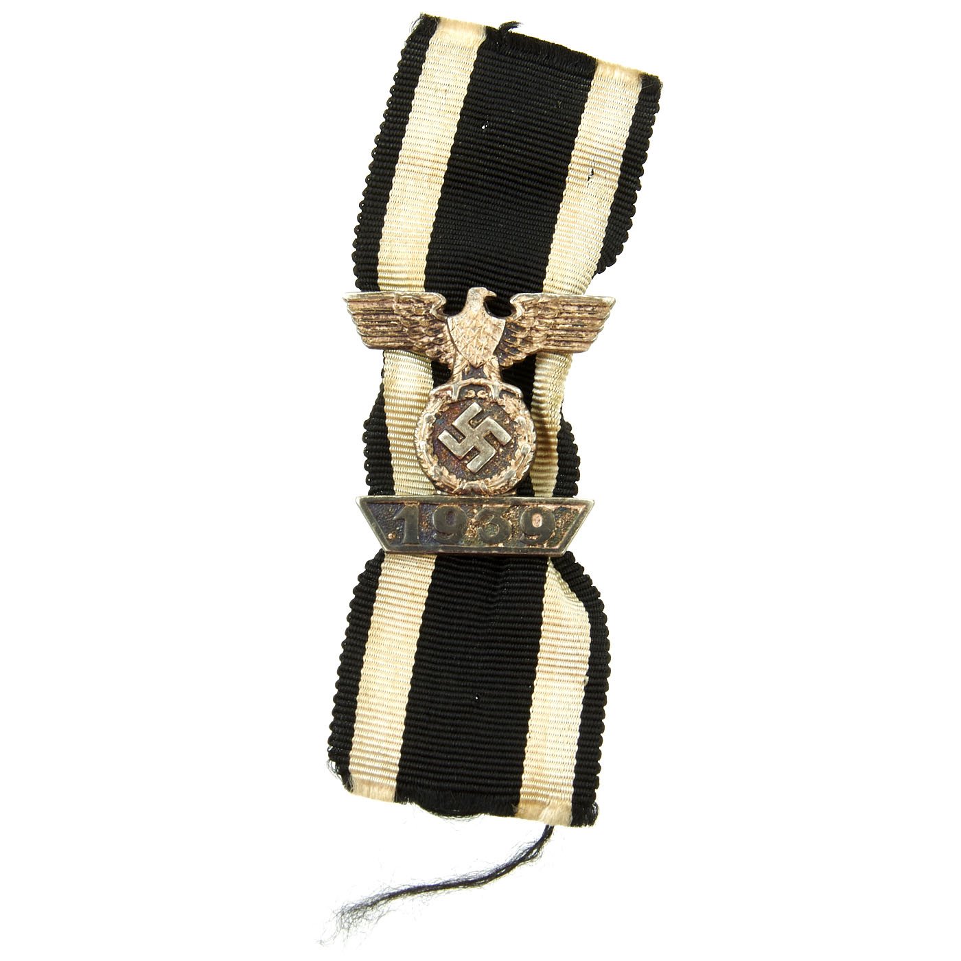 With so many Iron Crosses issued in WWI, it was inevitable that soldiers who already had achieved the 1914 version of the award might receive another during WWII. When the 1939 Iron Cross began being issued, they also introduced the Clasp to the Iron Cross (Spange zum Eisernen Kreuz). This way, a holder of the 1914 Iron Cross could be awarded a second or higher grade of the 1939 Iron Cross. To permit the two medals to be worn together, a "1939 Clasp" (Spange) would be worn on the original 1914 Iron Cross. It depicted a national eagle clutching an oak leaf wreath surrounding a swas above a trapezoid bearing the year 1939. The clasp was attached to the 1914 Iron Cross medal ribbon. The ribbon was then worn through a tunic button of the uniform.