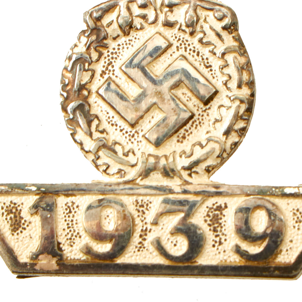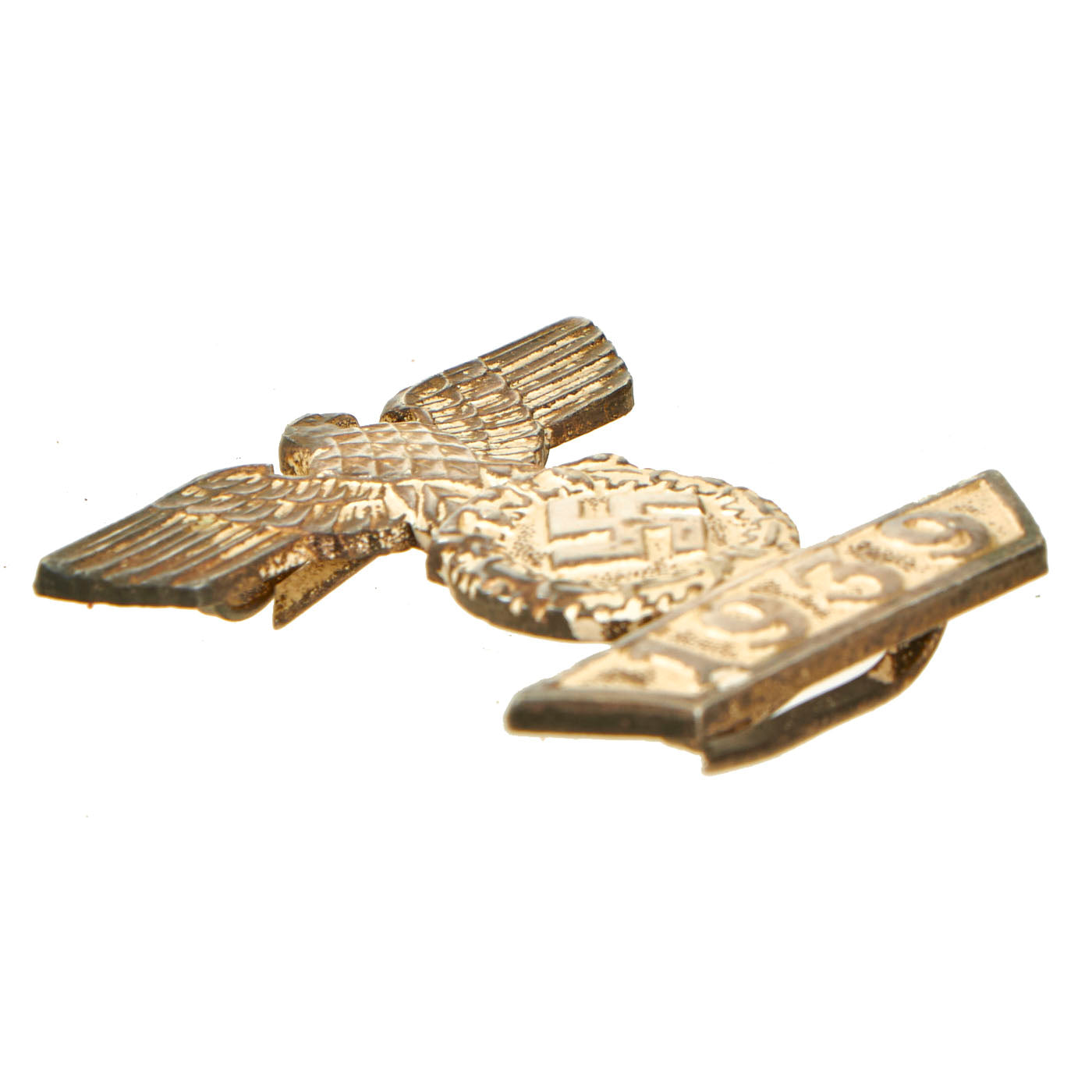 With so many Iron Crosses issued in WWI, it was inevitable that soldiers who already had achieved the 1914 version of the award might receive another during WWII. When the 1939 Iron Cross began being issued, they also introduced the Clasp to the Iron Cross (Spange zum Eisernen Kreuz). This way, a holder of the 1914 Iron Cross could be awarded a second or higher grade of the 1939 Iron Cross. To permit the two medals to be worn together, a "1939 Clasp" (Spange) would be worn on the original 1914 Iron Cross. It depicted a national eagle clutching an oak leaf wreath surrounding a swas above a trapezoid bearing the year 1939. The clasp was attached to the 1914 Iron Cross medal ribbon. The ribbon was then worn through a tunic button of the uniform.