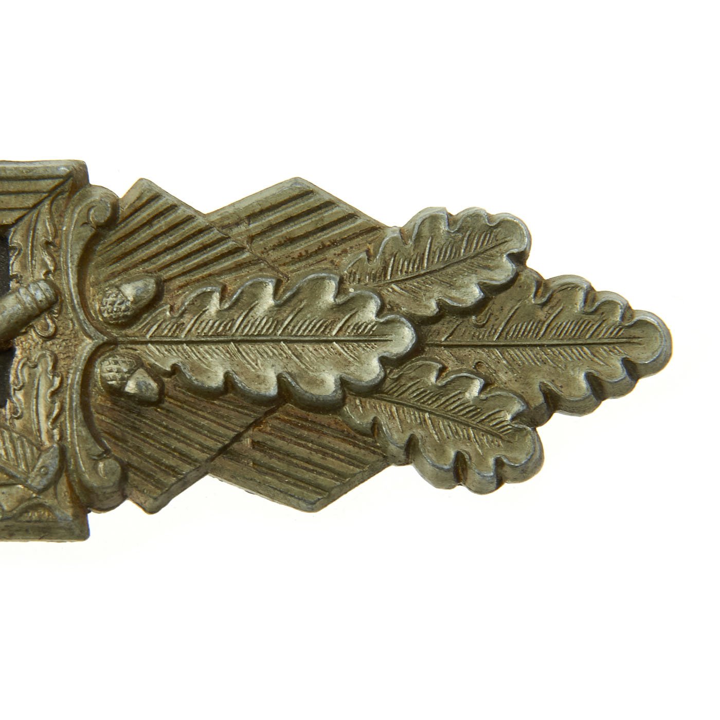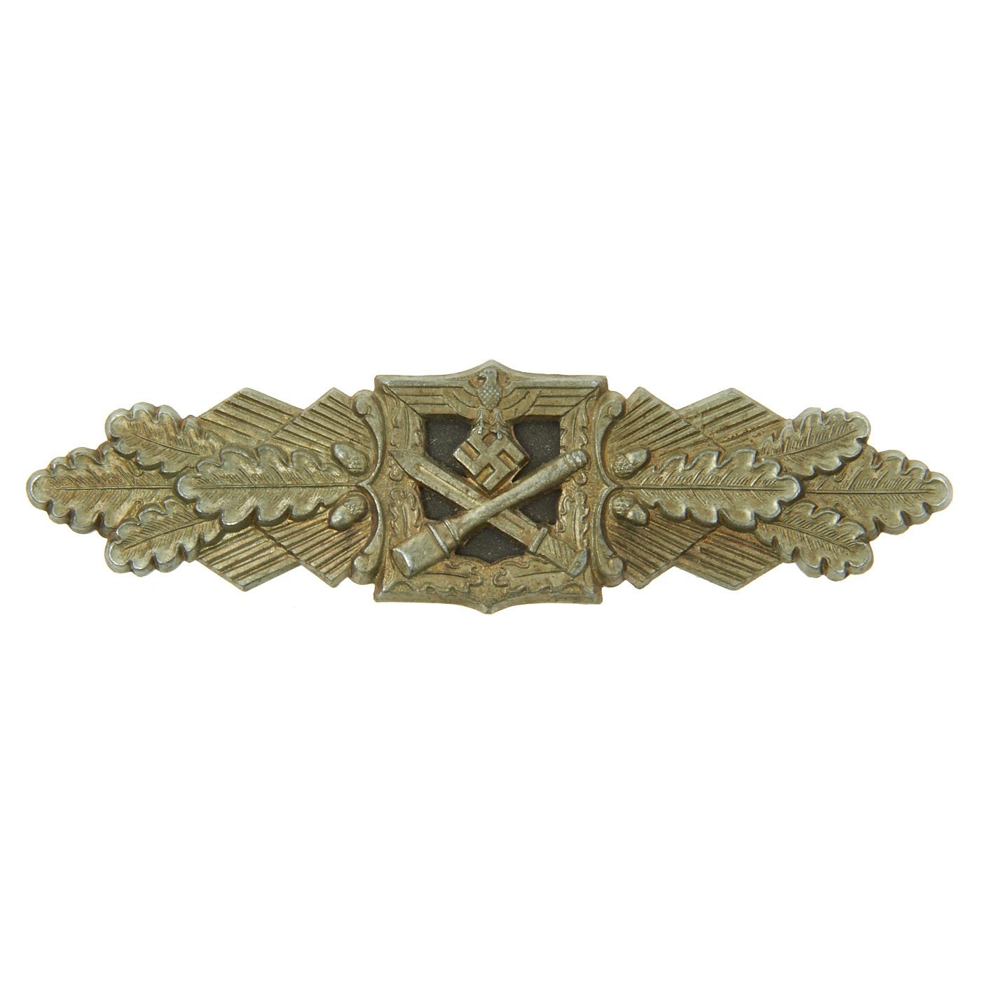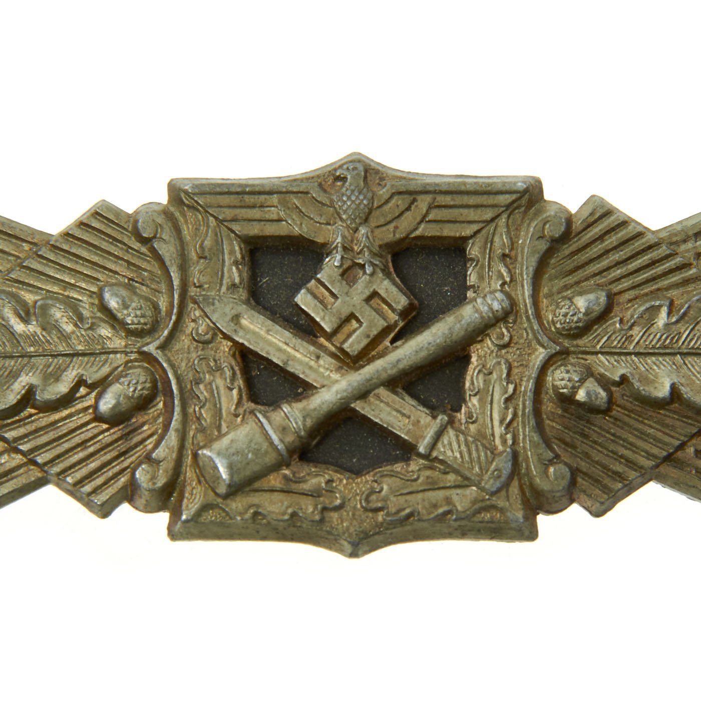 Original Item: Only One Available. Known in German as a Nahrkampfspange in Bronze, this fine award is constructed of bronzed slightly vaulted zinc. The obverse with a national eagle and a bayonet and hand grenade in the centerpiece, with sun rays emanating from the center of the left and right sides, and with four oak leaves and two acorns on each side. The reverse side is plain, with a square non-magnetic backing plate behind the insignia, and a horizontal pin back with a barrel hinge and a flat wire catch. Just by the catch the back is marked F & B L, for maker Funcke & Brünninghaus of Lüdenscheid.