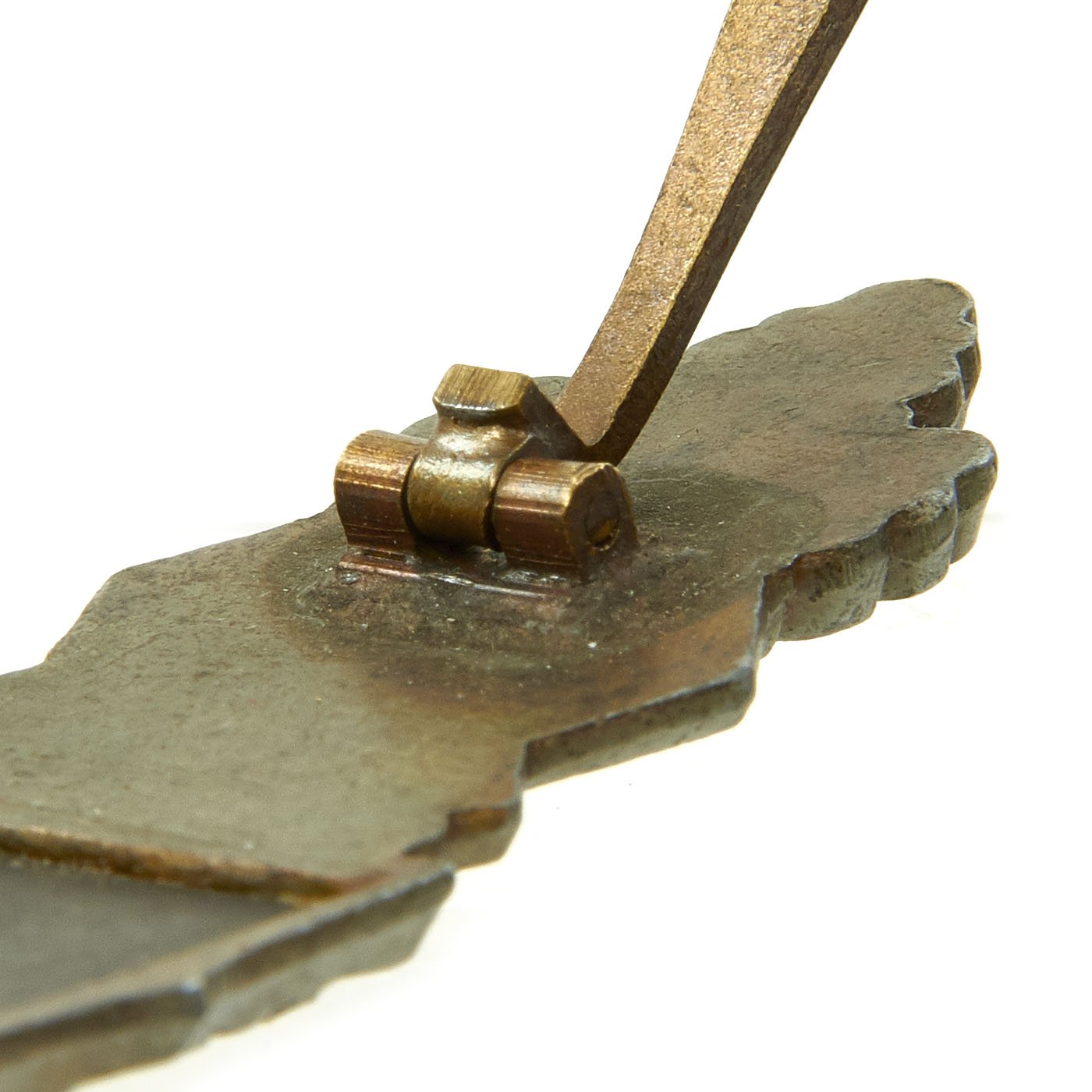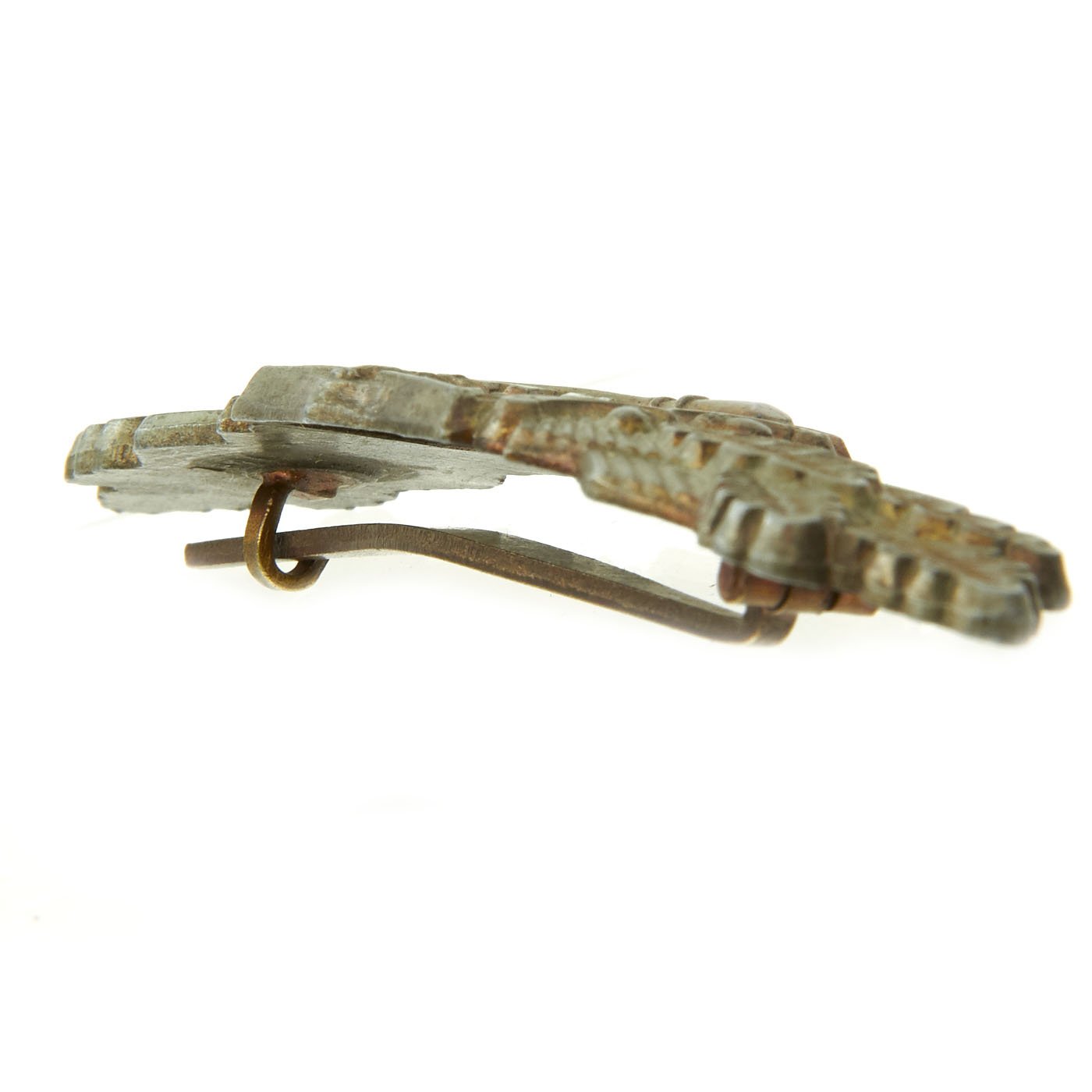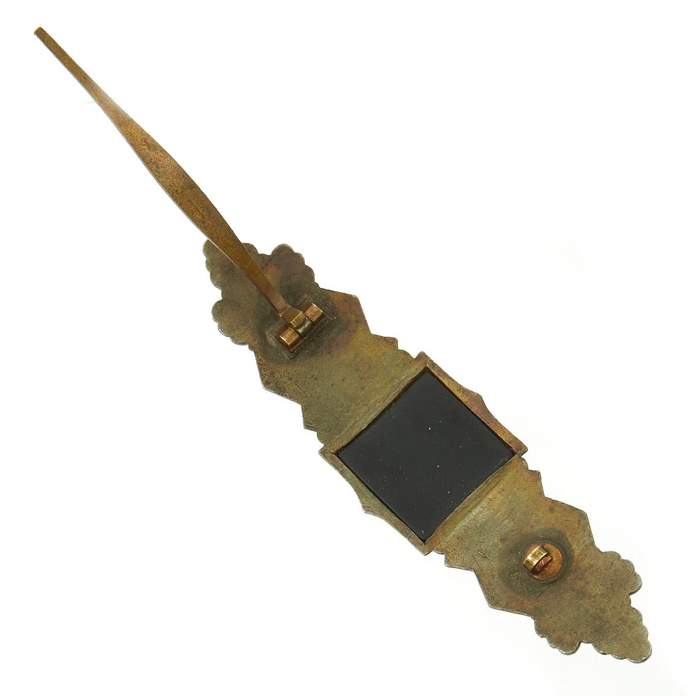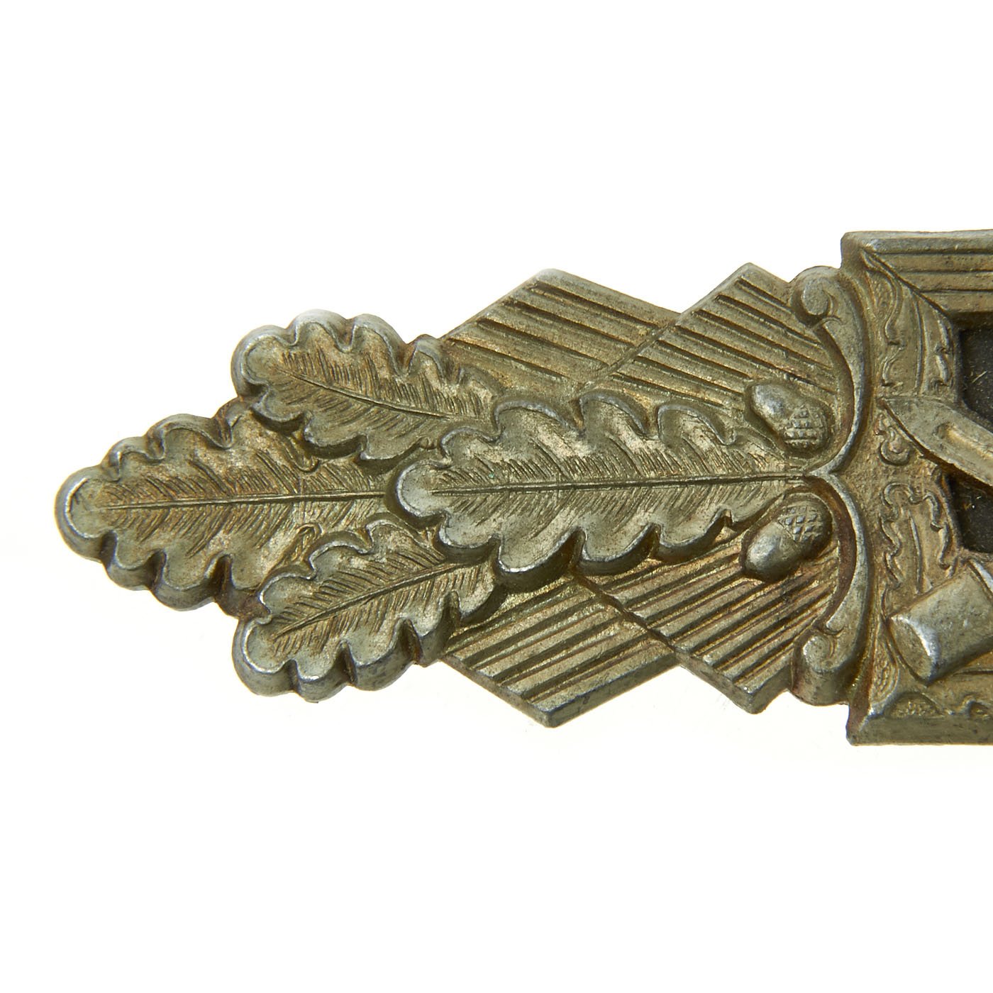 Original Item: Only One Available. Known in German as a Nahrkampfspange in Bronze, this fine award is constructed of bronzed slightly vaulted zinc. The obverse with a national eagle and a bayonet and hand grenade in the centerpiece, with sun rays emanating from the center of the left and right sides, and with four oak leaves and two acorns on each side. The reverse side is plain, with a square non-magnetic backing plate behind the insignia, and a horizontal pin back with a barrel hinge and a flat wire catch. Just by the catch the back is marked F & B L, for maker Funcke & Brünninghaus of Lüdenscheid.