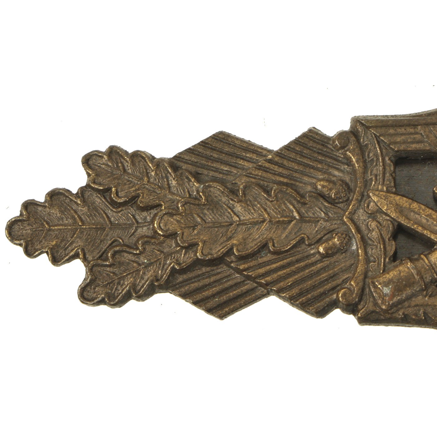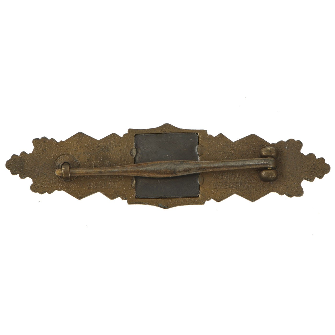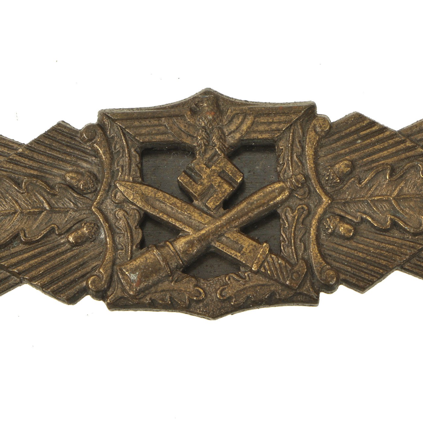 Original Item: Only One Available. Known in German as a Nahrkampfspange (Melee Clasp) in Bronze, this fine award is constructed of bronzed slightly vaulted zinc. The front side has a Reichsadler (national eagle) over a crossed bayonet and hand grenade in the centerpiece. There are sun rays emanating from the center of the left and right sides, with with four oak leaves and two acorns on each side. The reverse is plain, with a square magnetic backing plate with horizontal pin back, with a barrel hinge and a flat wire catch on the reverse.