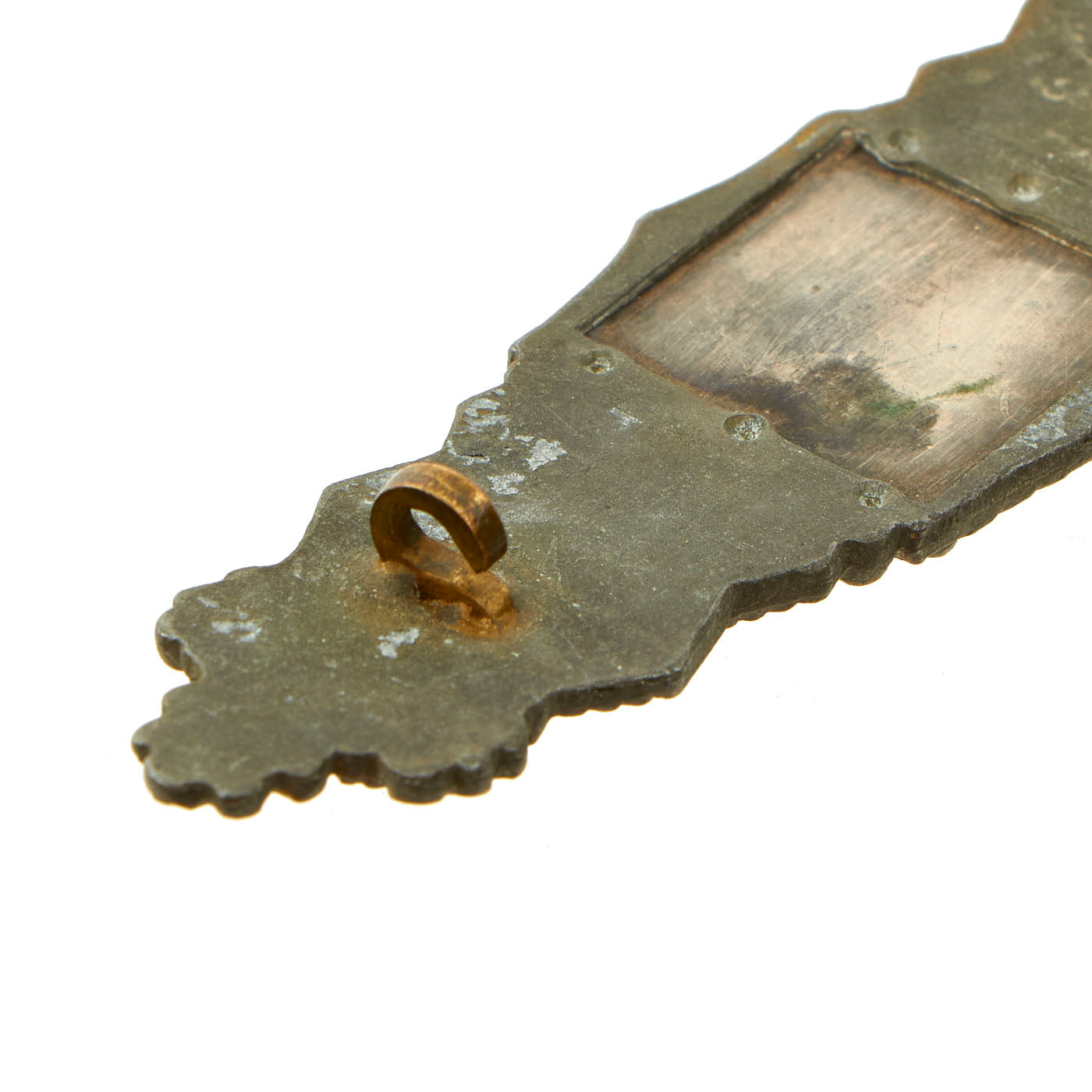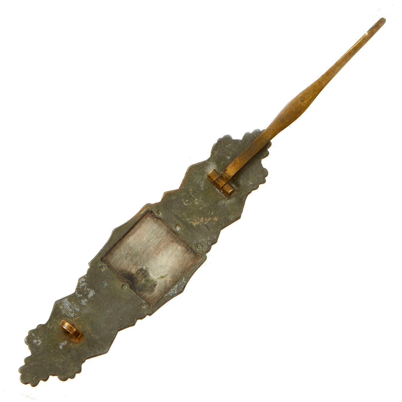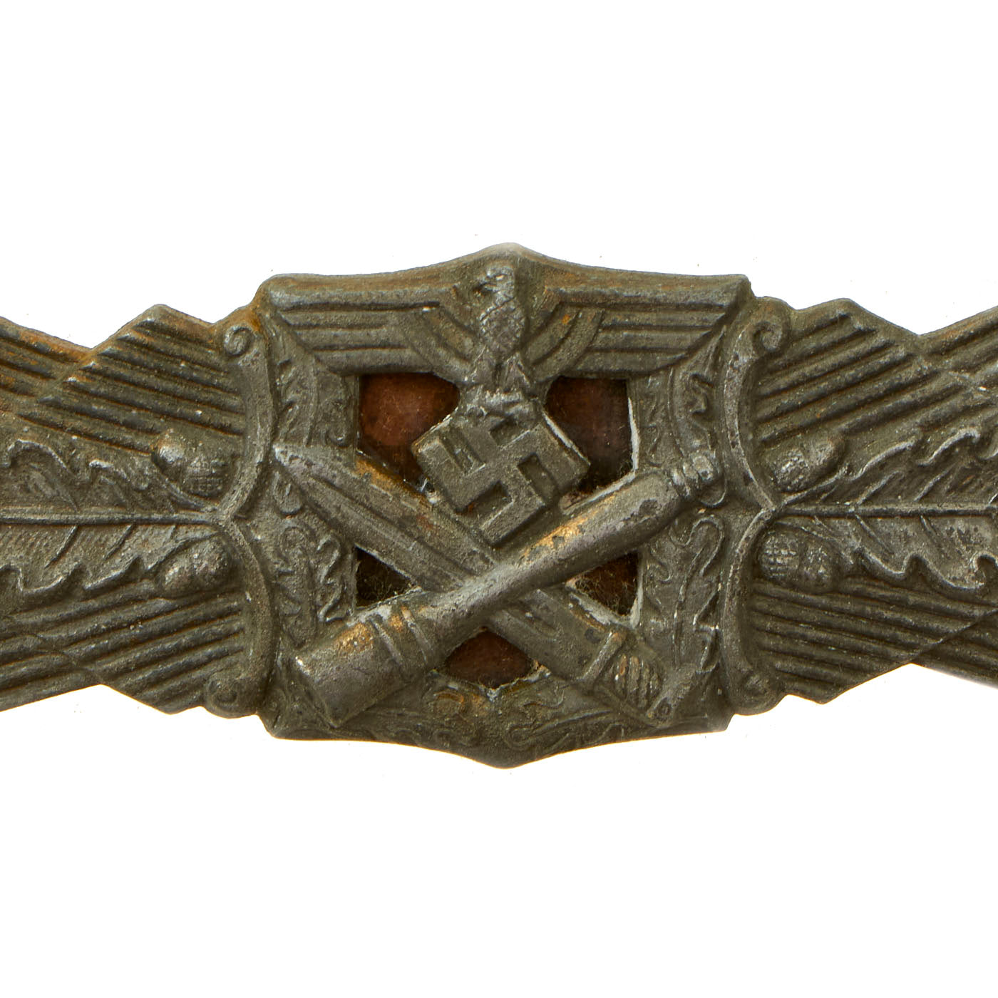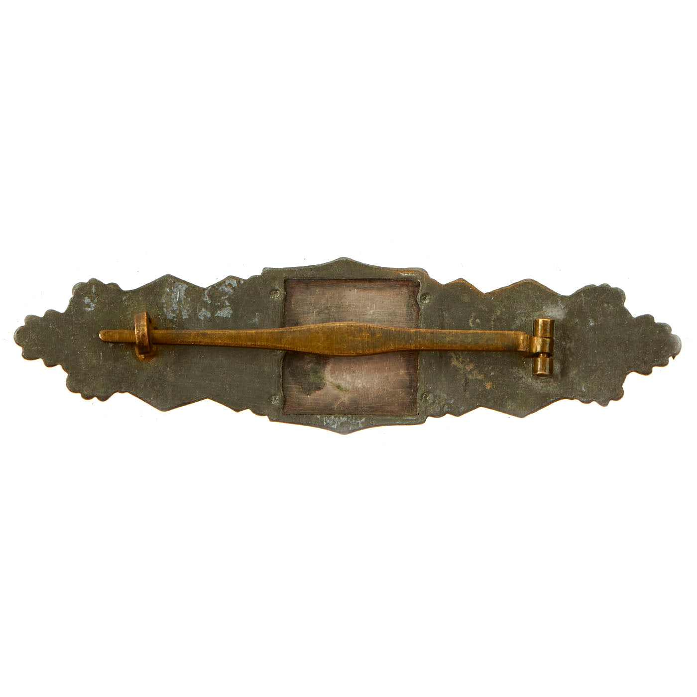 Original Item: Only One Available. Known in German as a Nahrkampfspange (Melee Clasp) in Bronze, this fine award is constructed of bronzed slightly vaulted zinc. The front side has a Reichsadler (national eagle) over a crossed bayonet and hand grenade in the centerpiece. There are sun rays emanating from the center of the left and right sides, with with four oak leaves and two acorns on each side. The reverse is plain, with a square magnetic backing plate with horizontal pin back, with a barrel hinge and a flat wire catch on the reverse.