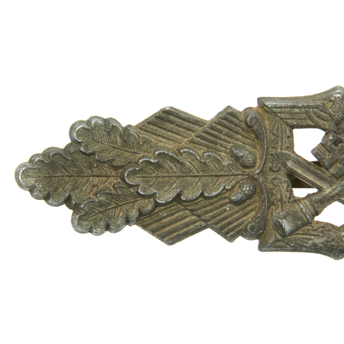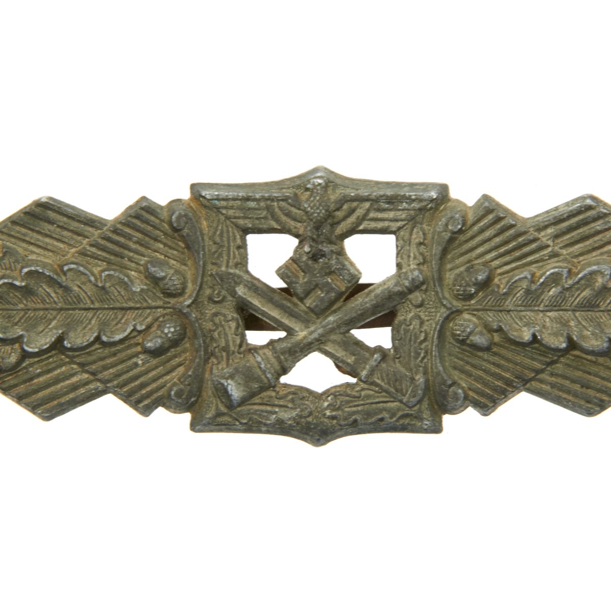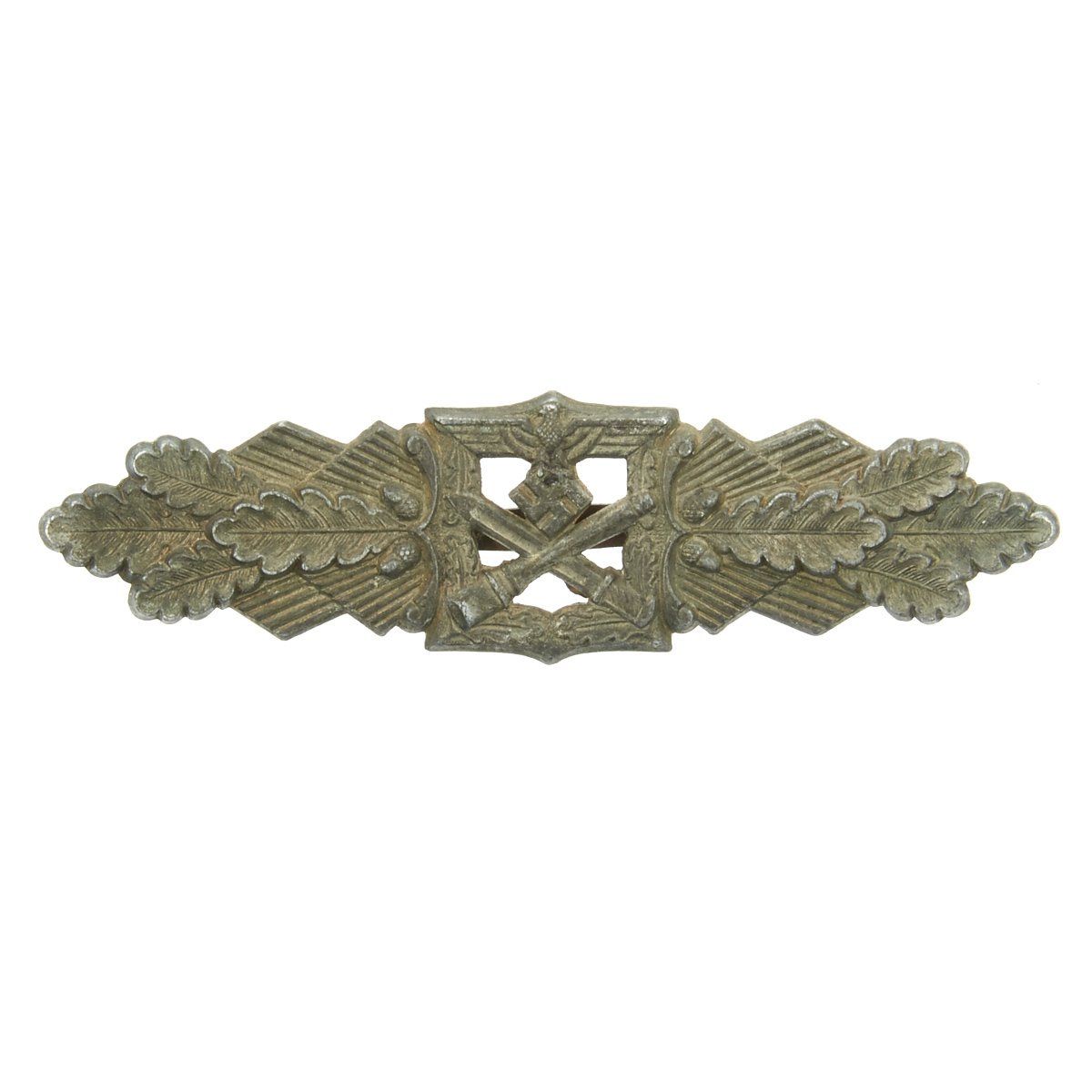 Original Item: Only One Available. Known in German as a Nahrkampfspange in Silver this fine award is constructed of silvered zink. The obverse with a national eagle and a bayonet and hand grenade in the centerpiece, with sun rays emanating from the center of the left and right sides, and with four oak leaves and two acorns on each side, the reverse plain, with a square non-magnetic backing plate horizontal pin back with a barrel hinge and a flat wire catch on the reverse. Not visible maker mark. Measures 3.85 inches (97.85 mm) W x 1.04 inches (26.50 mm) H. Offered in overall good condition.