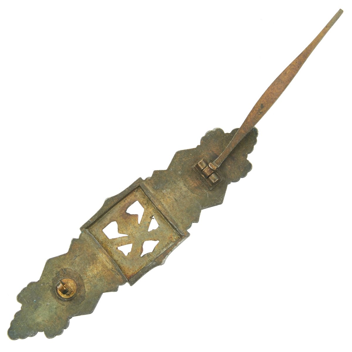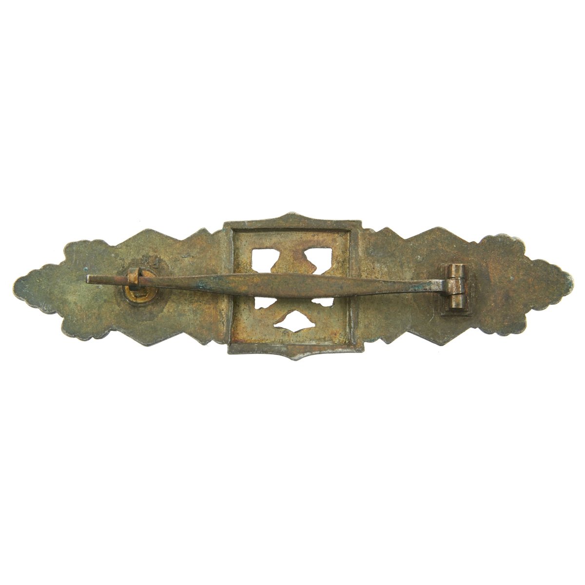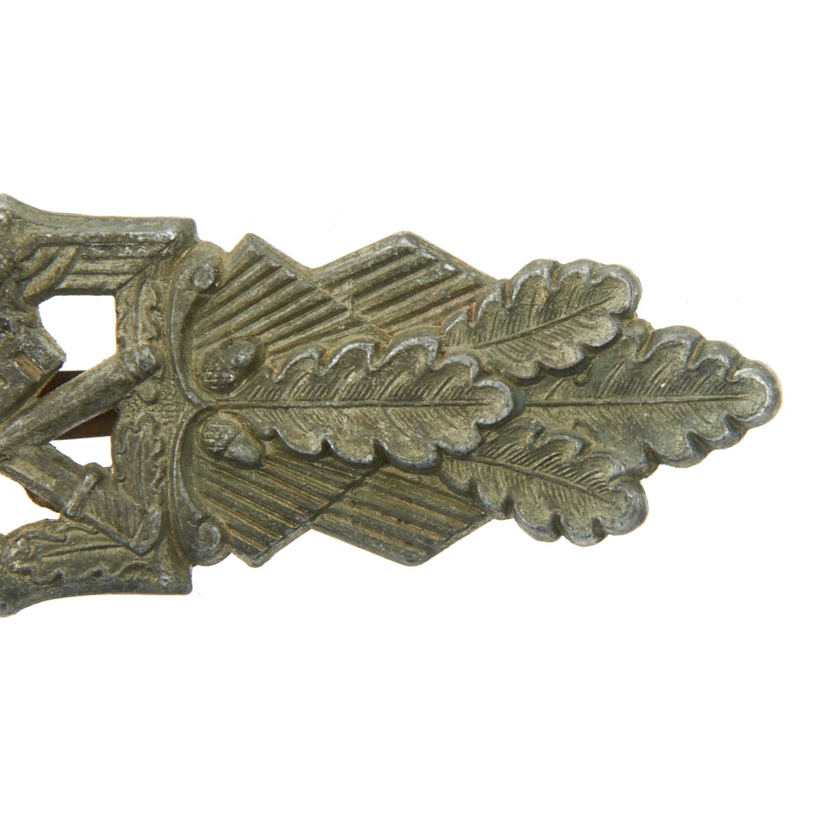 Original Item: Only One Available. Known in German as a Nahrkampfspange in Silver this fine award is constructed of silvered zink. The obverse with a national eagle and a bayonet and hand grenade in the centerpiece, with sun rays emanating from the center of the left and right sides, and with four oak leaves and two acorns on each side, the reverse plain, with a square non-magnetic backing plate horizontal pin back with a barrel hinge and a flat wire catch on the reverse. Not visible maker mark. Measures 3.85 inches (97.85 mm) W x 1.04 inches (26.50 mm) H. Offered in overall good condition.
