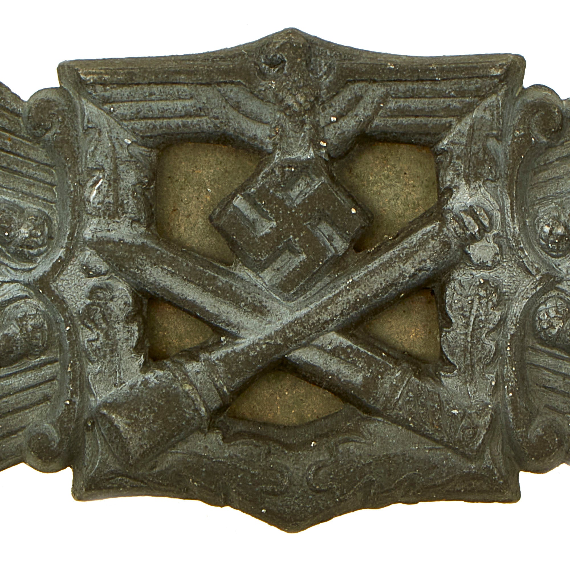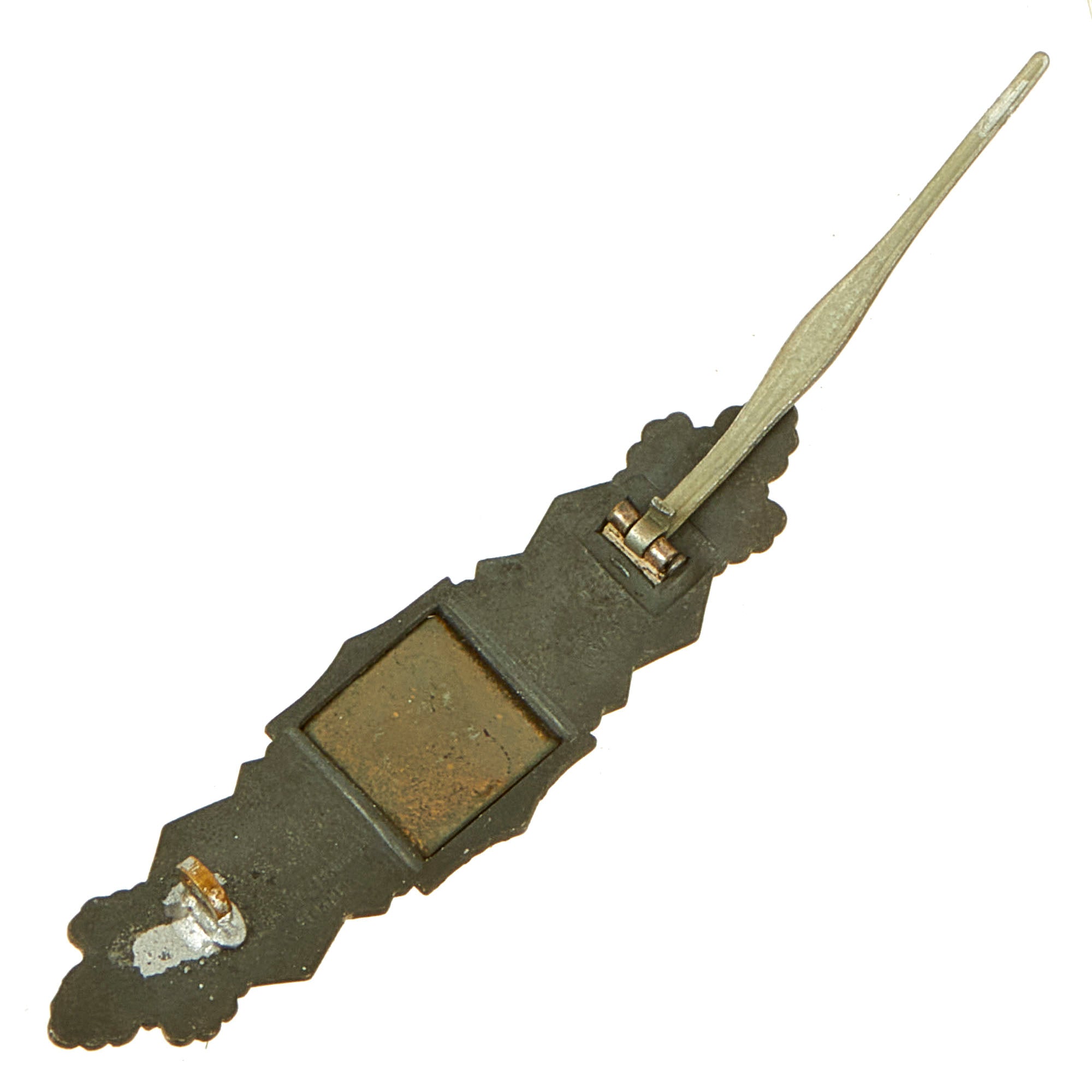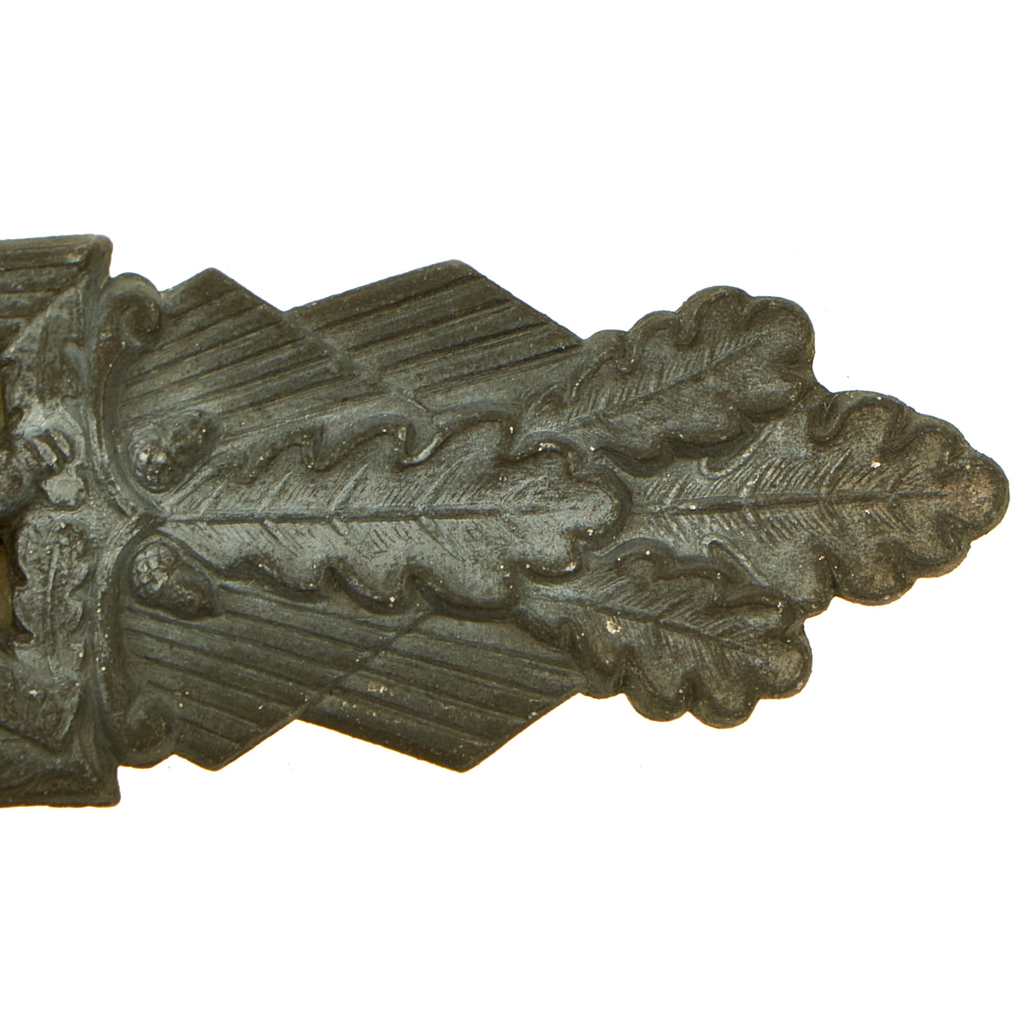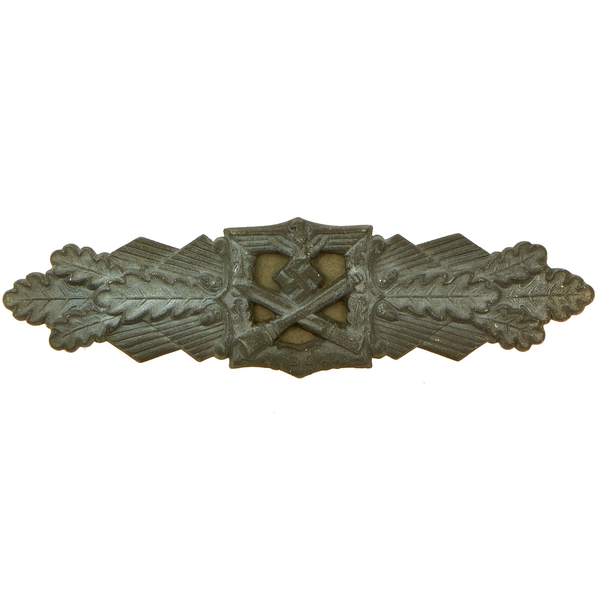 Original Item: Only One Available. Known in German as a Nahkampfspange (Melee Clasp) in Silber, this fine award is constructed of silvered slightly vaulted zinc. The front side has a Reichsadler (national eagle) over a crossed bayonet and hand grenade in the centerpiece. There are sun rays emanating from the center of the left and right sides, with with four oak leaves and two acorns on each side. The reverse is plain, with a square magnetic backing plate with horizontal pin back, with a barrel hinge and a flat wire catch on the reverse.
