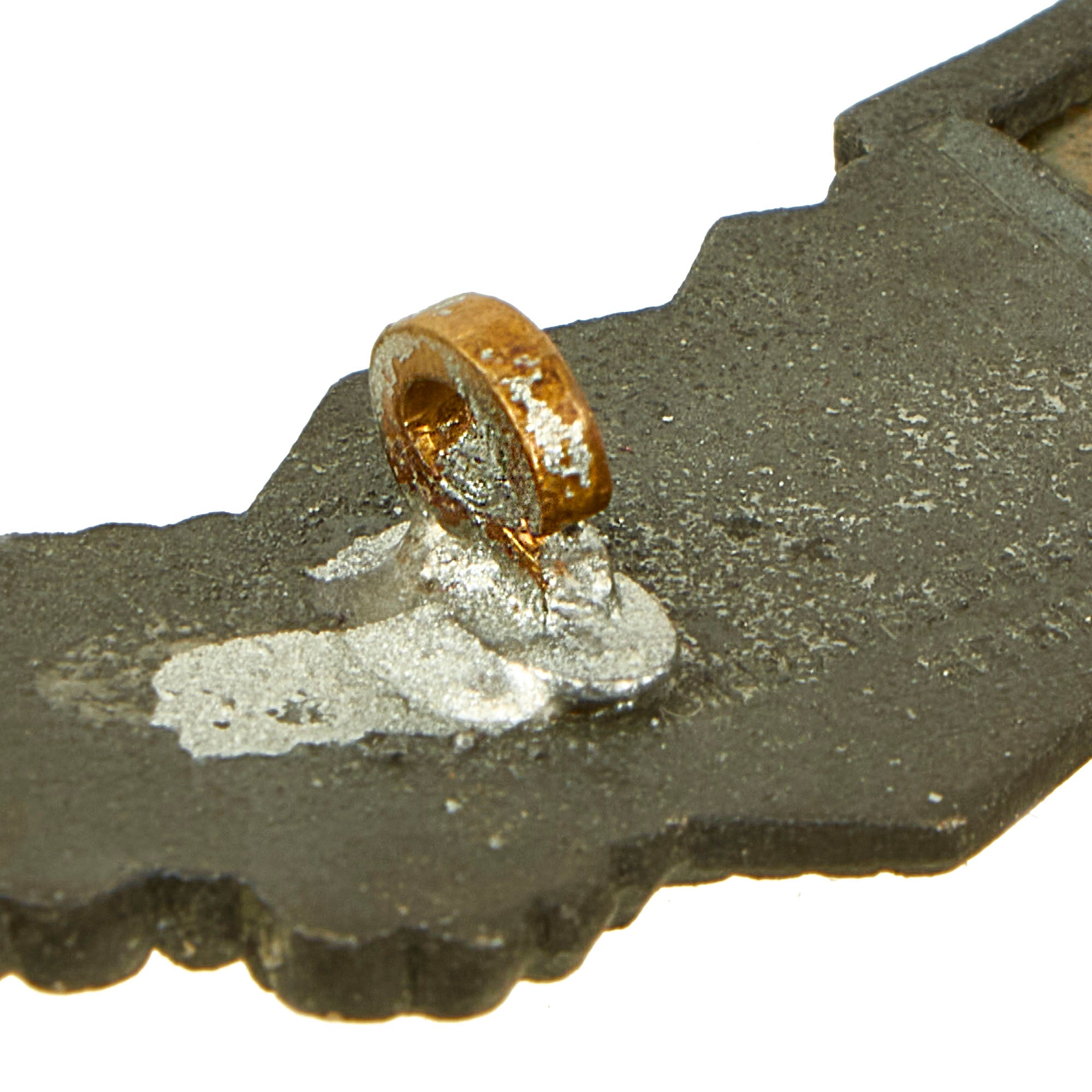 The badge is offered in overall very good condition. As with most we see, the silvering on the zinc body has almost completely oxidized and/or worn away. Only the rear pin still shows strong silvering, with some around the pin catch.