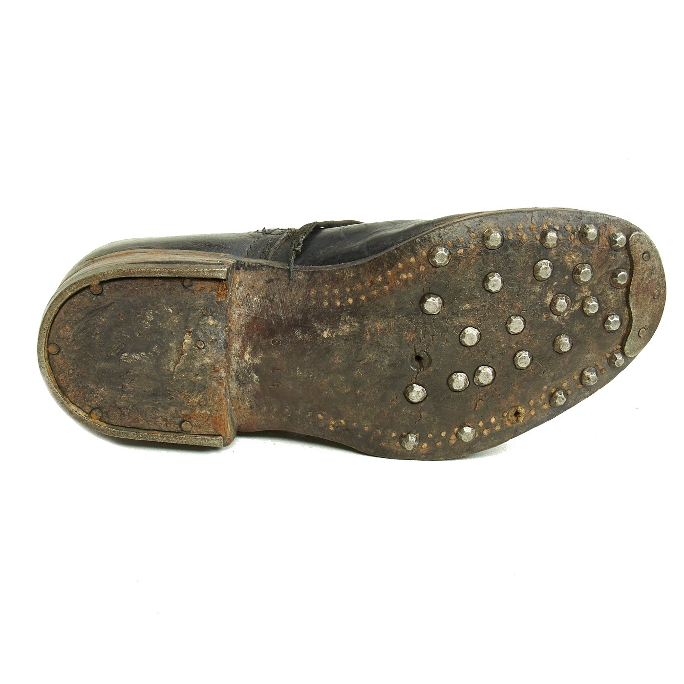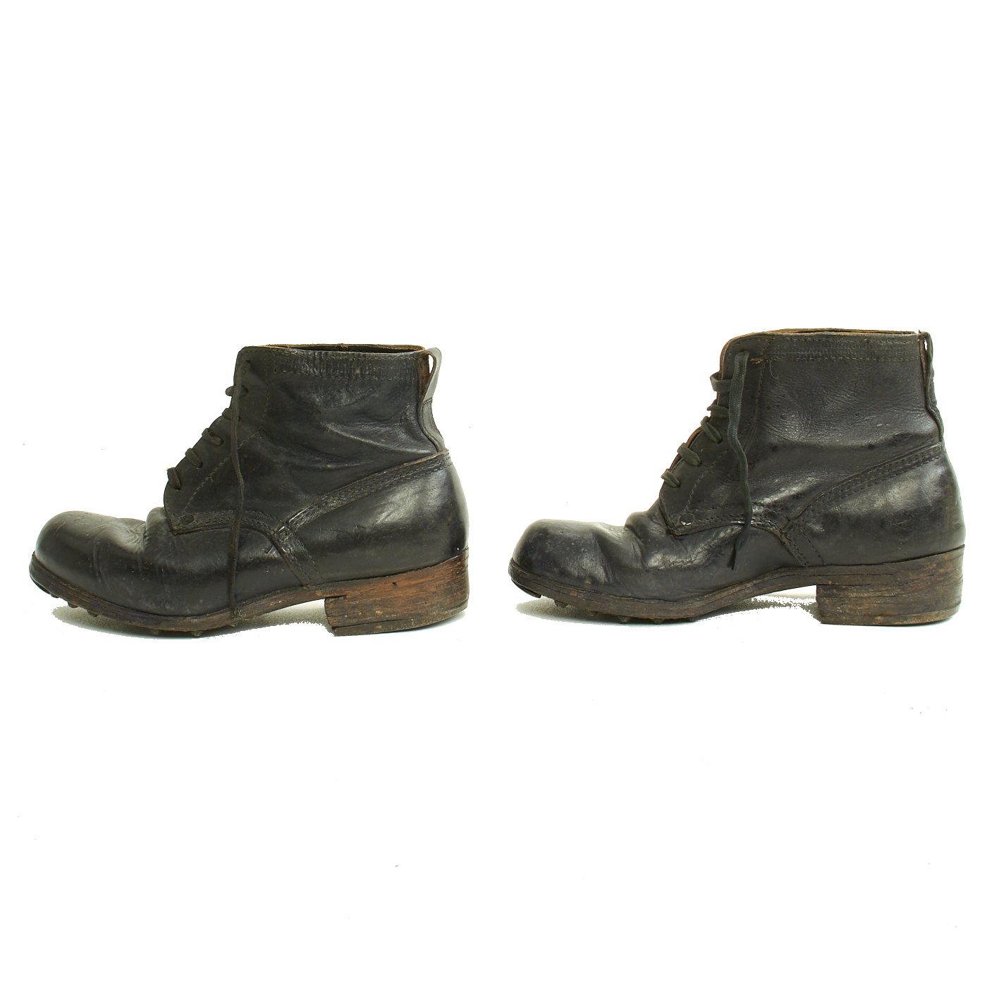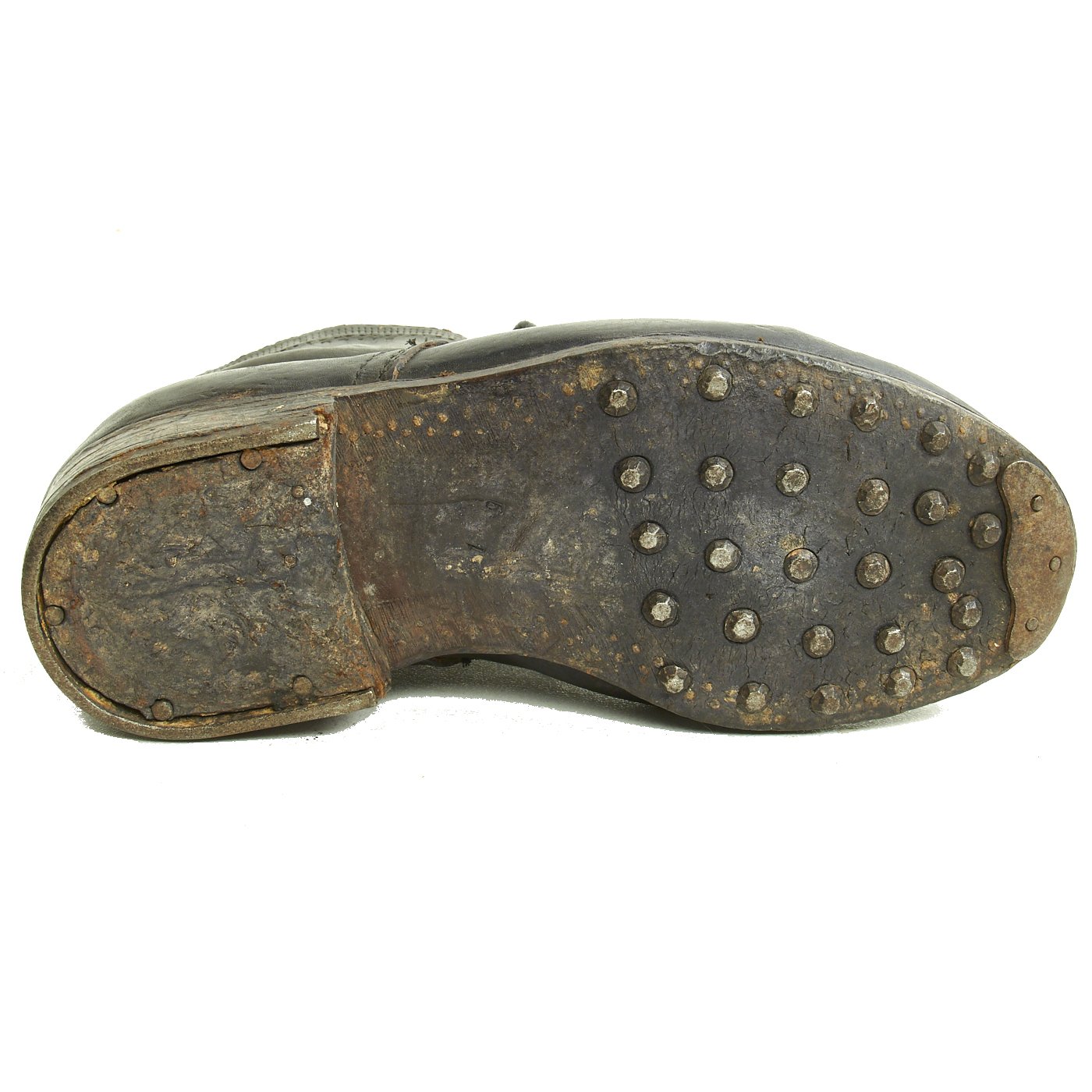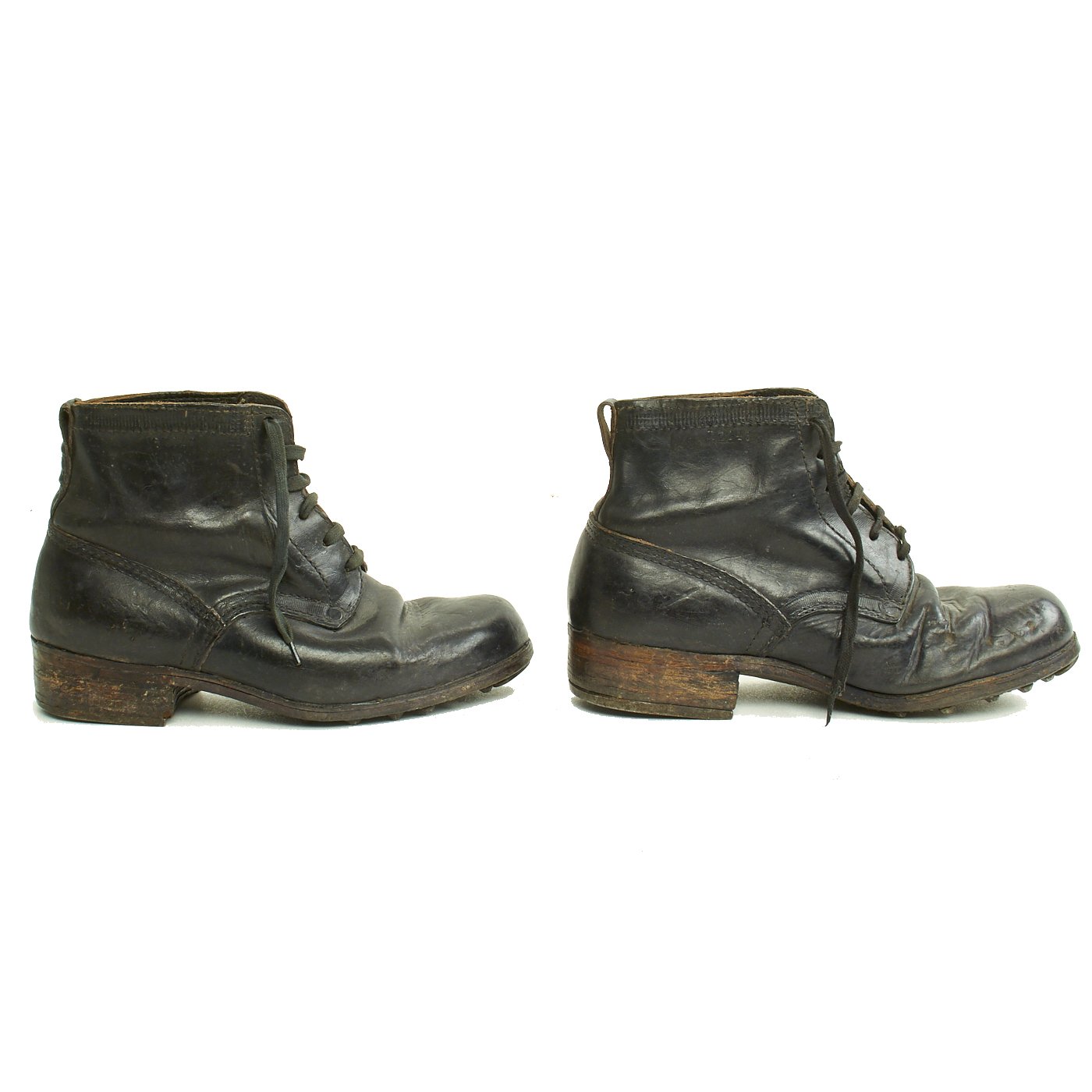 Original Items: Only One Set Available. These are fantastic German World War Two infantry black leather 1/4 or "low" combat boots with hobnails and heel irons in size 41cm (US 7). Both are offered in god but used and worn condition. Also included are an original set of leggings known as Gamaschen constructed of canvas and leather offered in excellent condition.