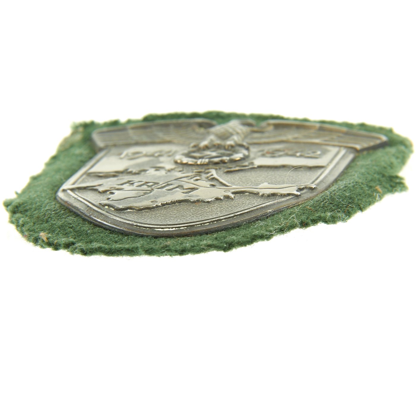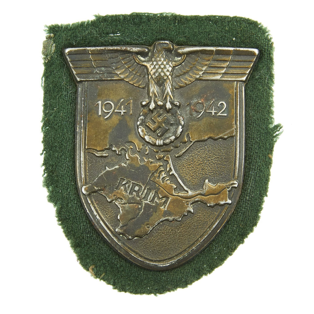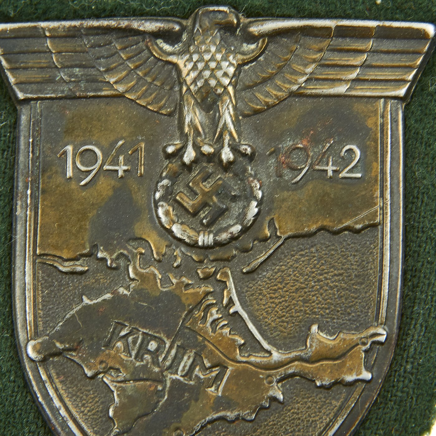 The shield is headed by the German eagle clutching a laurel wreath surrounding a swas. Flanking the eagle are the dates 1941 and 1942, which represent the start and end dates of the campaign. This sits on the backdrop of the Crimean peninsula, where the fighting took place, which has the word KRIM stamped across it.