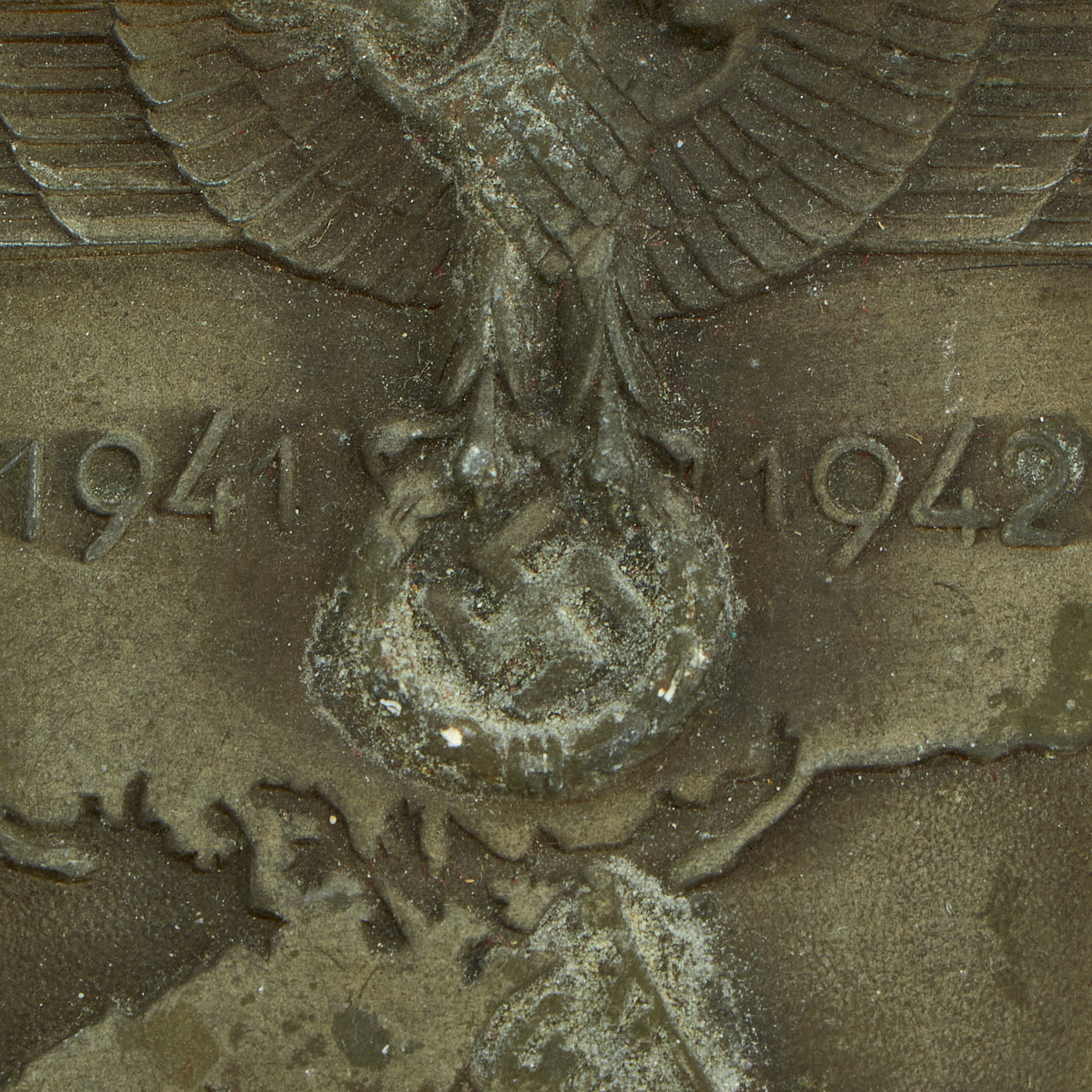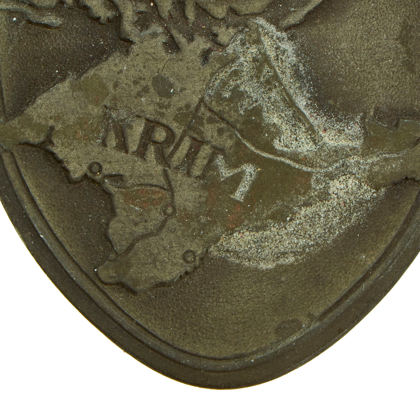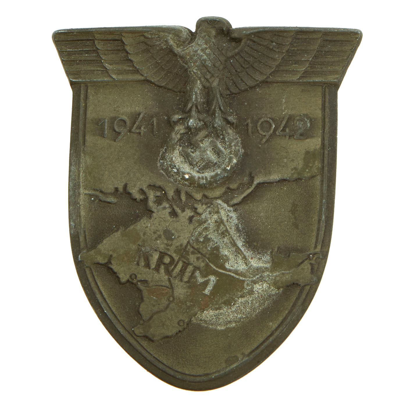 The shield is headed by the German eagle clutching a laurel wreath surrounding a swas. Flanking the eagle are the dates 1941 and 1942, which represent the start and end dates of the campaign. This sits on the backdrop of the Crimean peninsula, where the fighting took place, which has the word KRIM stamped across it.