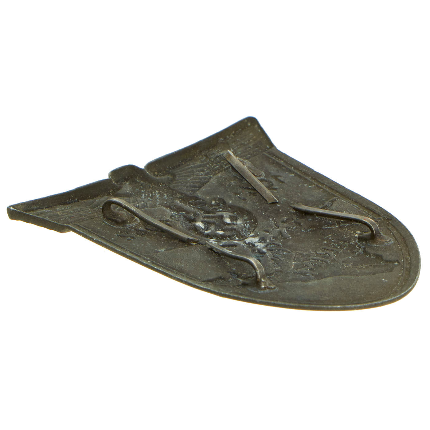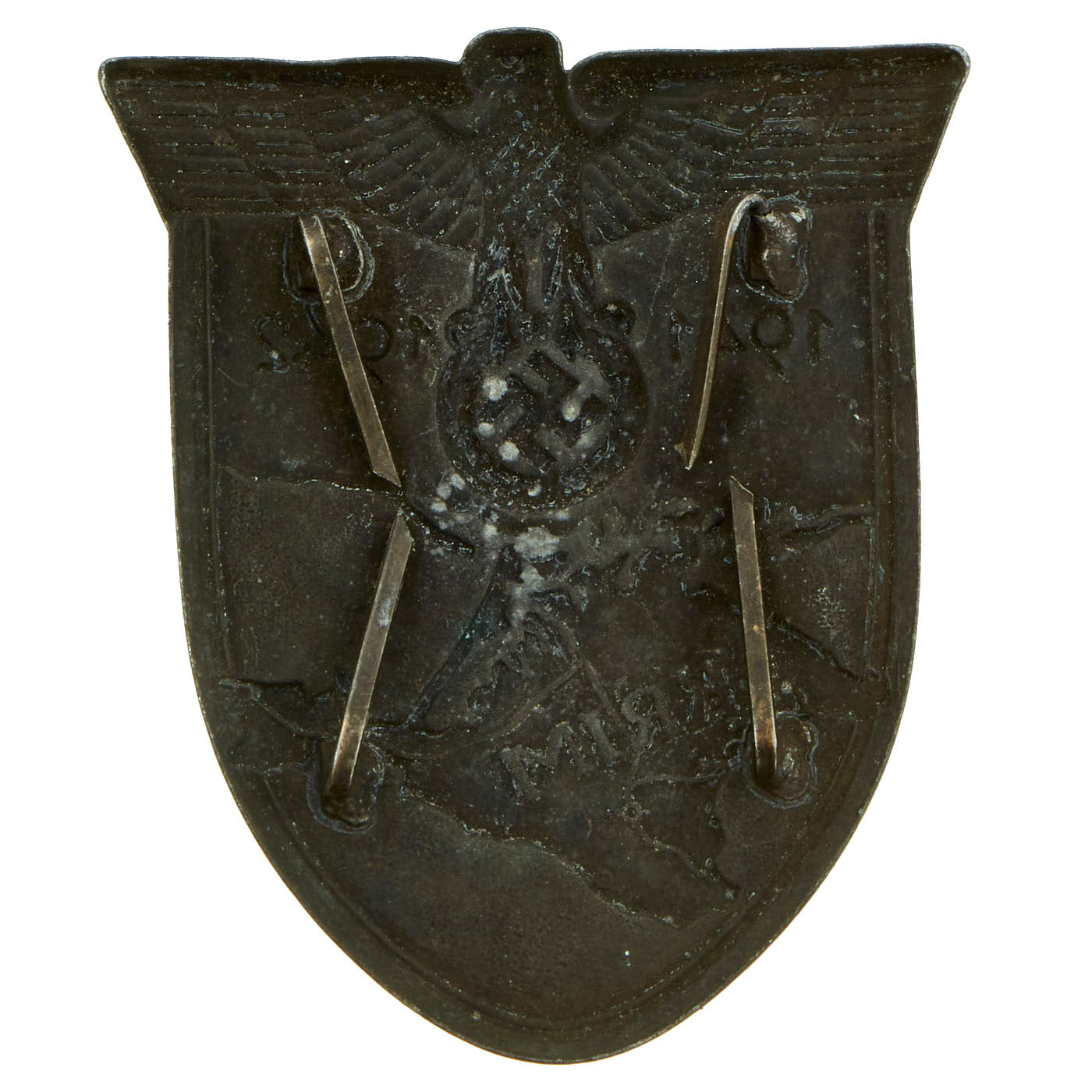 Original Item: Only One Available. This is a nice example of a German Krimschild metal shield award, which has been removed from a uniform, so at present there is no fabric included. The shield is in very good shape, and looks to be made of blacked brass with steel hooks on the back. It retains the finish very well, and has a lovely patina with just a bit of oxidation. The backing plate is missing, however all four of the retaining clips are still present. This is a very nice example with loads of patina! Ready to display.