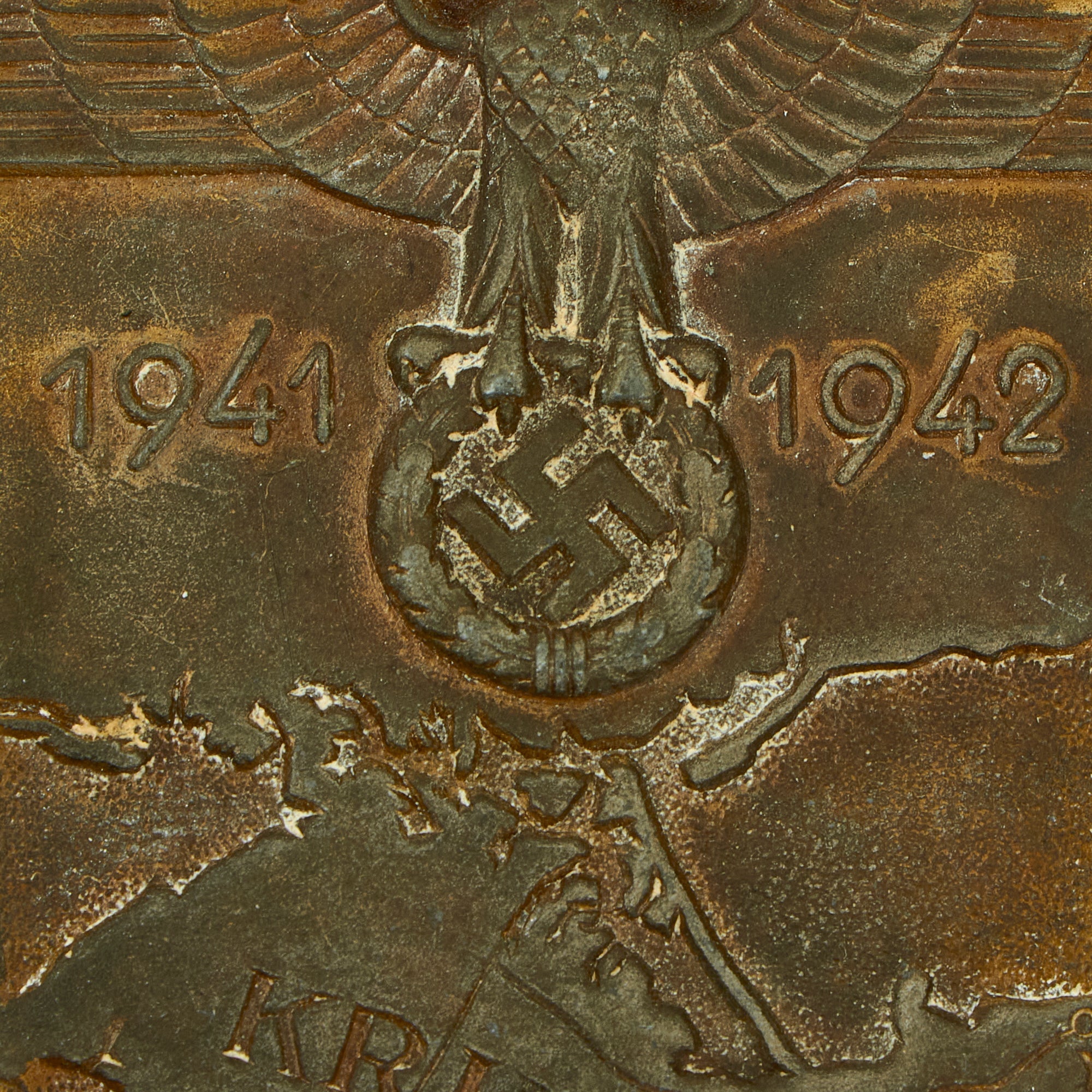 The shield is headed by the German eagle clutching a laurel wreath surrounding a swas. Flanking the eagle are the dates 1941 and 1942, which represent the start and end dates of the campaign. This sits on the backdrop of the Crimean peninsula, where the fighting took place, which has the word KRIM stamped across it.