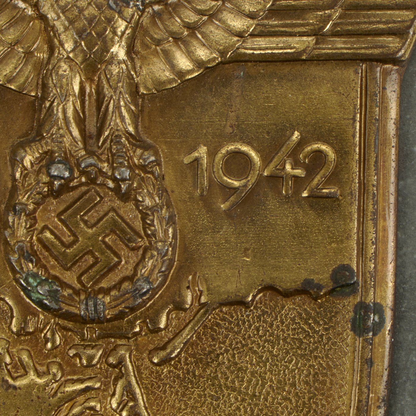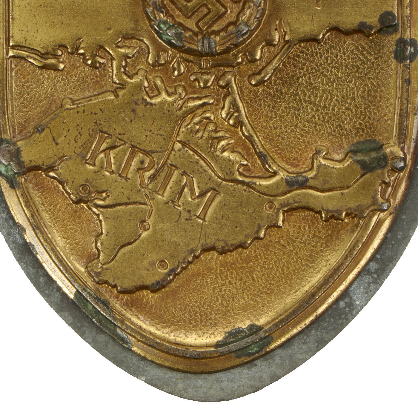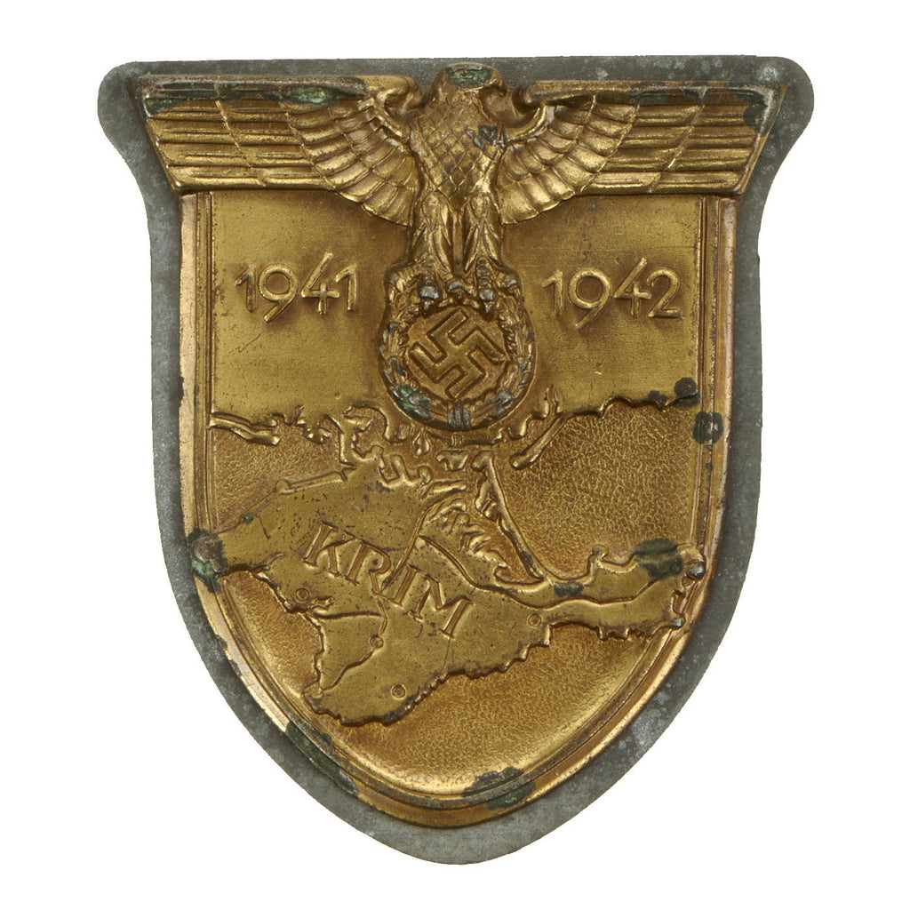 The shield is headed by the German eagle clutching a laurel wreath surrounding a swas. Flanking the eagle are the dates 1941 and 1942, which represent the start and end dates of the campaign. This sits on the backdrop of the Crimean peninsula, where the fighting took place, which has the word KRIM stamped across it.