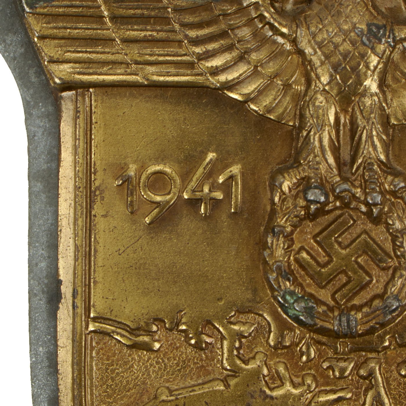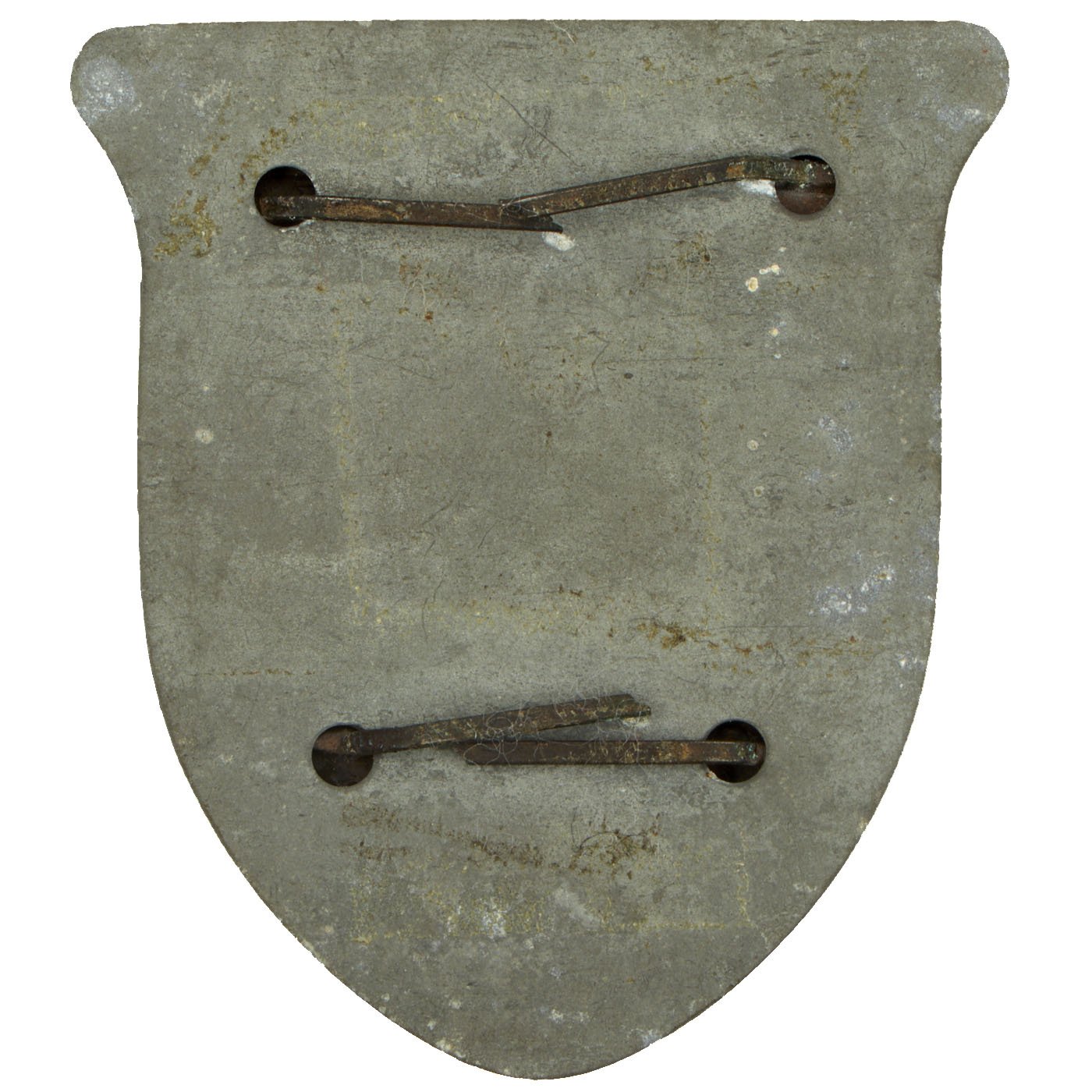 Original Item: Only One Available. This is a very nice example of a German Krimschild metal shield award, which has been removed from a uniform, so at present there is no fabric included. The shield is in very good condition, with just a bit of degradation to the brass plating over the steel. The back plate is included, and all four of the securing clips are still intact, something we do not often see with used examples. This is a great example with just a bit of patina! Ready to display.