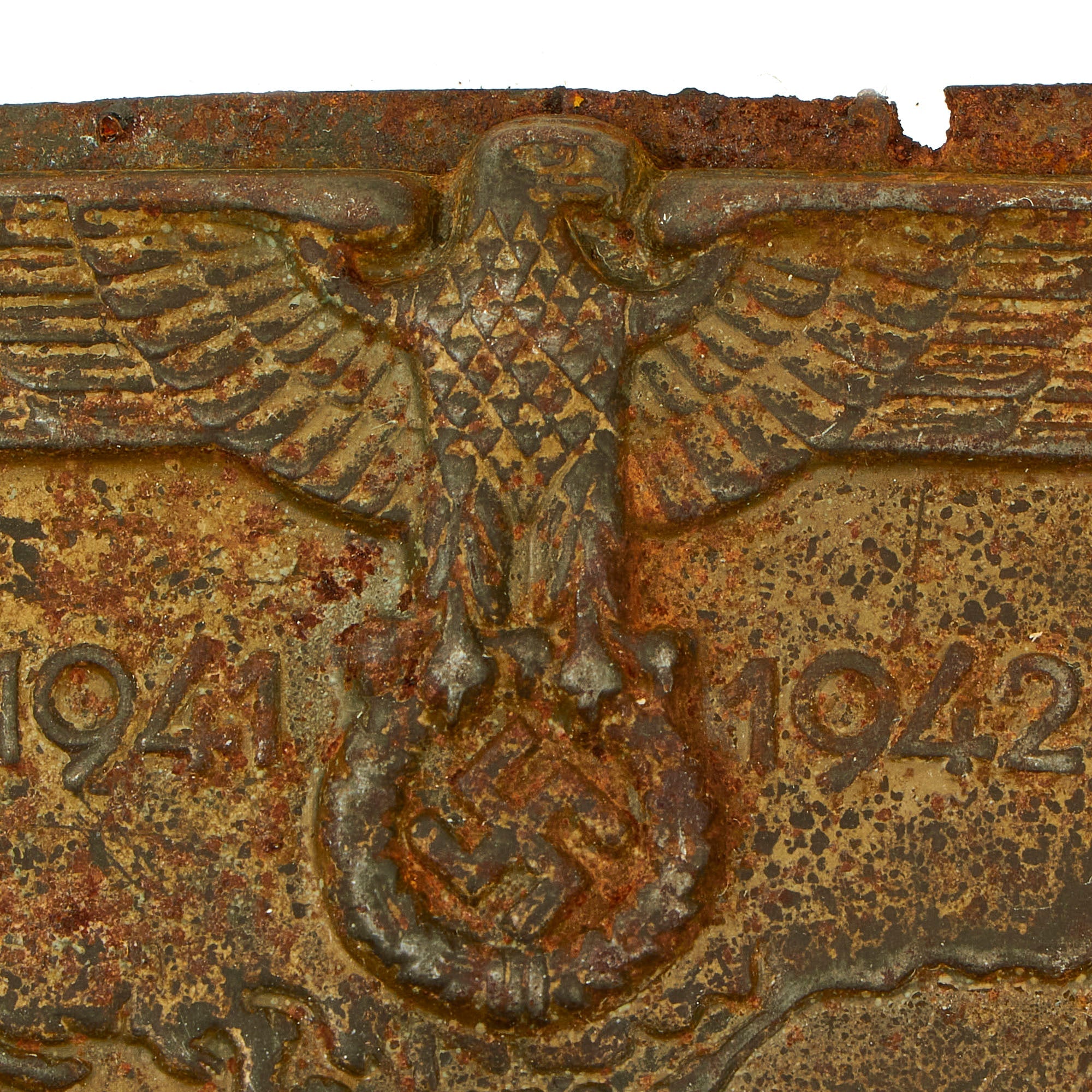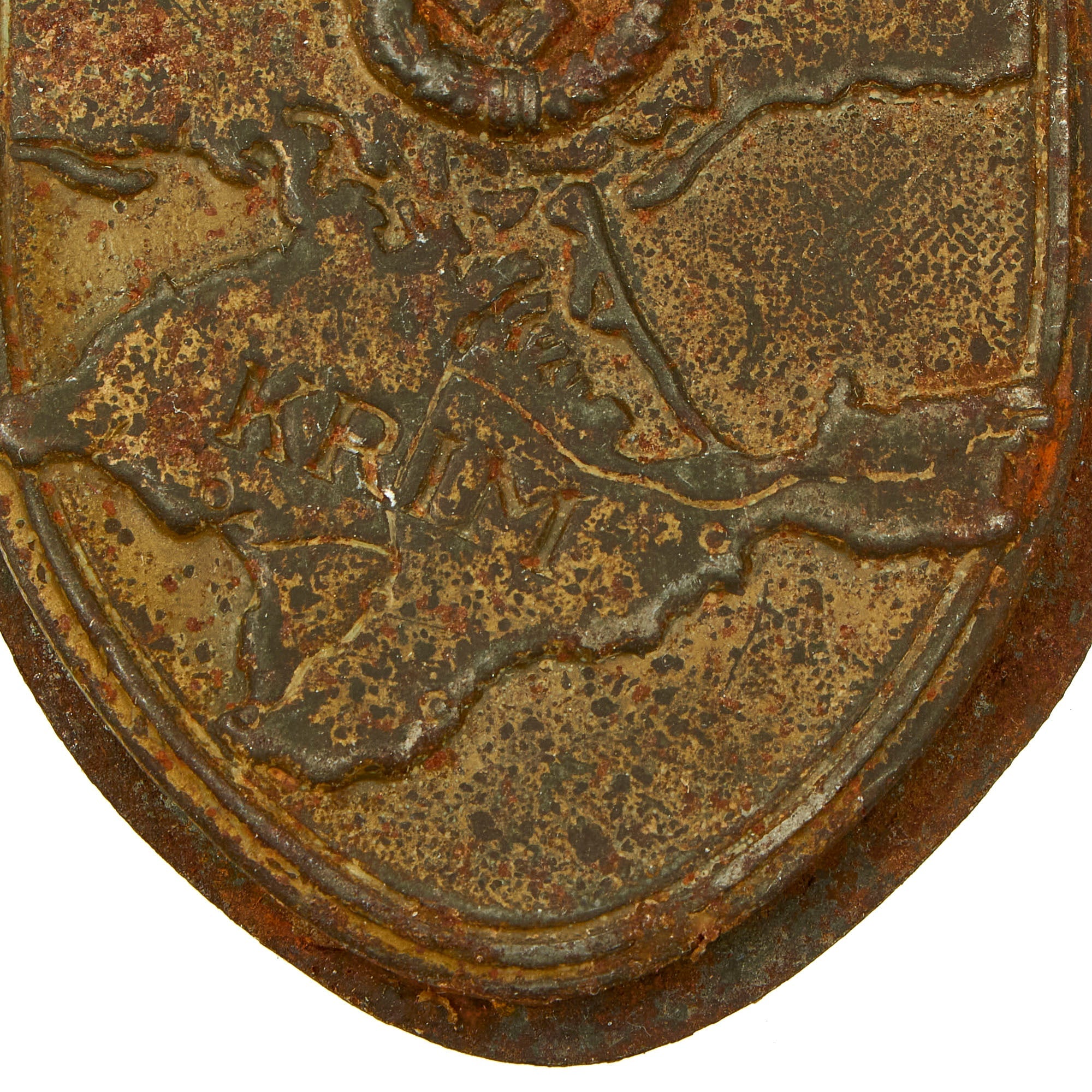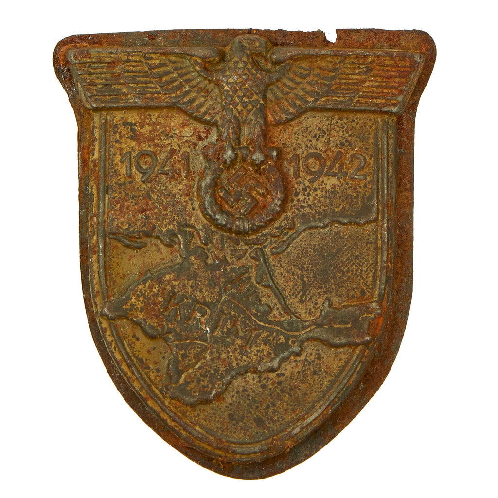 The shield is headed by the German eagle clutching a laurel wreath surrounding a swas. Flanking the eagle are the dates 1941 and 1942, which represent the start and end dates of the campaign. This sits on the backdrop of the Crimean peninsula, where the fighting took place, which has the word KRIM stamped across it.