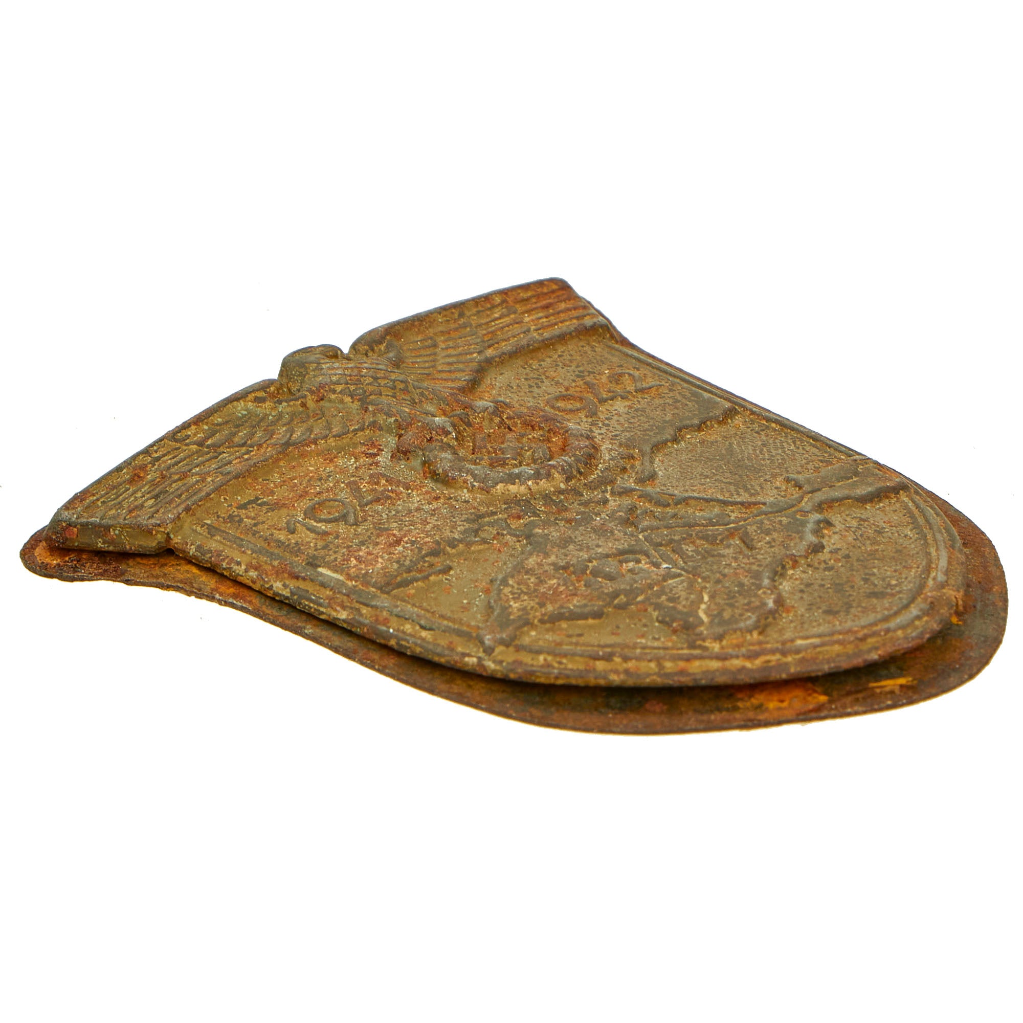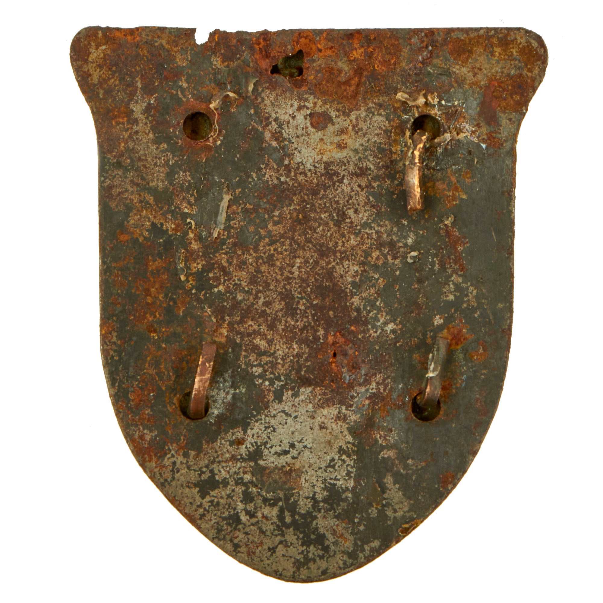 Original Item: Only One Available. This is a nice service used example of a German Krimschild metal shield award, which has been removed from a uniform, so at present there is no fabric included. The shield is in good shape, with all the detail still present, though the plating on the front has partly worn away, showing some light oxidation in areas. It is made from steel with brass clips, and really has a great aged look. The metal backing plate is present, but oxidized, and three of four clips are still present.