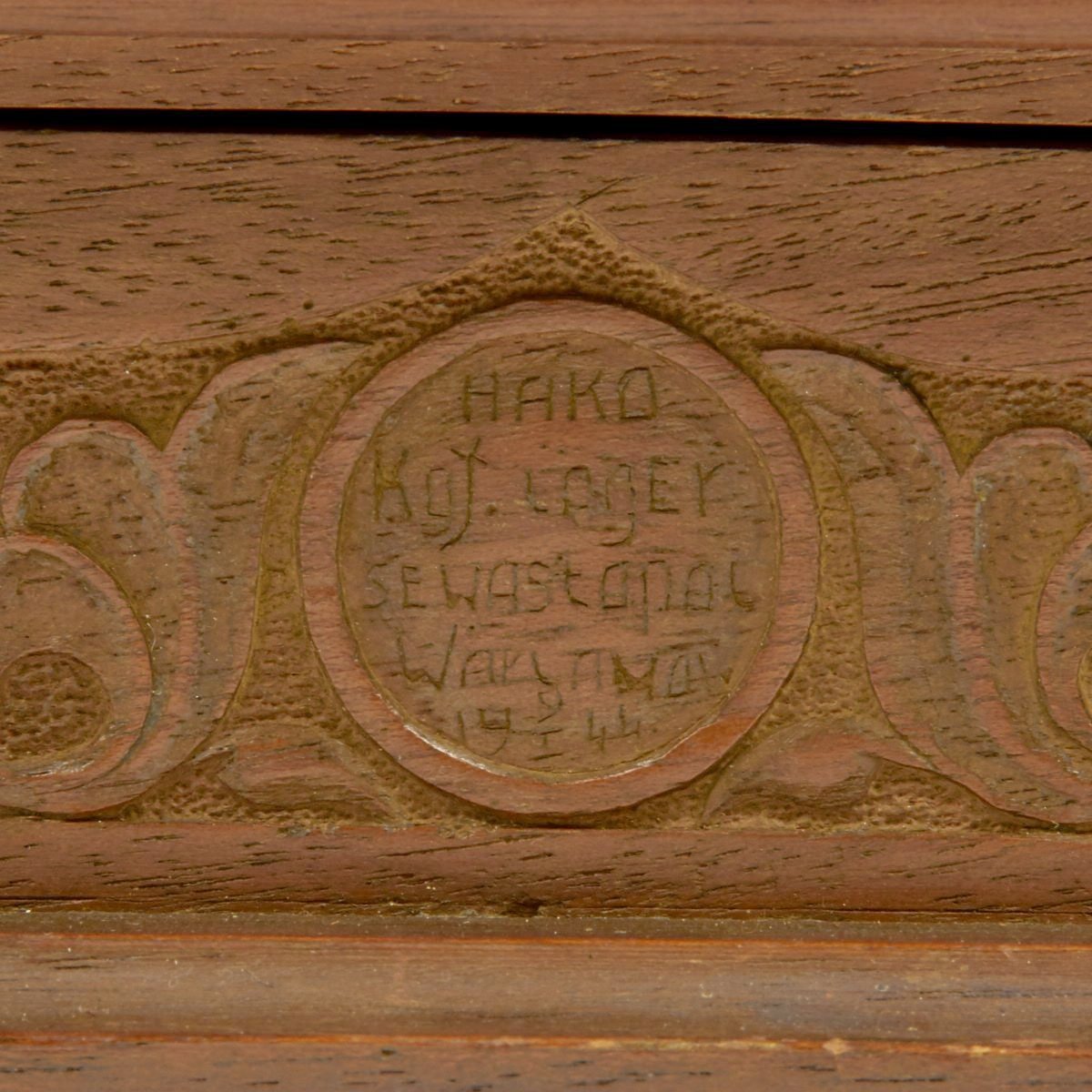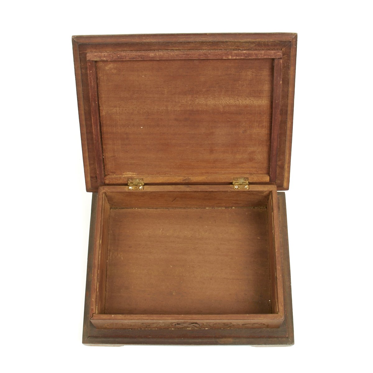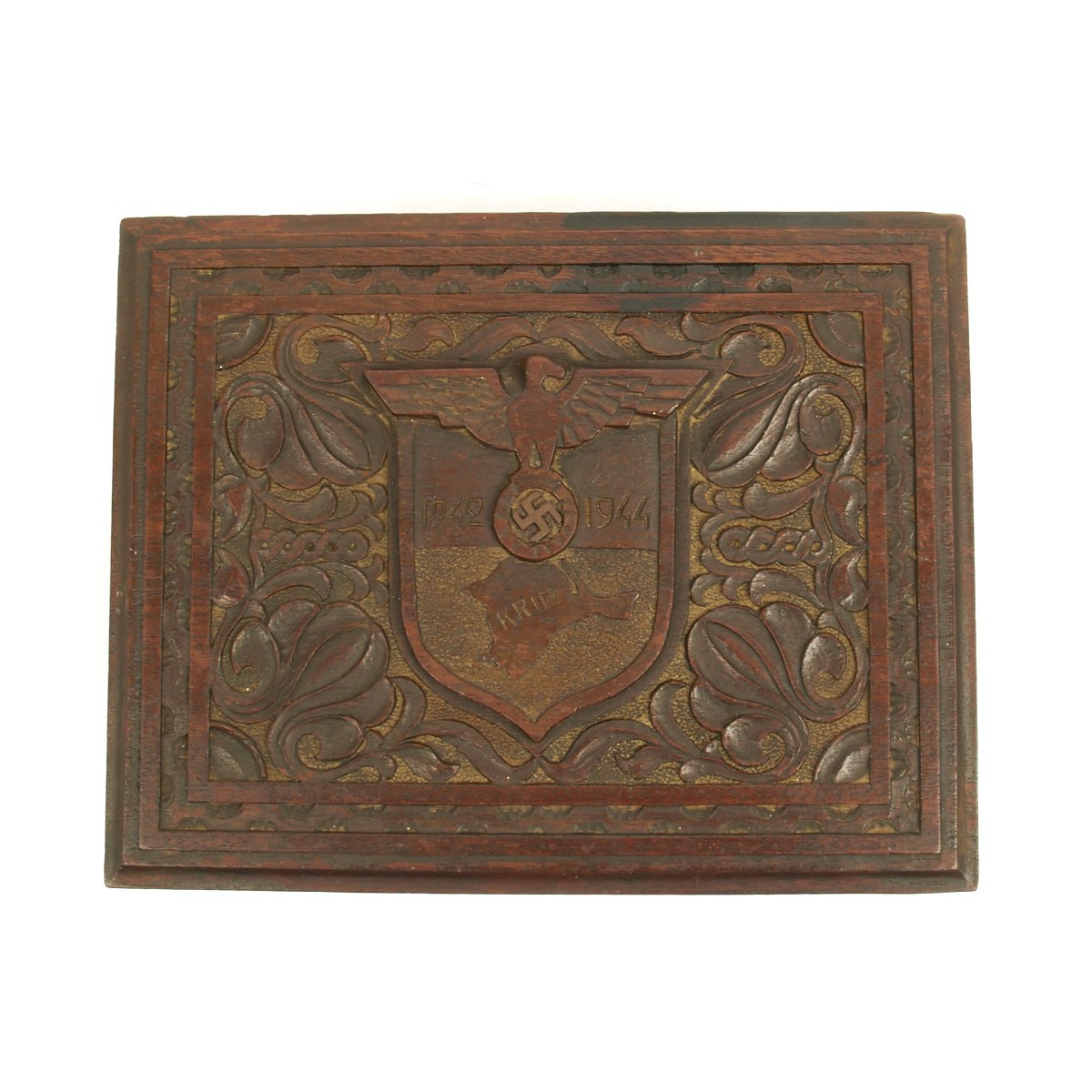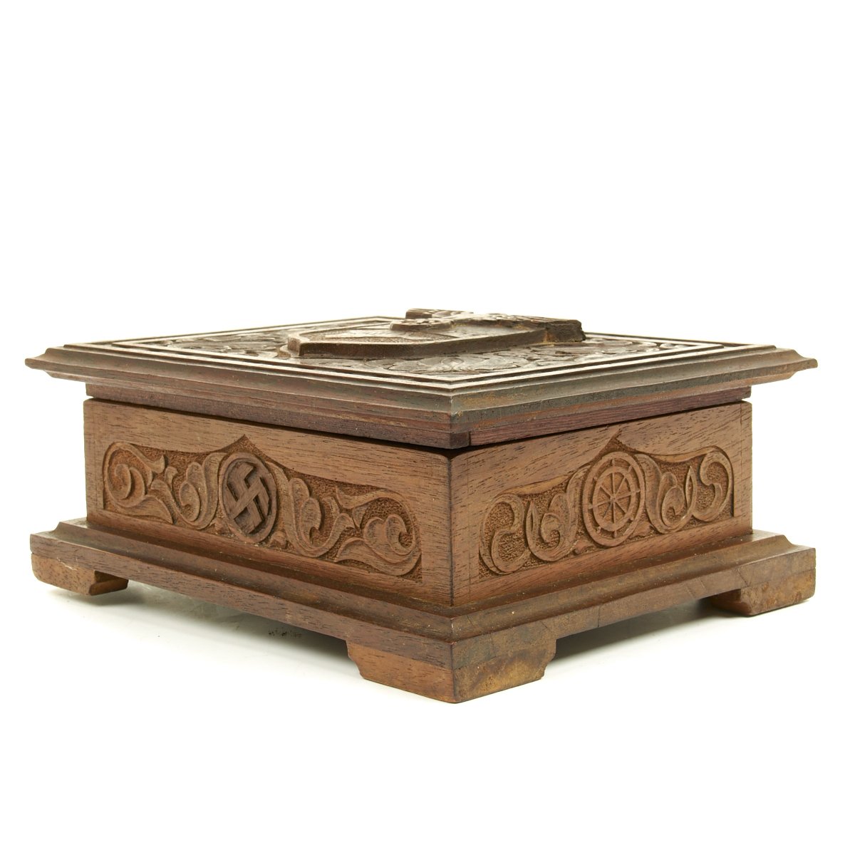 Original Items: Only One Available. This is a fantastic handmade custom wartime wood cigar box that featured the KRIM shield with Swas on top and the dates 1942 - 1944. The box measures 9" wide x 7" deep x 3" high. On the front side is another swas but on the reverse side is inscribed in the central medallion area what appears to read: