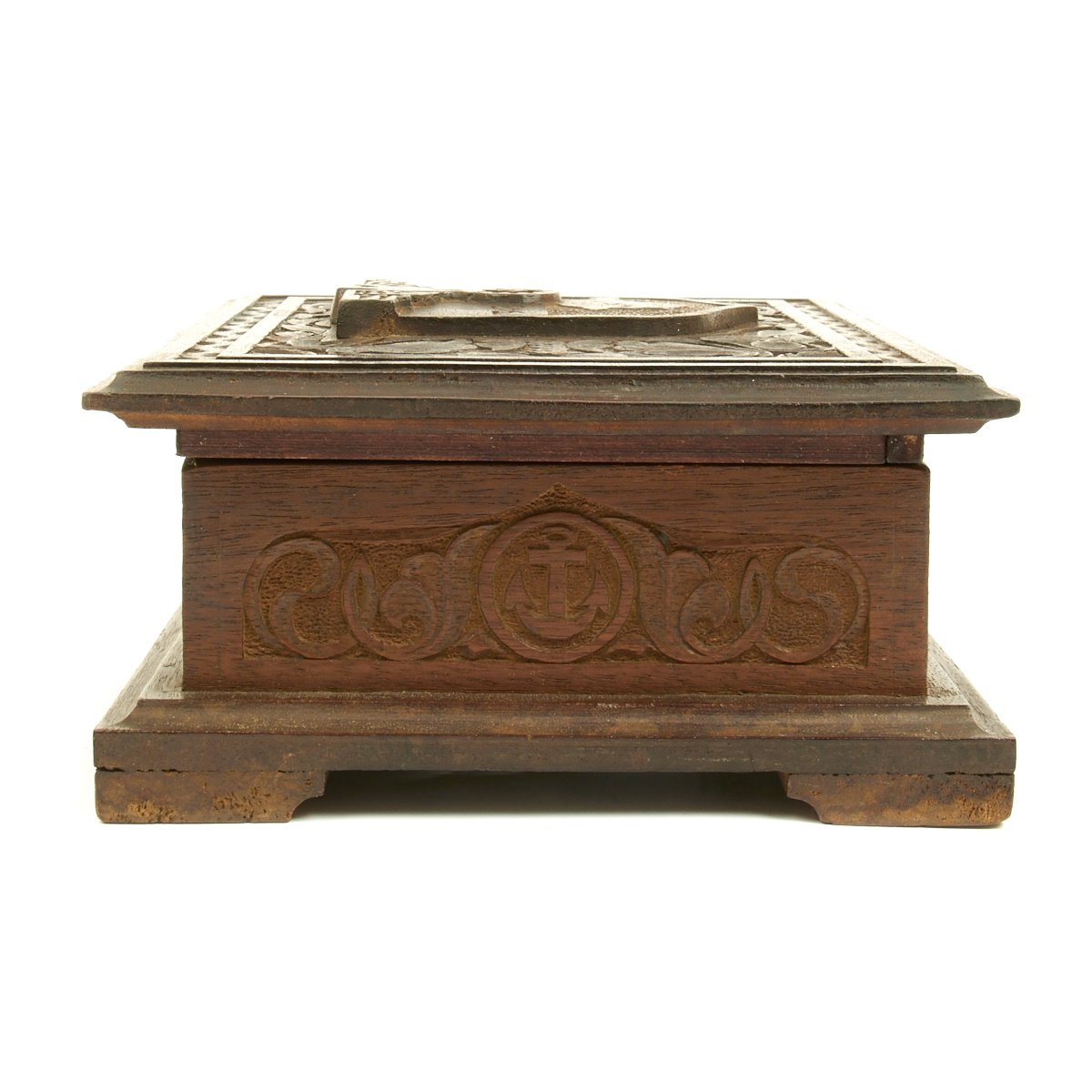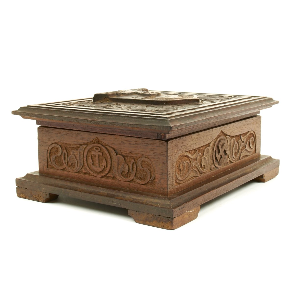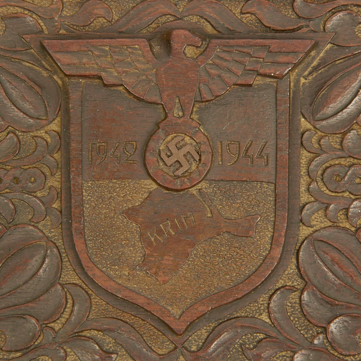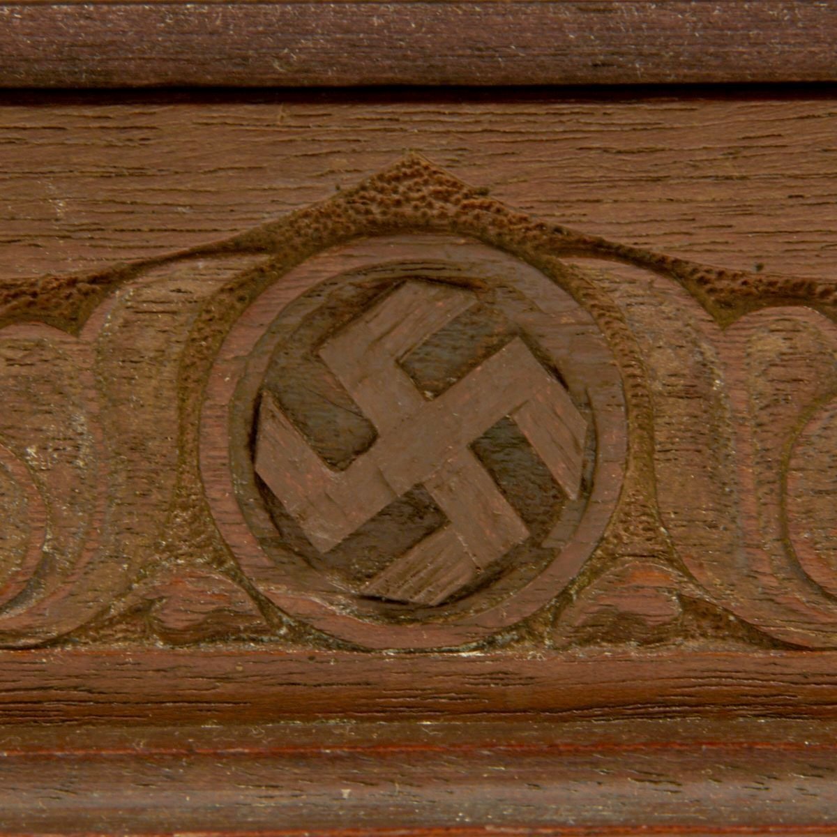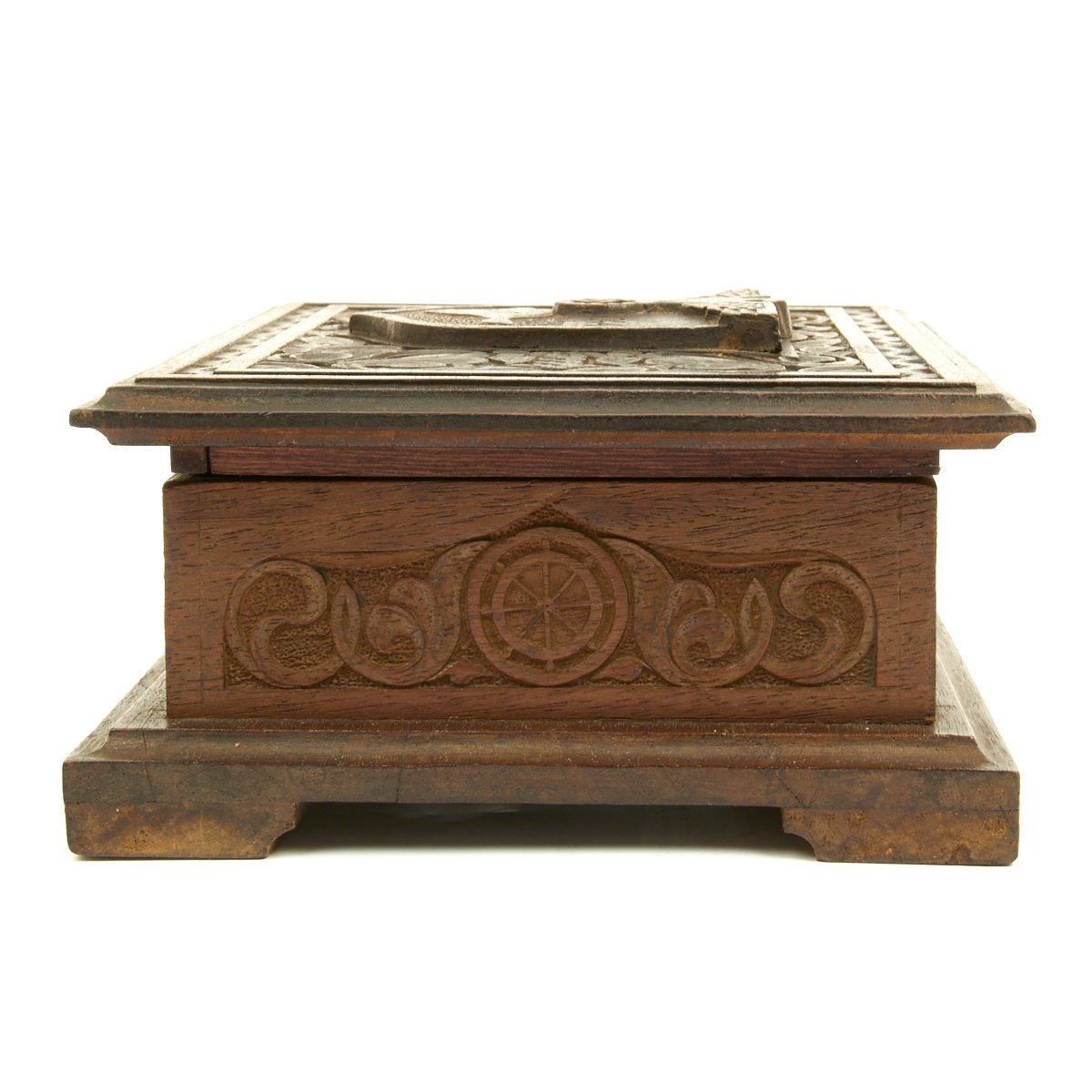 Original Items: Only One Available. This is a fantastic handmade custom wartime wood cigar box that featured the KRIM shield with Swas on top and the dates 1942 - 1944. The box measures 9" wide x 7" deep x 3" high. On the front side is another swas but on the reverse side is inscribed in the central medallion area what appears to read: