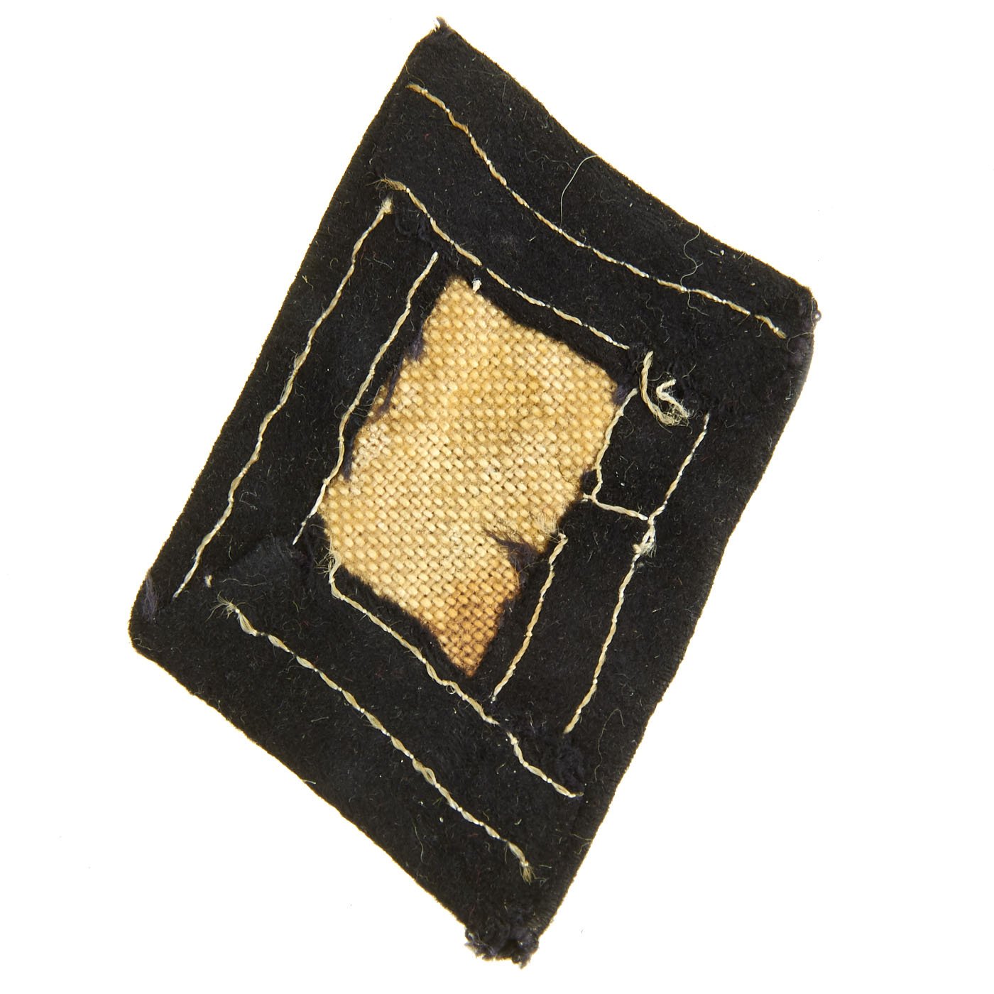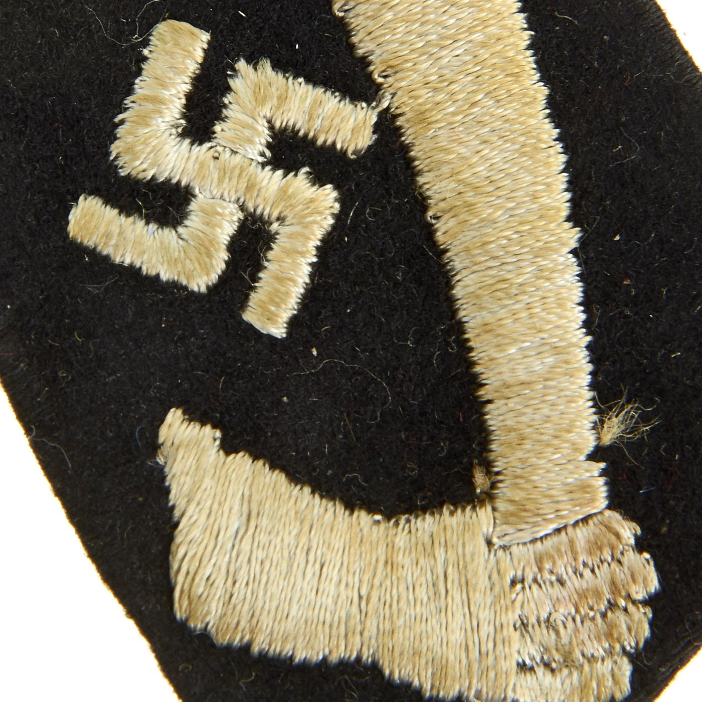 Original Item: Only One Available. Here we have a very nice right side Collar Tab, used by the 13th Waffen Mountain Division of the SS "Handschar" (1st Croatian). The tab measures approximately 2 3/4" x 2 1/4". Known as Kragenpatte in German, these were attached to the collars to indicate the rank and branch of the wearer. This example shows a Swas (Swas), next to a hand holding a sword, and is made of black fabric with silver/white thread and an internal lacquered buckram fabric stiffener. We have heard that this particular type of diamond was made at CC Camp, and many were recovered at the end of the war. There is however no concrete evidence regarding this.