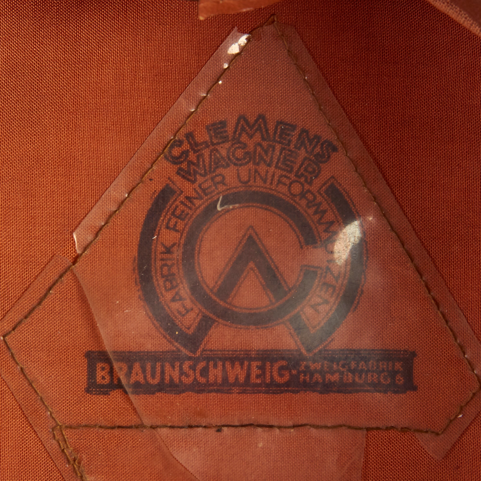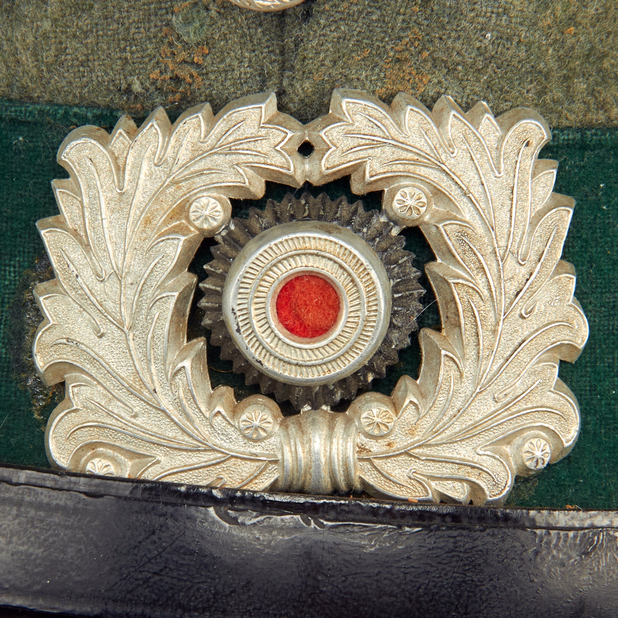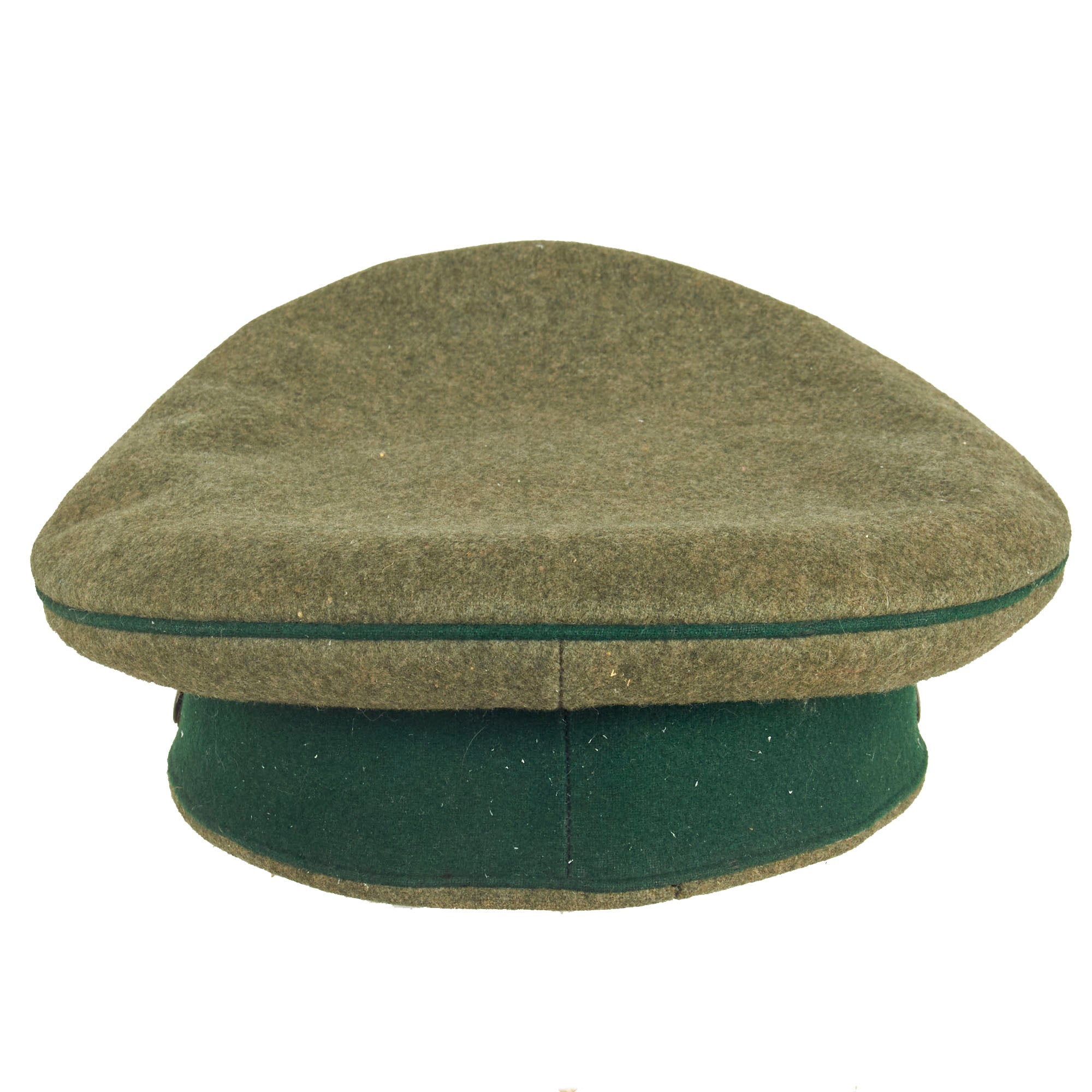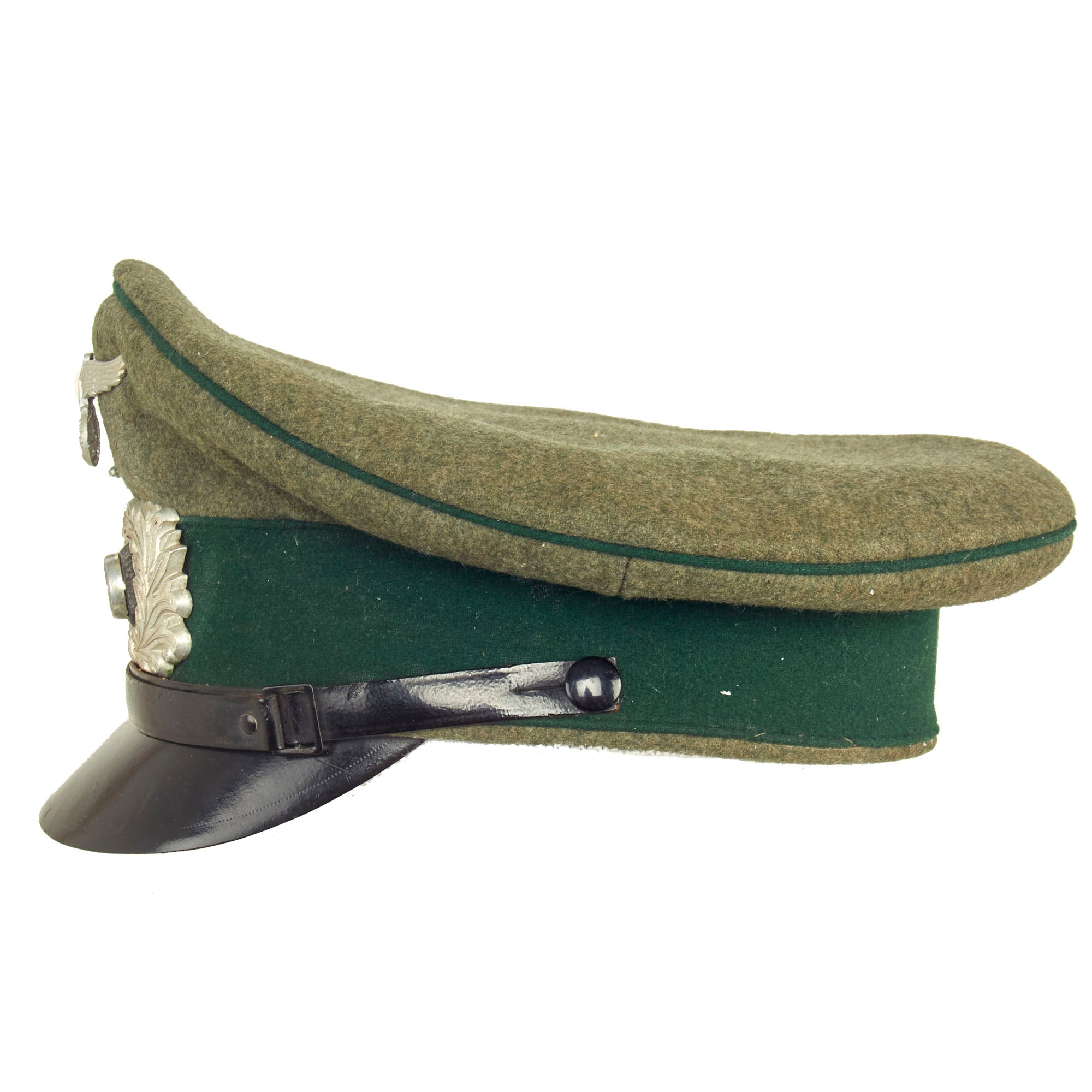 The basic construction is very similar to the Heer Officer Visor cap. It features the typical field gray worsted "doeskin" wool construction with a Waldgrün (Forest Green) band and a traditional high forward crown. It has had the crown stiffener removed, giving it the lovely saddle form "crushed" shape that we all over. The cap also has matching forest green piping along the top edge and flanking either side of the band, common to all versions of the customs cap. It has the standard "vulcanfibre" peak / visor, with a pressed paper faux leather sweatband.