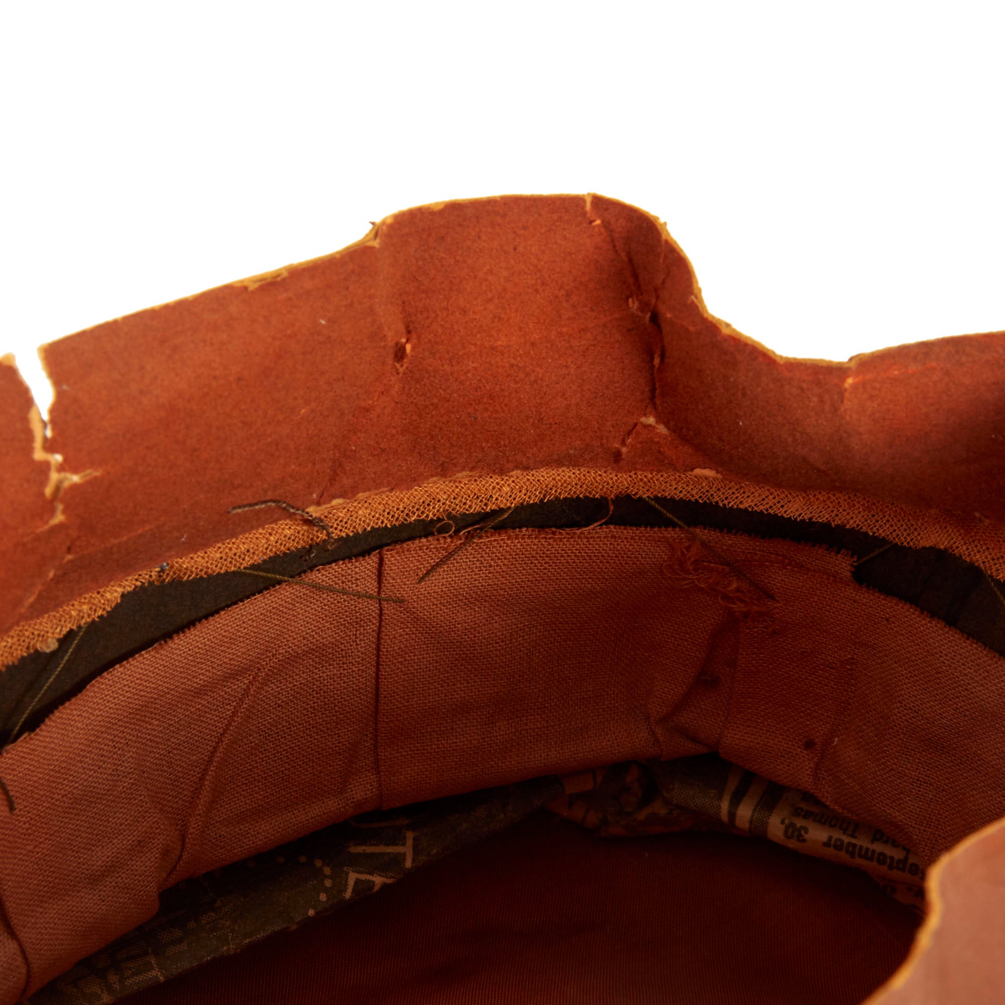 The interior is lined with orange "service cloth" type fabric, and has a brown pressed paper faux leather sweatband. This is in good condition, now a bit stiff and showing a few small tears on the edge. The inner piping around the stitching is also bit degraded. The crown celluloid diamond is partly intact, and still has the manufacturers name and address in black underneath: