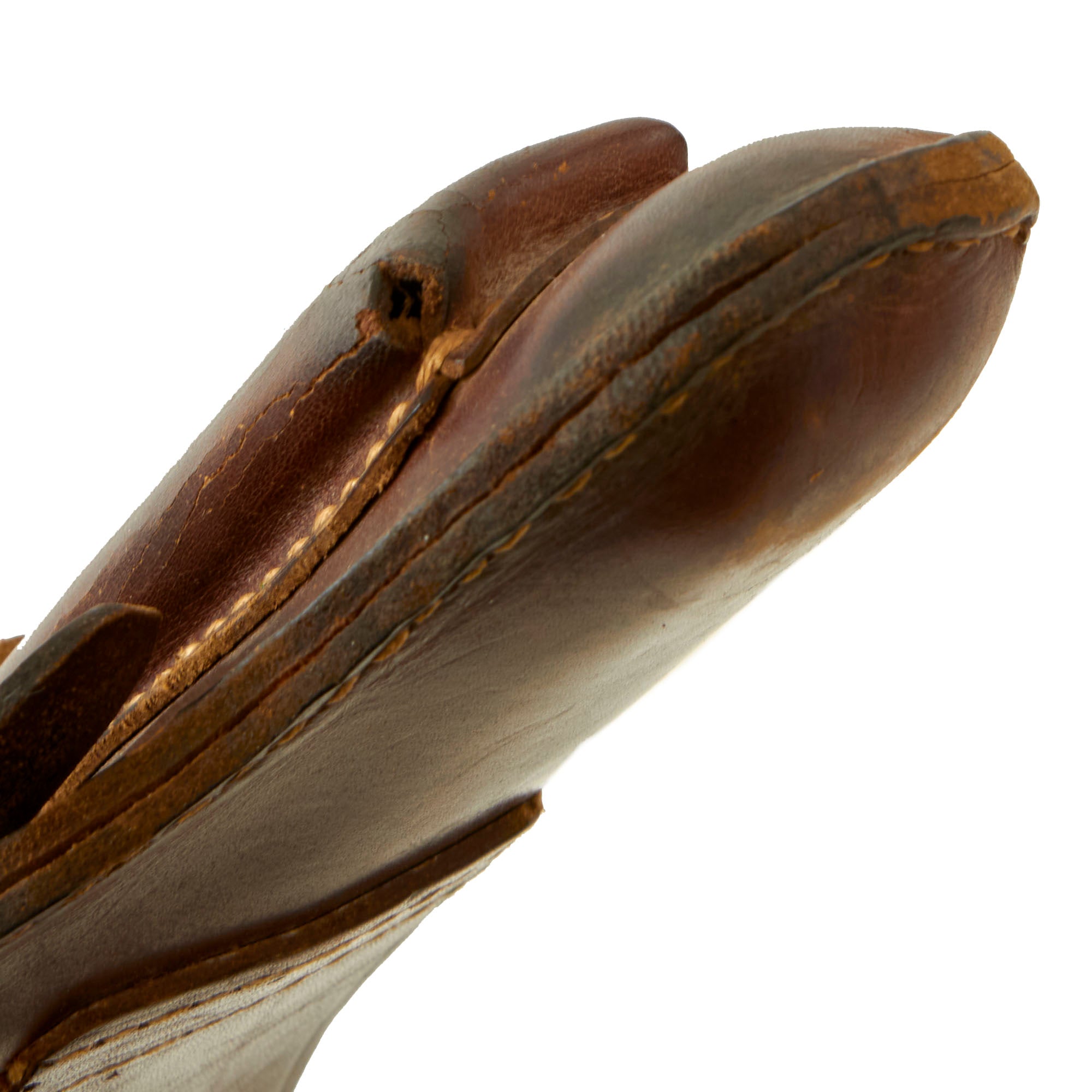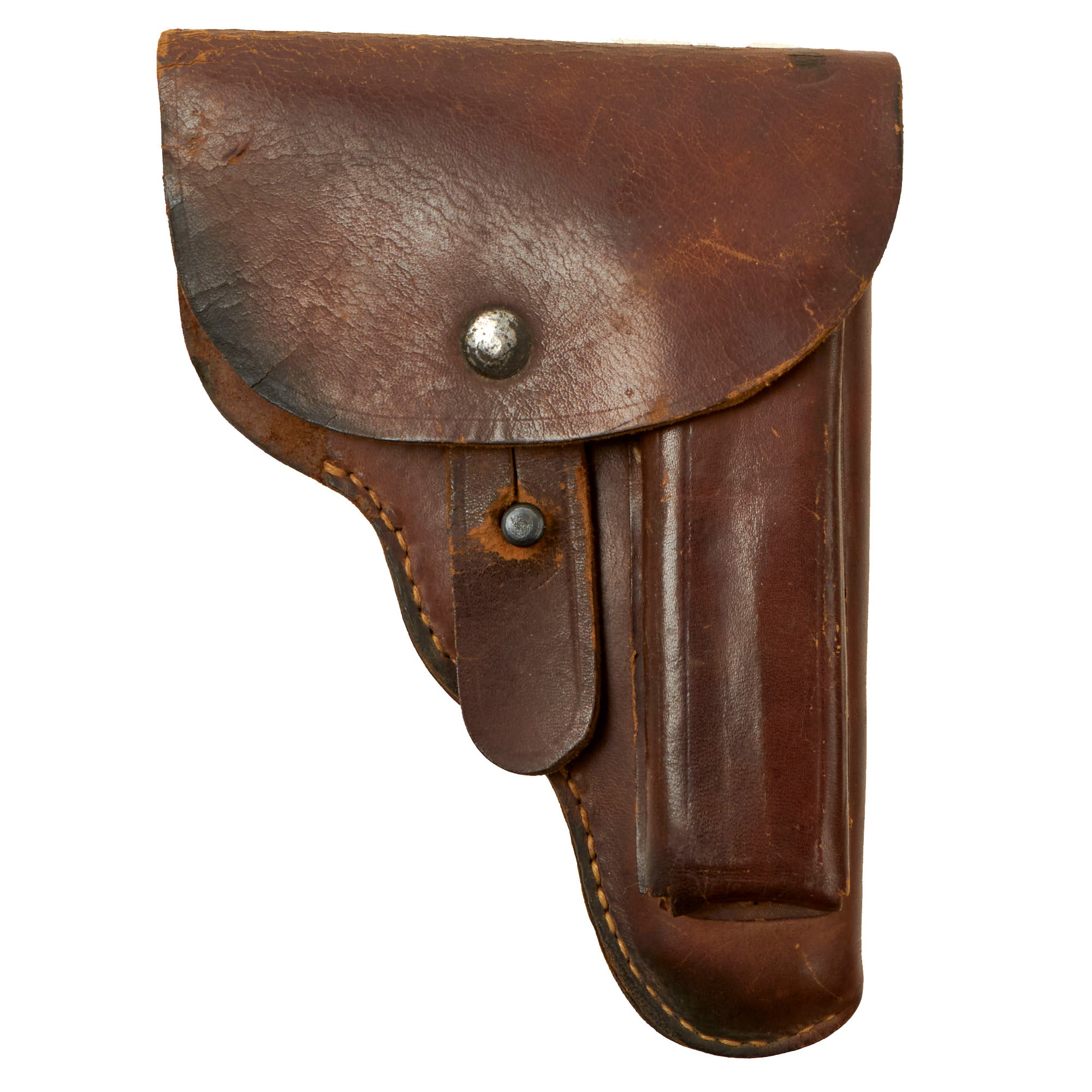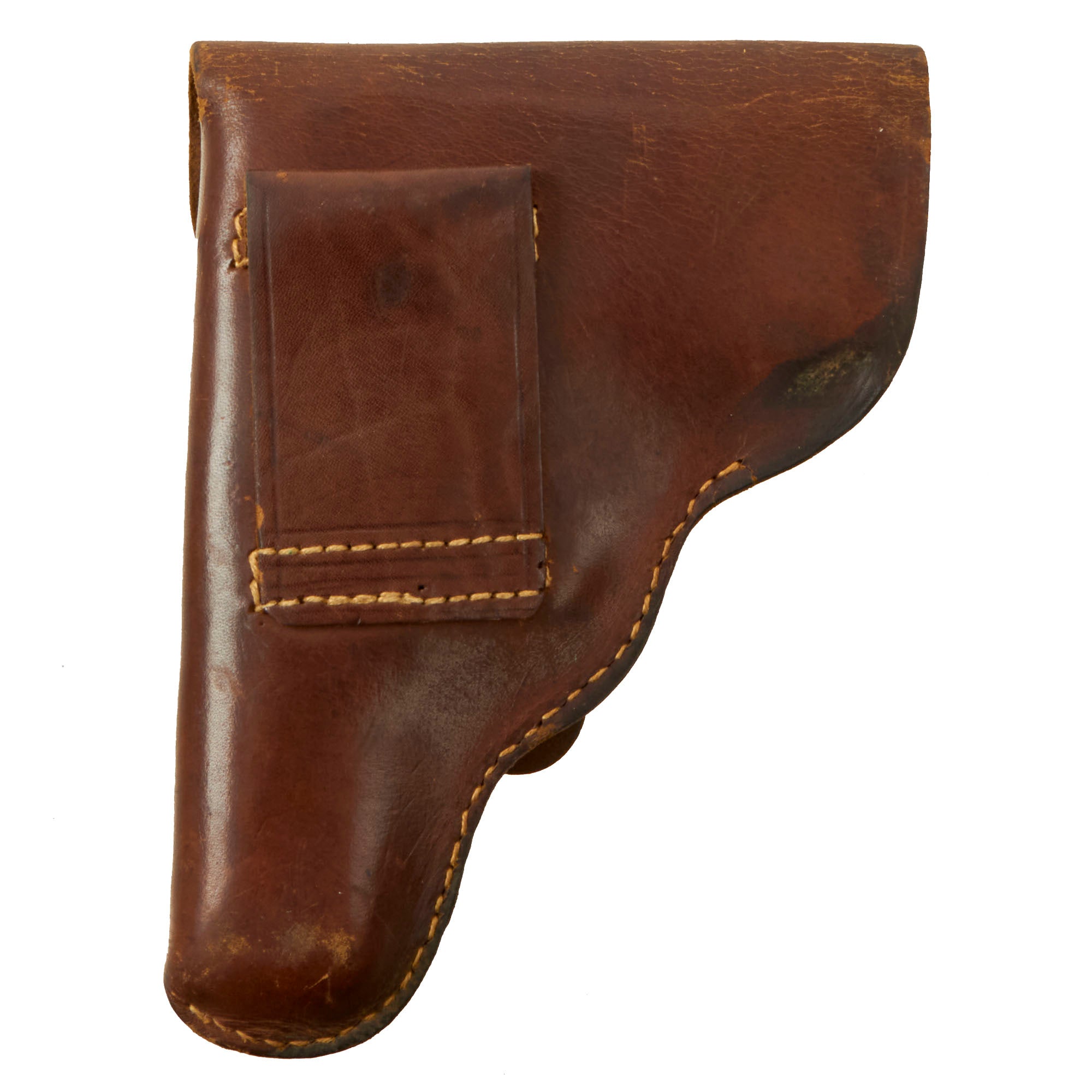 Original Item. Only One Available. This is a very nice brown leather flap top holster with a spare magazine compartment to the front, as issued with the Czech ČZ vz. 27 Pistol. This example is in great shape with some cracking & crazing to the leather, primarily at the flap fold.This example is unmarked that we could find. A nice example, ready for display with your CZ-27.The vz. 27 is a Czechoslovak semi-automatic pistol, based on the pistole vz. 24, and chambered for 7.65 mm Browning/.32 ACP. It is often designated the CZ 27 after the naming scheme used by the Česká zbrojovka factory for post-World War II commercial products. However, it is correctly known as vz. 27, an abbreviation of the Czech "vzor 27", or "Model 27". After the German occupation of Czechoslovakia in mid-March 1939 the pistol was folded into the German armed and police forces as the P27. One notable example was confiscated from a German guard in Colditz by the 'Medium Sized Man' (Flt. Lt. Dominic Bruce OBE MC AFM KSG) the day it was liberated.
