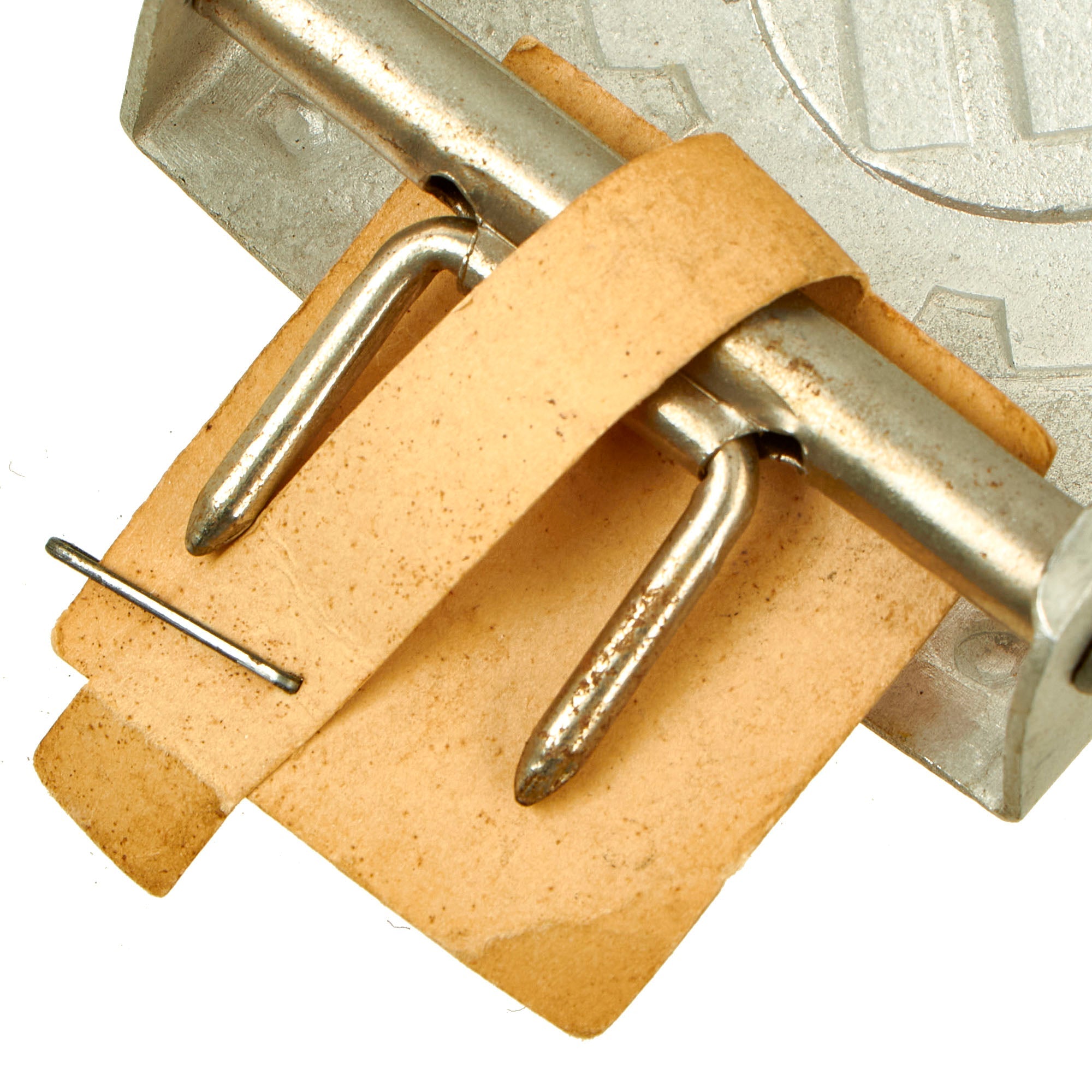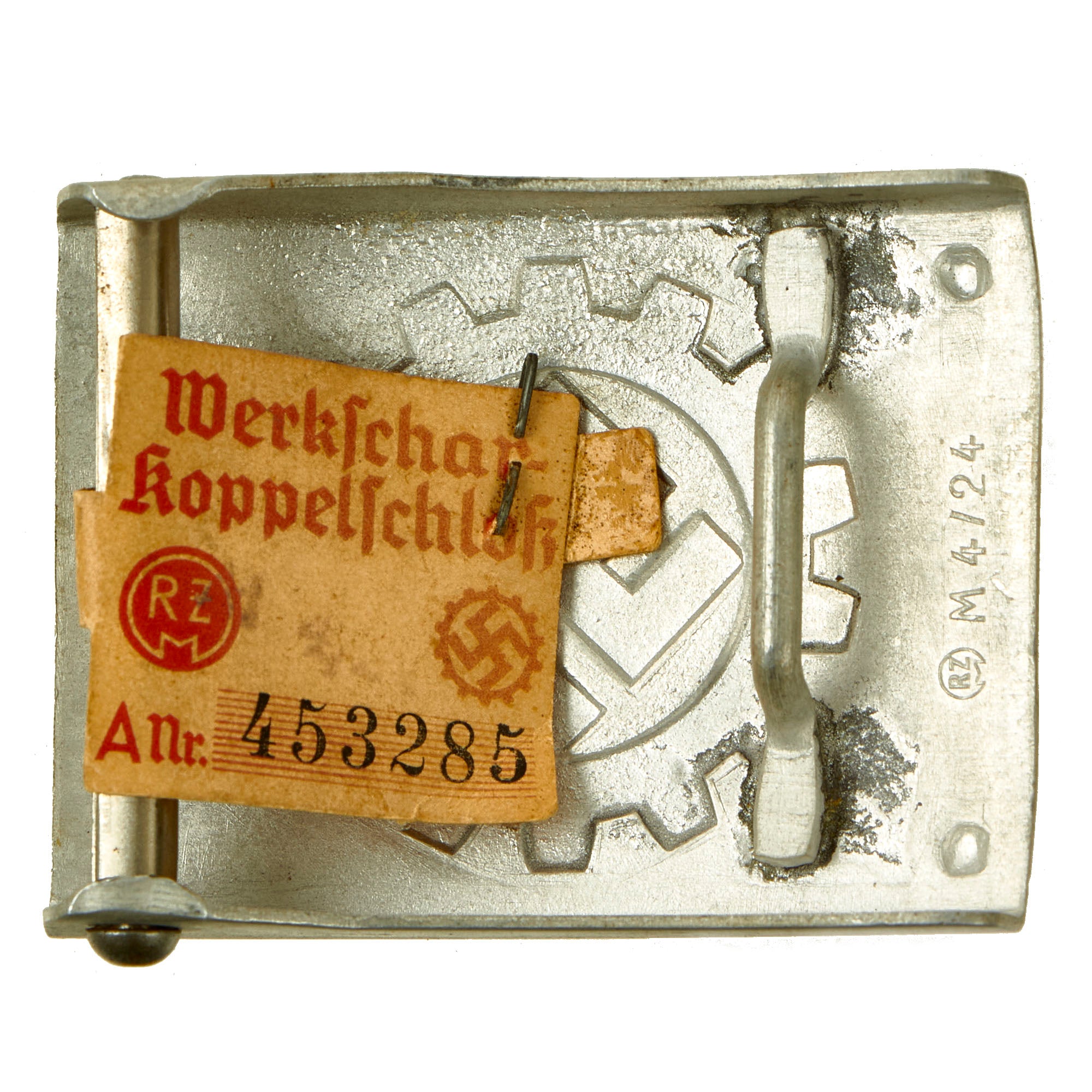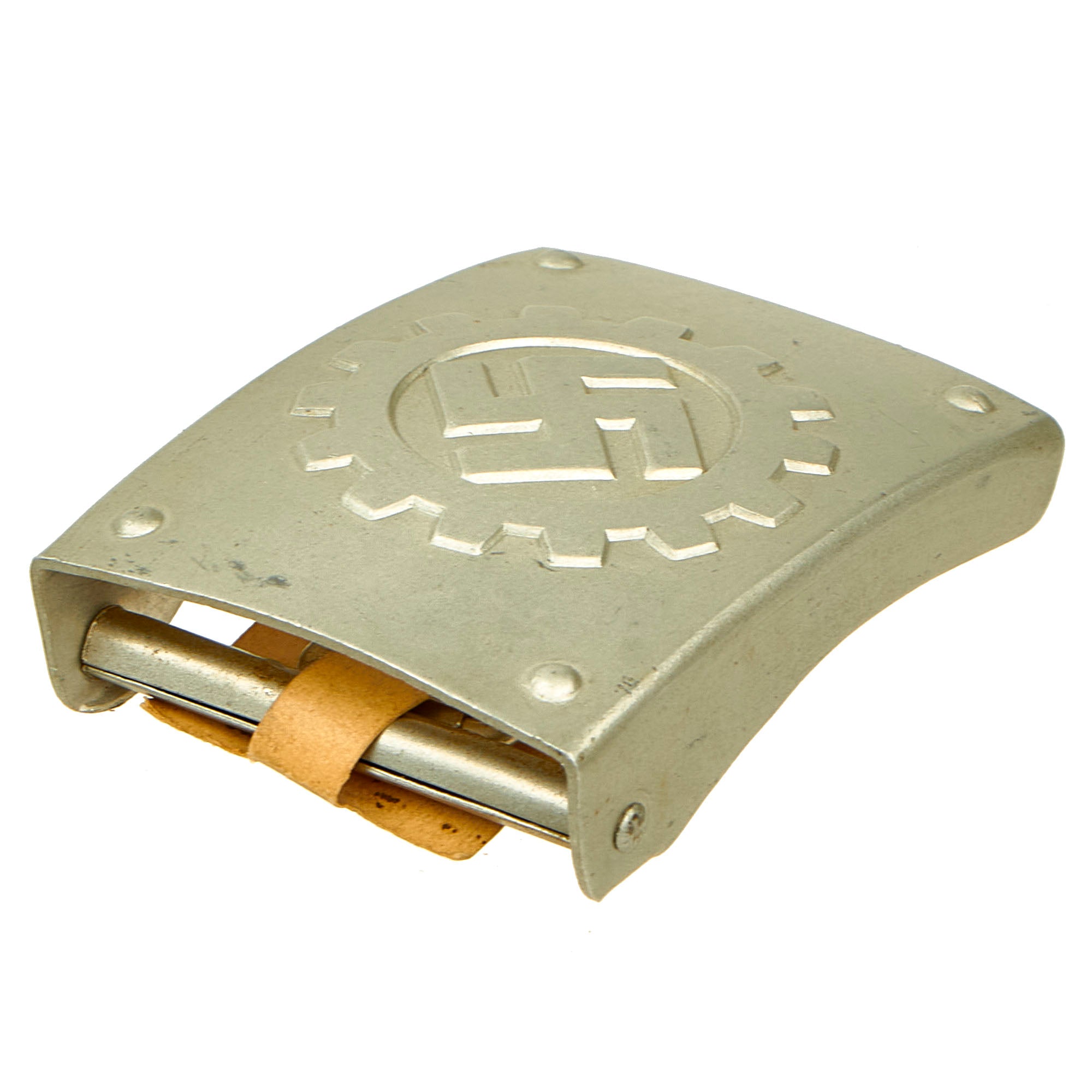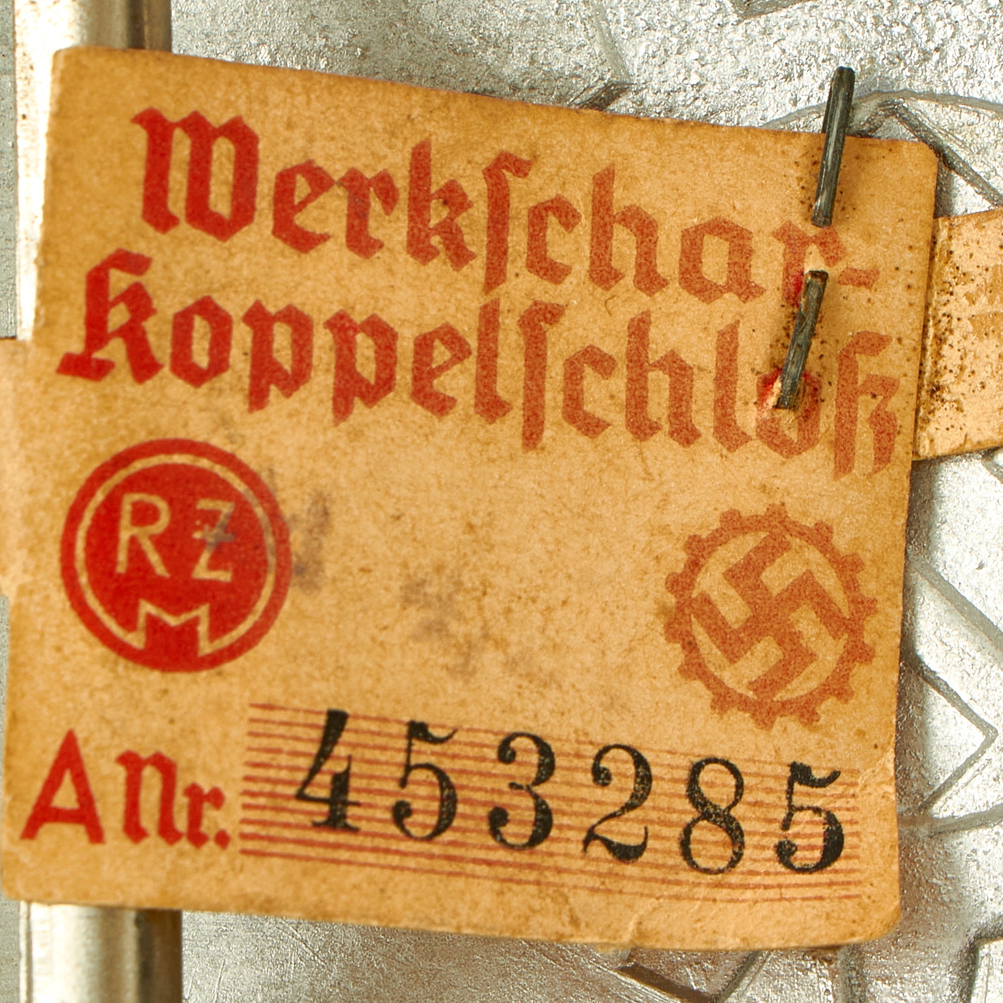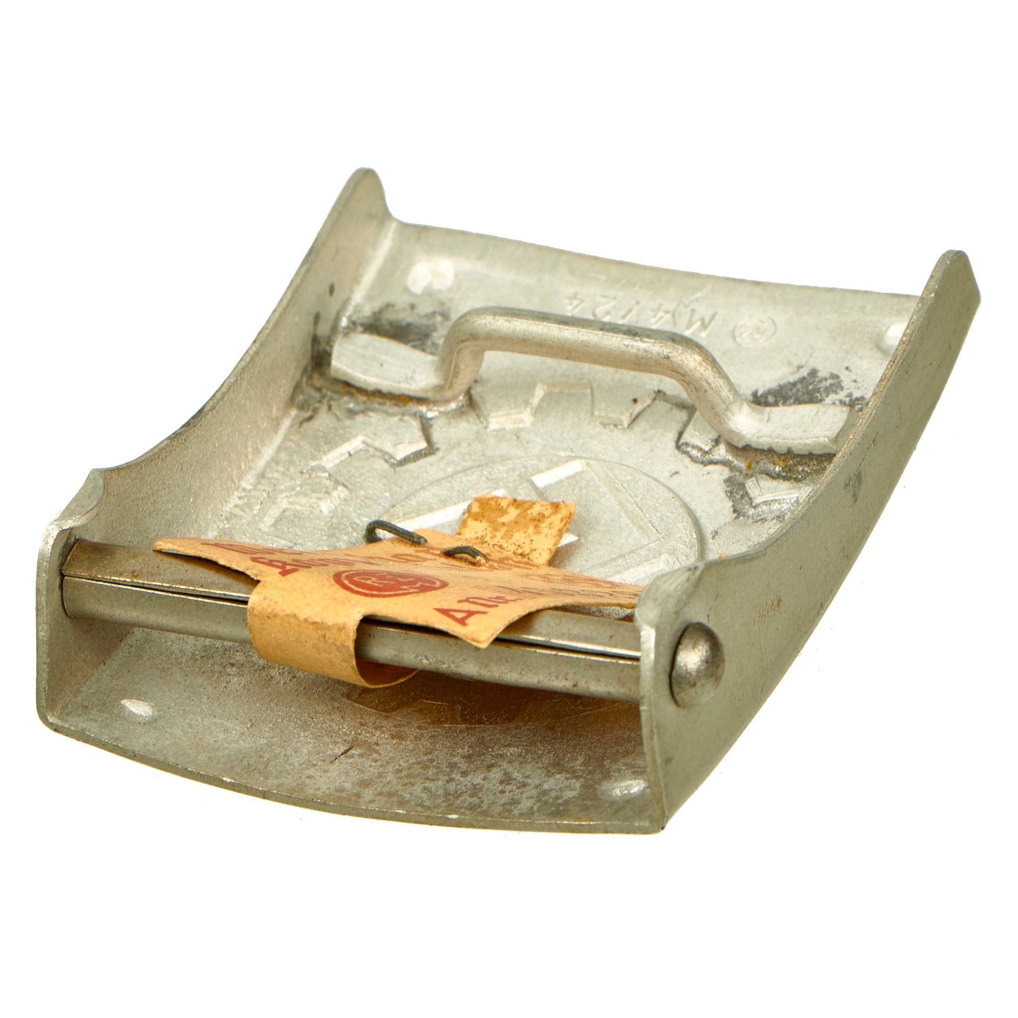 Original Item: Only One Available. This is an excellent unissued WWII German Deutsche Arbeitsfront (German Labor Front or DAF) Aluminum Werkschar-koppelschloß (Factory brigade belt buckle), complete with the original RZM paper tag. The front is embossed with a fourteen tooth cogwheel encompassing a swas in the center. The buckle also has a small embossed circular bead to each corner. This example has a two piece buckle, with stamped aluminum single piece box construction with a soldered on hook loop. The hooked "claw" is made from plated steel, attached to the buckle body by a peened over securing pin.
