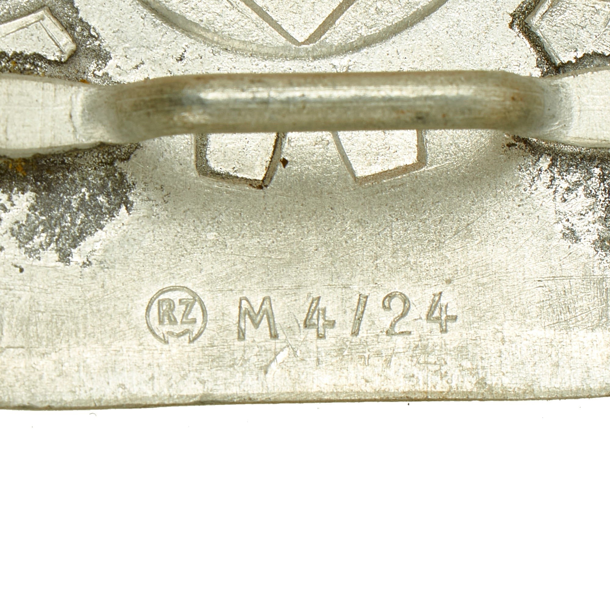 The M4 in the code stands for buckles, and registrant 24 is Friedrich Linden of Lüdenscheid, a large maker of belts, buttons, and other accoutrements. There is also an original paper tag indicating that it is a Werkschar-koppelschloß, above the RZM and DAF logos. The bottom gives production number A Nr. 453285.
