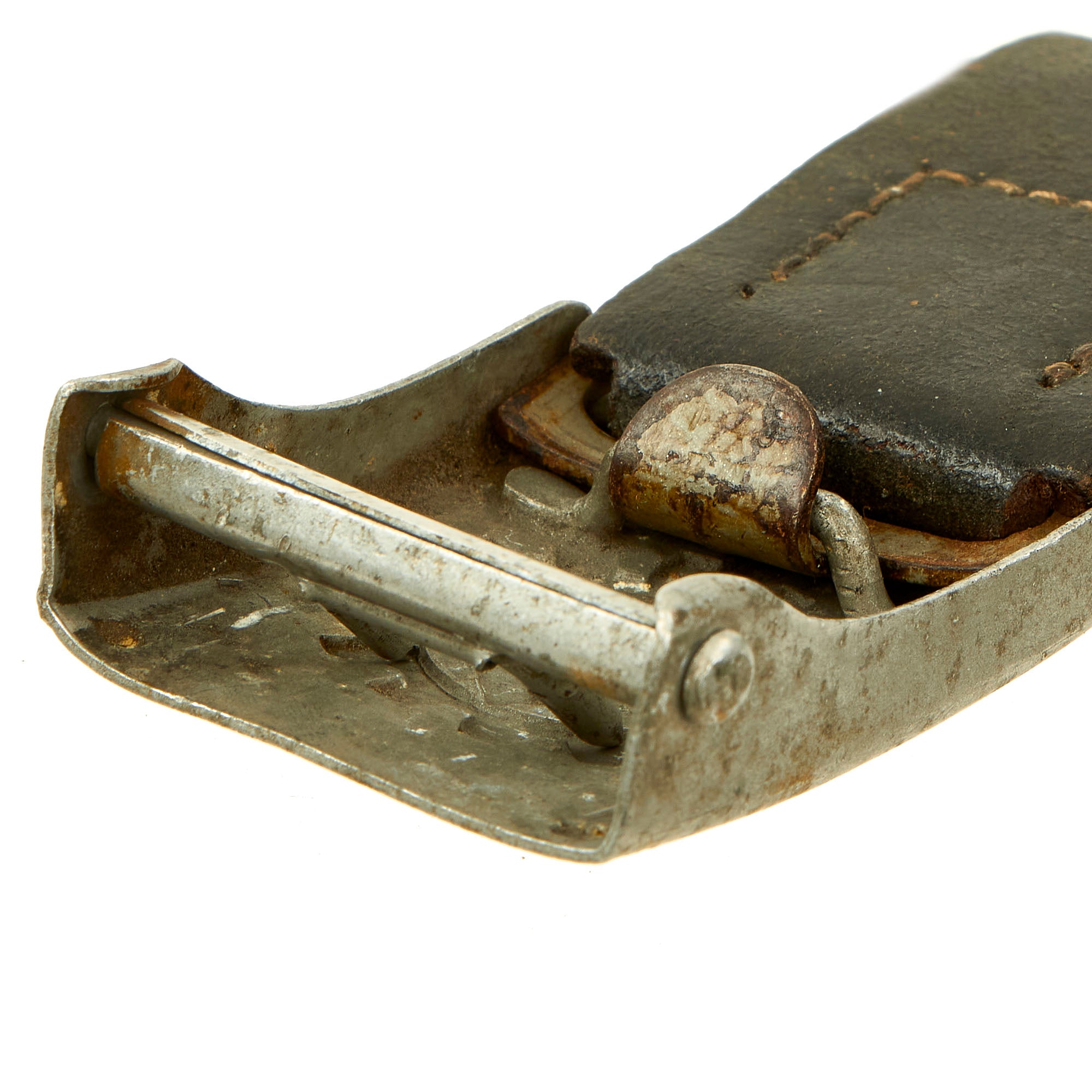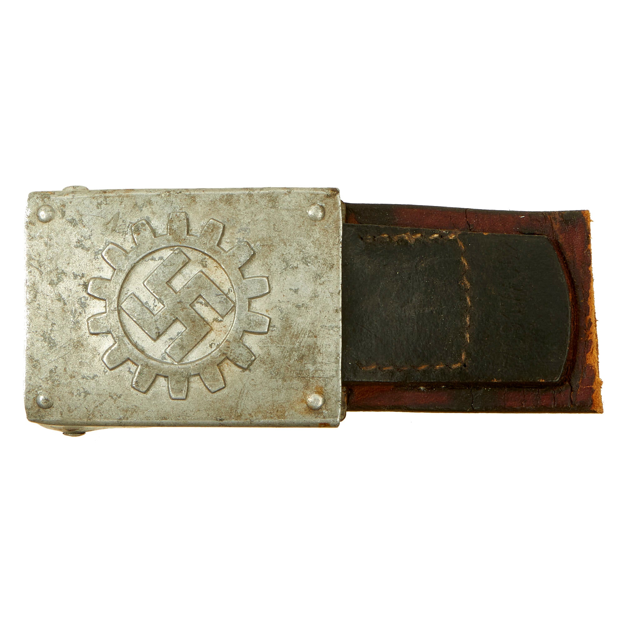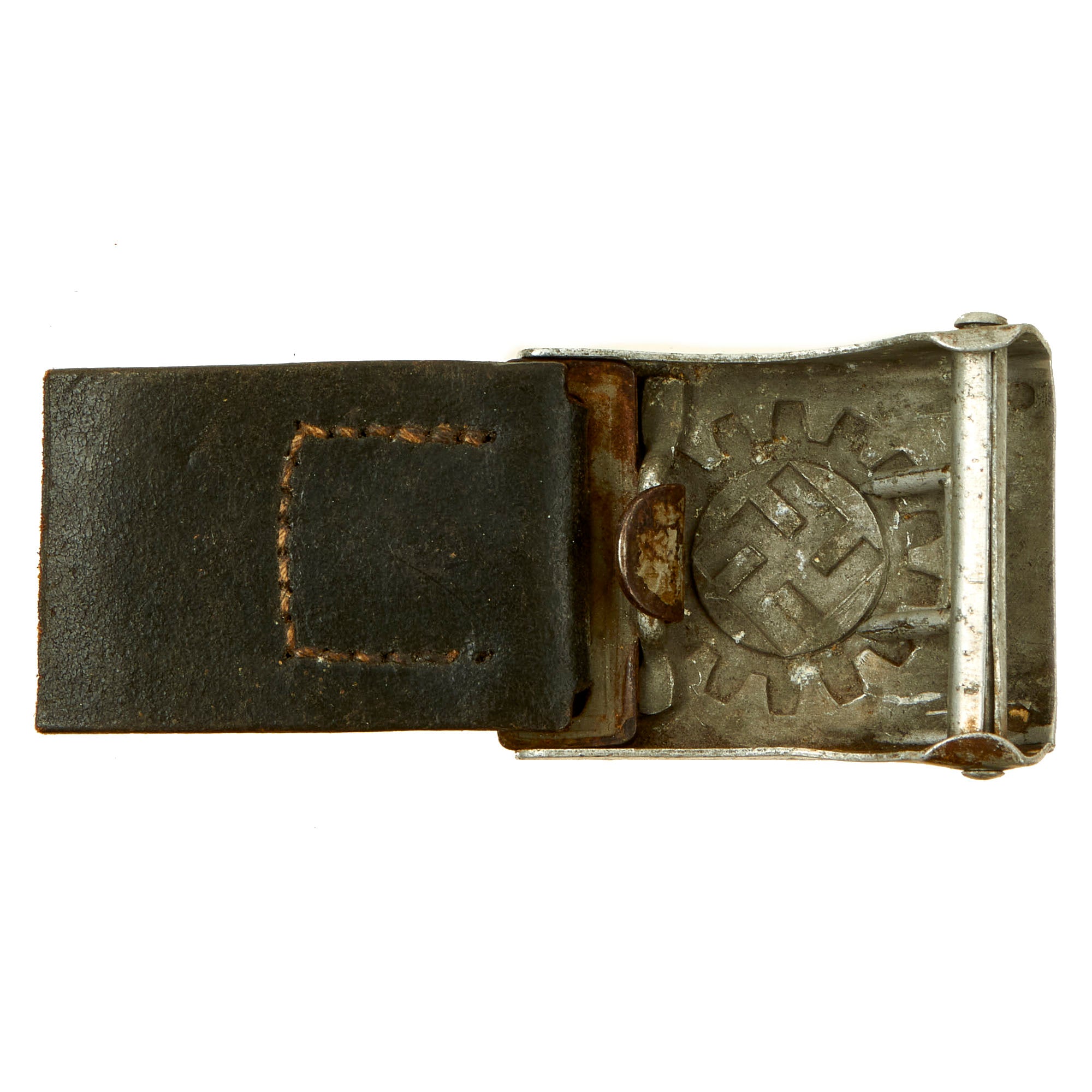 Original Item: Only One Available. This is a very interesting service used WWII German Deutsche Arbeitsfront (German Labor Front or DAF) Aluminum Werkschar-koppelschloß (Factory brigade belt buckle), which came to us with a short 2 3/4" section of leather belt still attached to the end clip. This was clipped to the buckle backwards at some point, and now is wedged inside the buckle. The remainder of the belt was cut off, and we have not made any attempts to remove the belt section and clip to avoid damaging the buckle.
