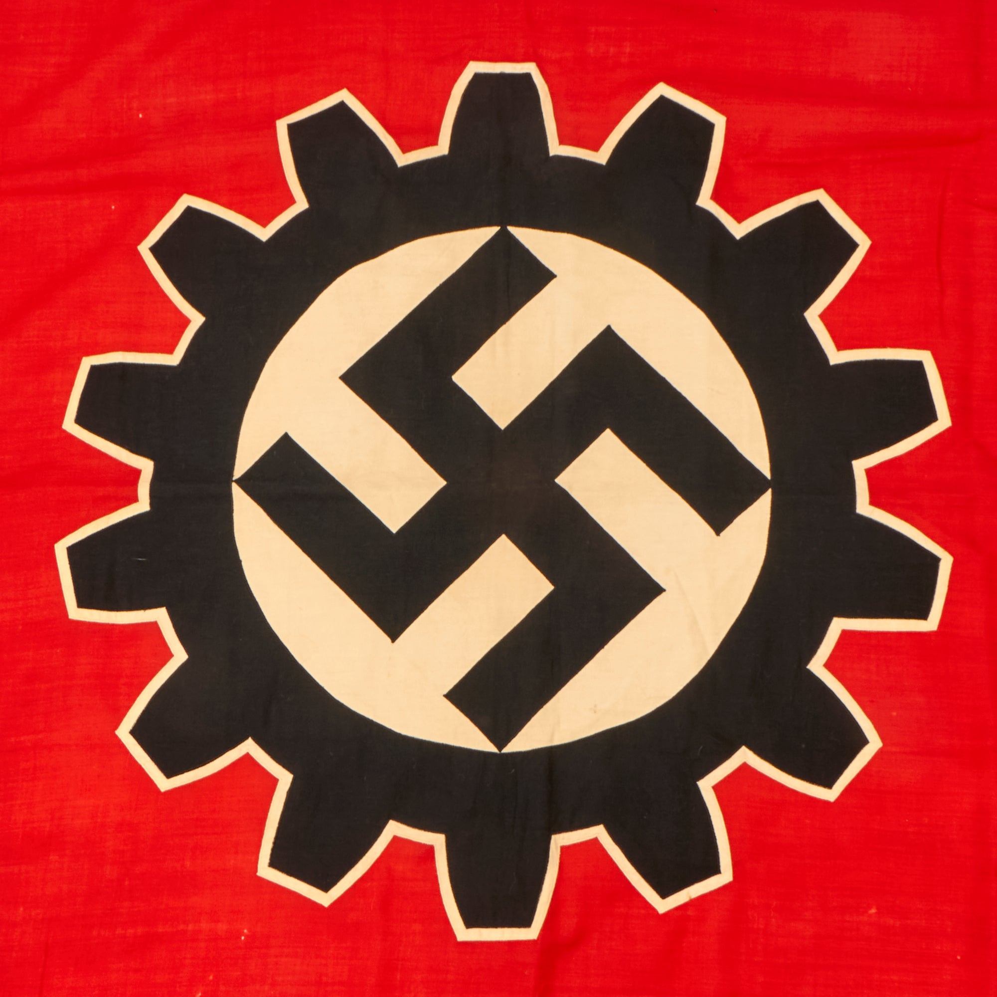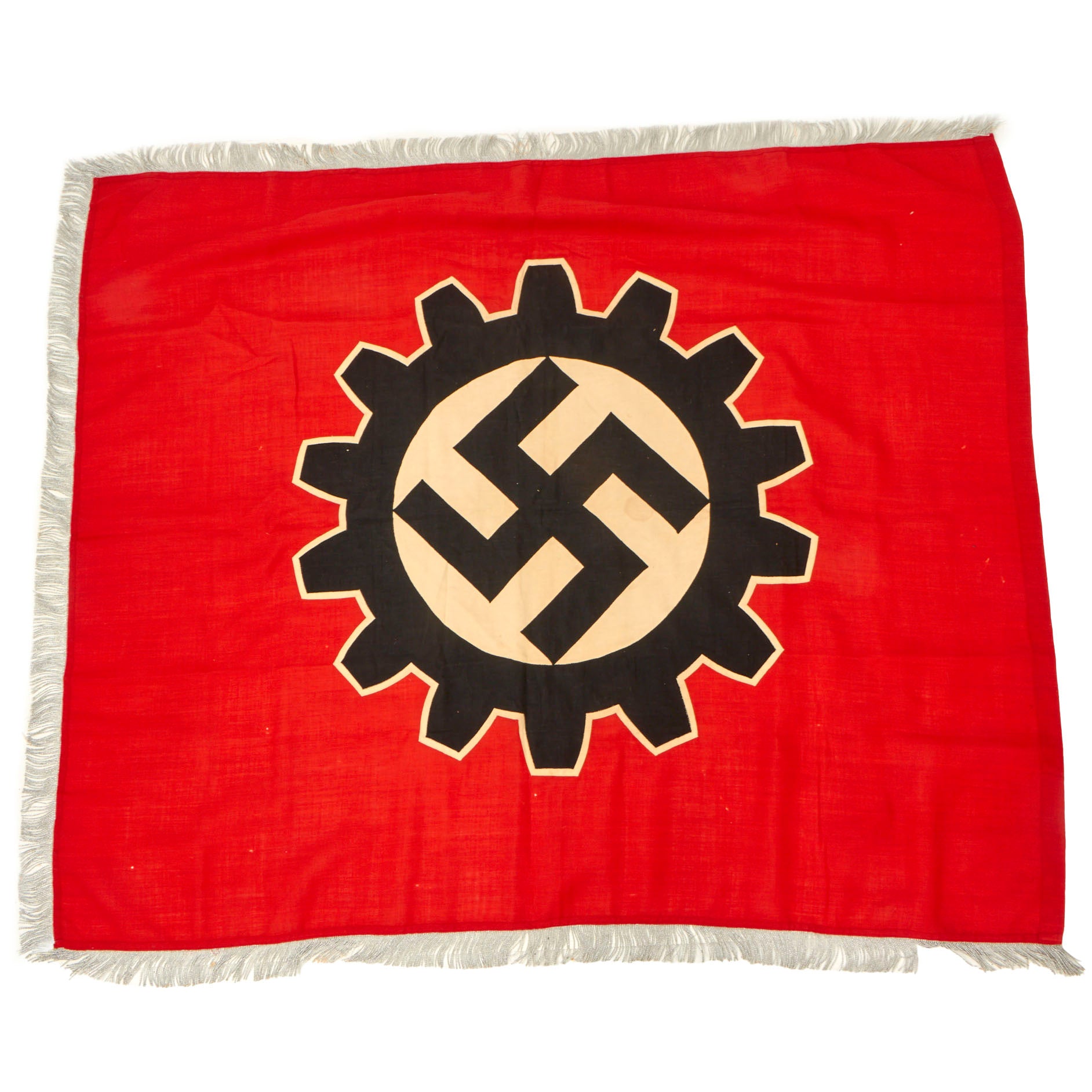 Original Item: Only One Available. The DAF (Deutsche Arbeitsfront or German Labor Front) was a National Socialist trade union that supplanted independent unions once the NSDAPs had come to power in Germany. This 47" x 55" Fringed Flag would have usually had a patch sewn in a corner indicating the location it was issued to, but there is none on this example, and it also shows no signs of ever being attached to a pole. It looks to have never been issued before it was captured, and then was kept in storage for a long time, where it suffered a bit of mothing.