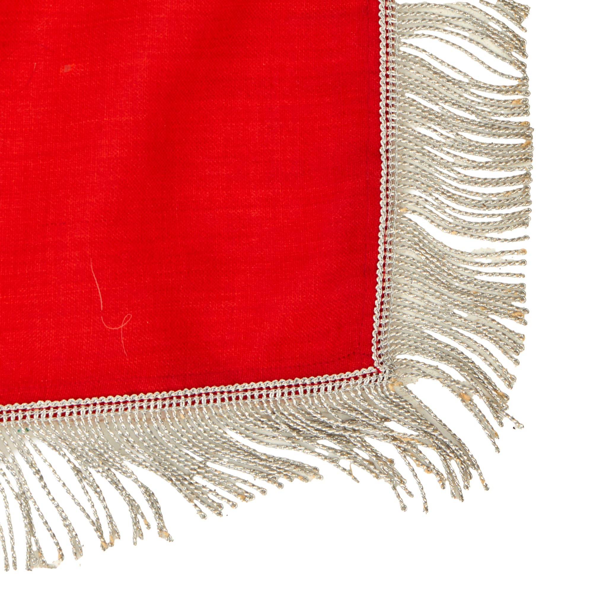 The body of the flag appears to be made of woven red wool, with cotton white and black DAF emblems sewn onto on each side. The fringe is twisted silvered cotton threads, which is still very well retained. There is no attachment hardware on the flag, so we assume it was intended to be attached to a pole with tacks, as we have seen before with DAF Parade flags.