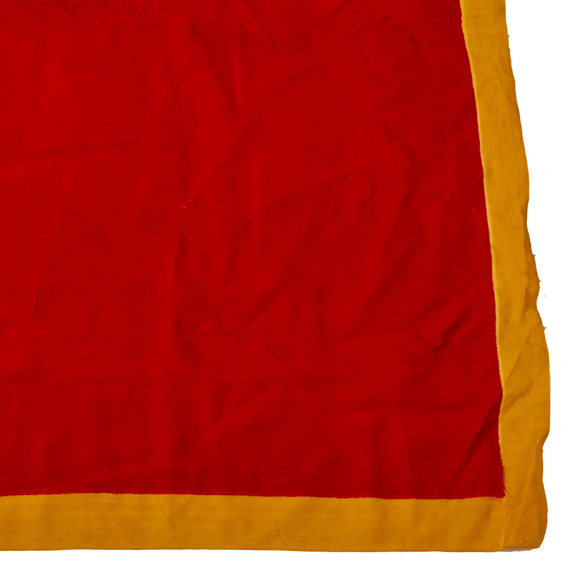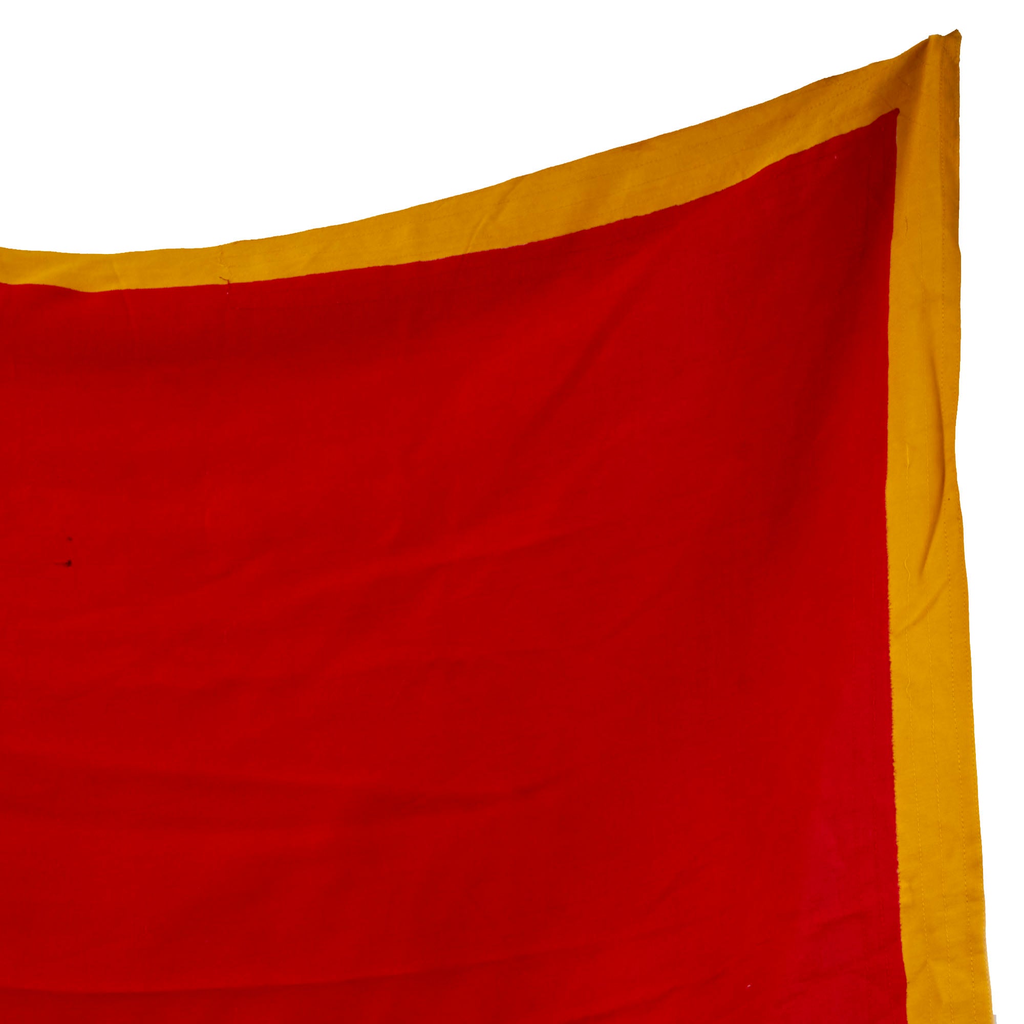This example looks most likely to be a later production flag, when the original gold fabric was replaced with printed yellow. It appears to be made of cotton or a cotton and wool blend, and due to the size is made from multiple pieces of fabric, with the design printed / dyed onto the material. It displays the DAF "cog wheel" logo on a red field, with the NSDAP swas in the center. The gears of the wheel are yellow gold, and there is also a yellow gold border around the entire outside of the flag. There is a lanyard sewn inside the header, which is sewn into a loop at the top, and extends 32 inches below.
