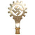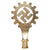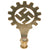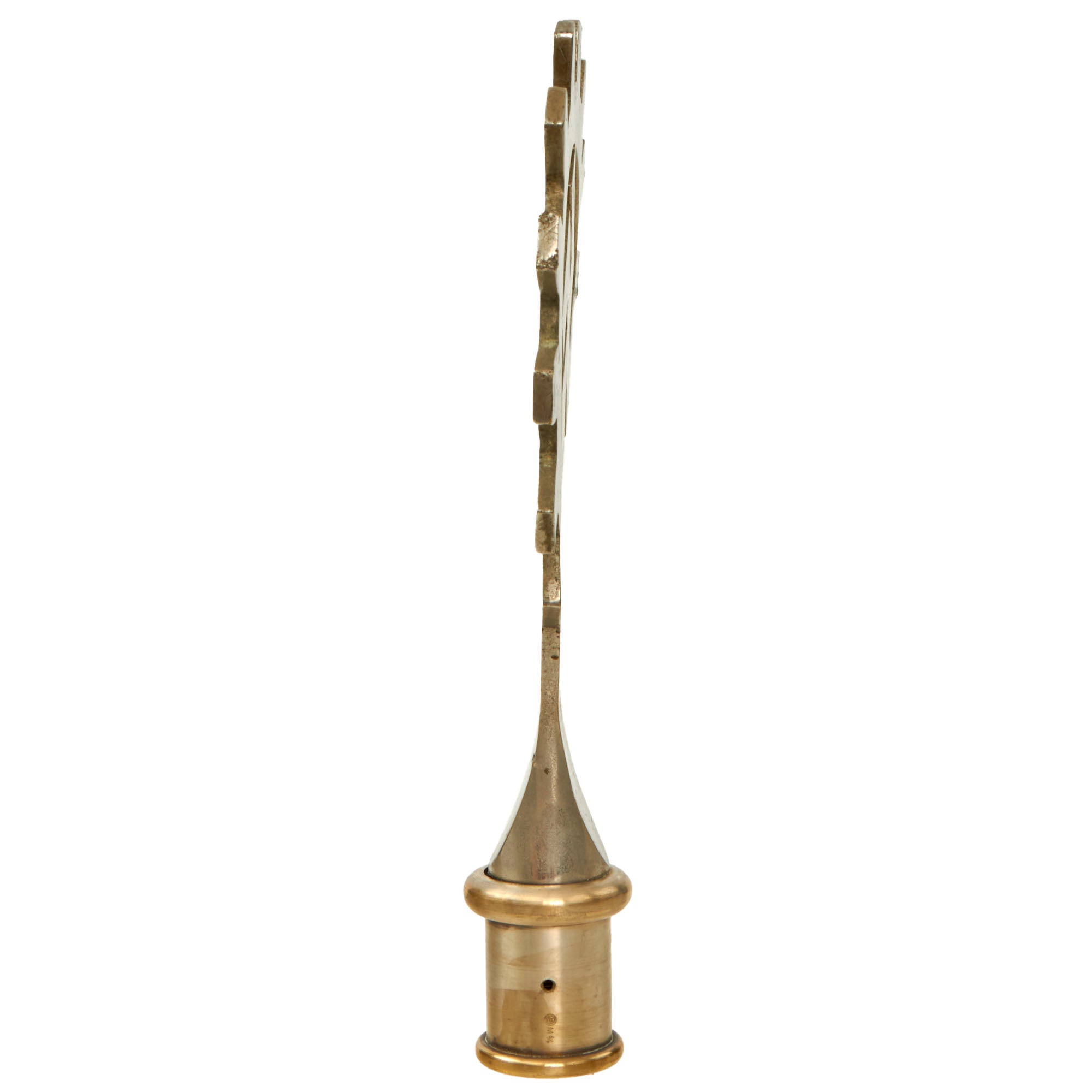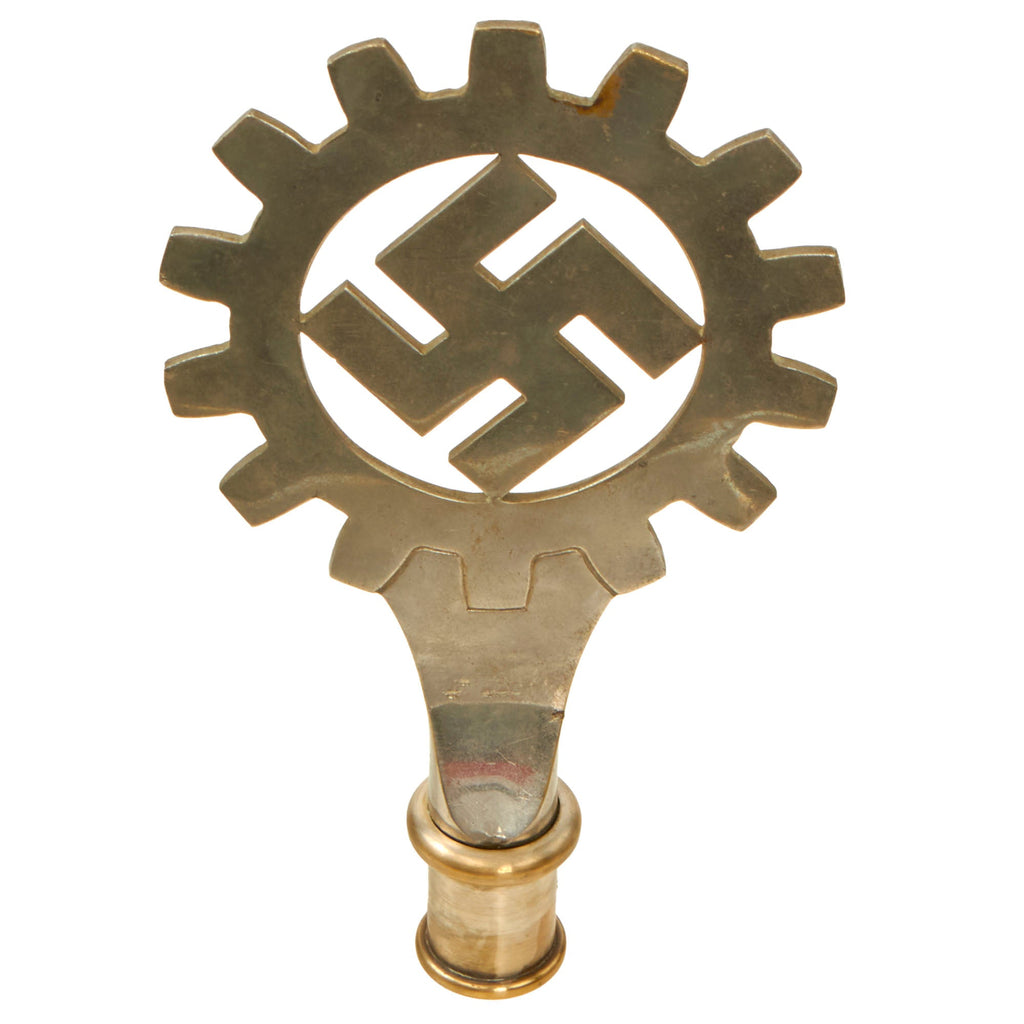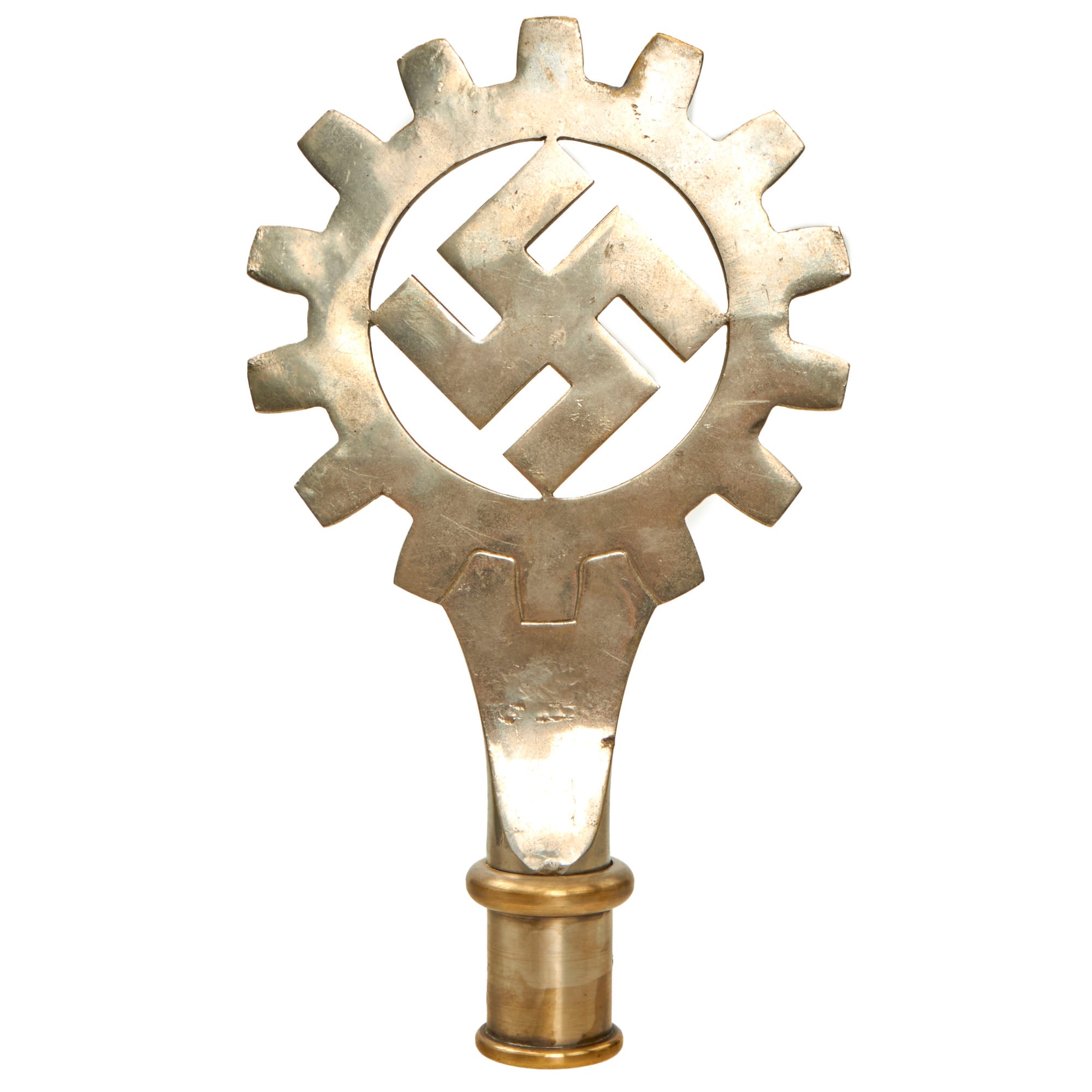 The finial measures approximately 10” long with the gear having a diameter of 5⅞”. This piece would go atop the golden cog honor flag awarded to manufacturers during the Reich. This piece takes the form of the DAF emblem of a fourteen-tooth cog wheel encompassing a canted swas.