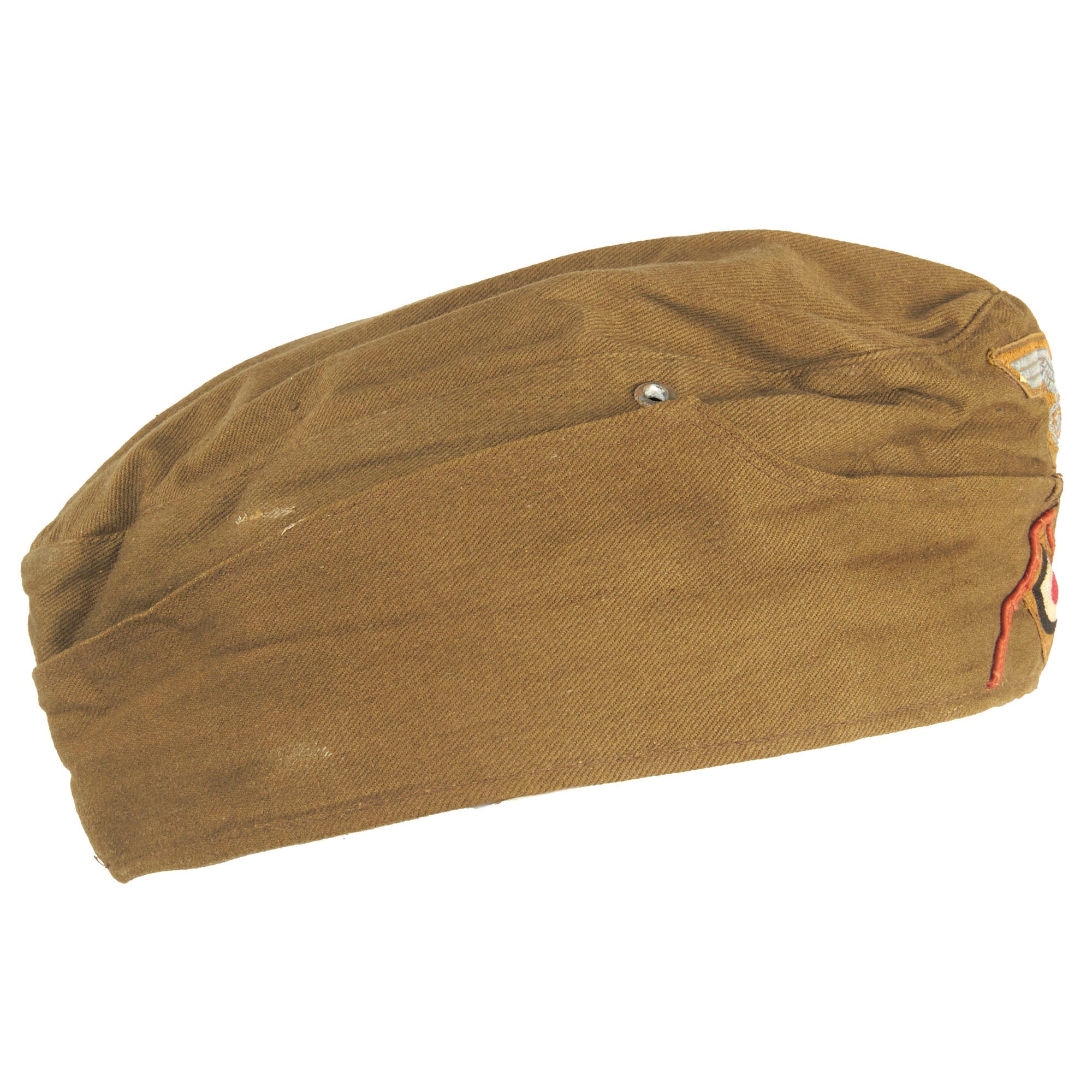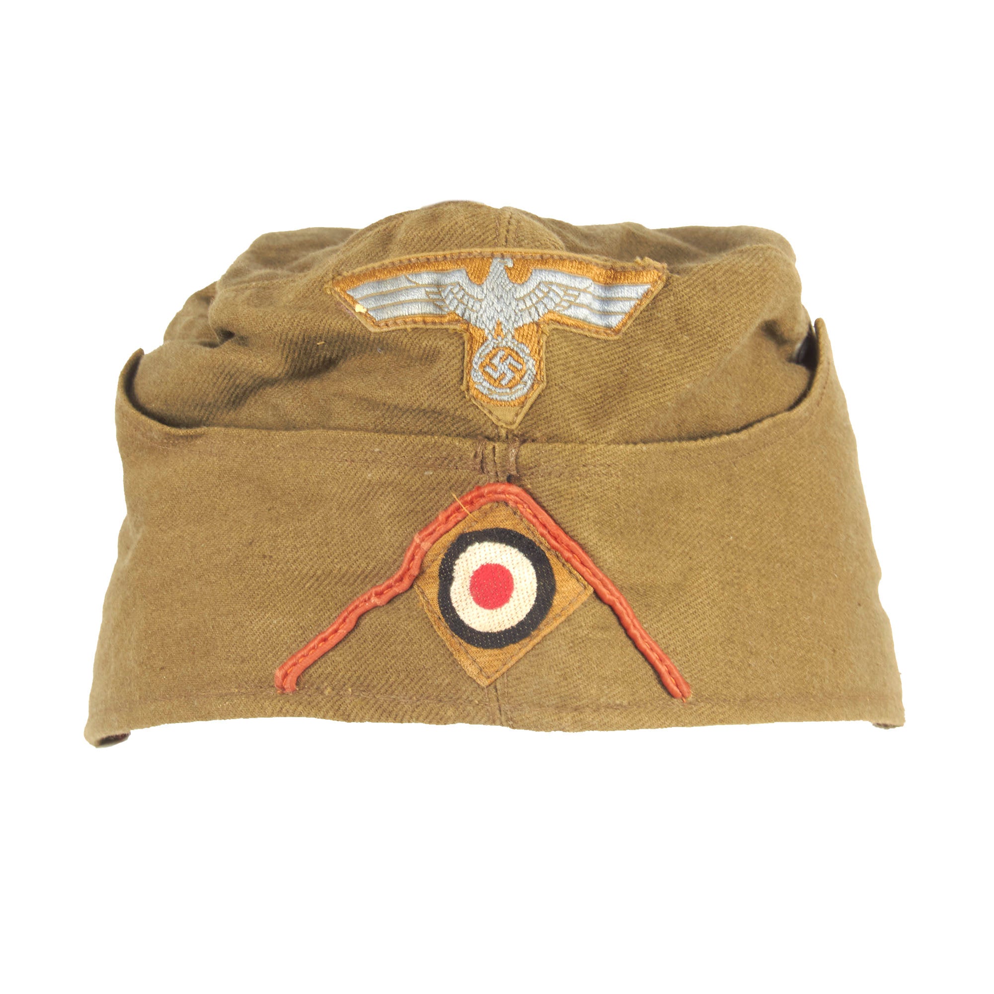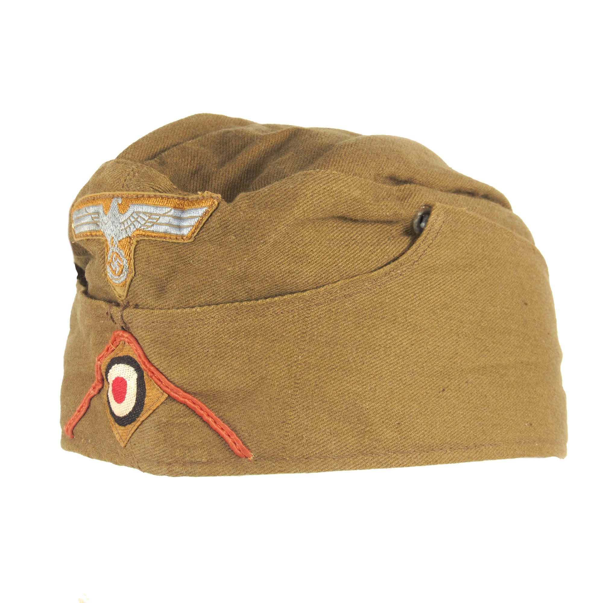 Original Item: Only One Available. The second most predominant item of Heer tropical soft headgear was based on the M-34 / 38 overseas cap, nicknamed in German army slang as Schiffchen, or literally "little ship" as it resembled an up-turned row-boat. It lacked a peak or visor, and was made in the same cotton as the M-40 'Afrikamütze' cap. The production of these also started in 1940. The schiffchen utilized the same brown enameled stock for the vent holes as the M-40.
