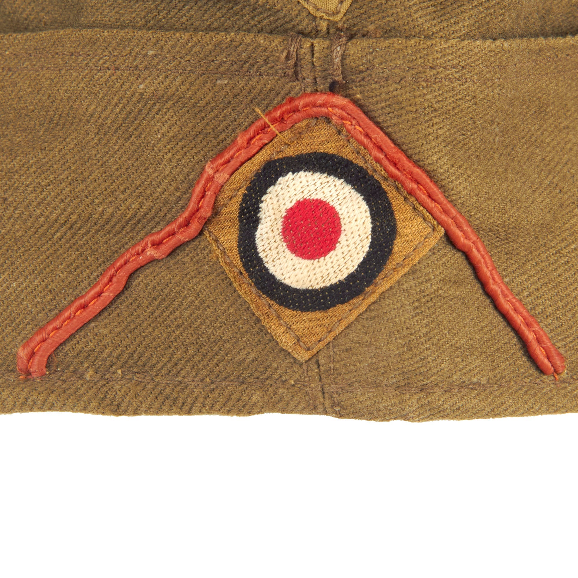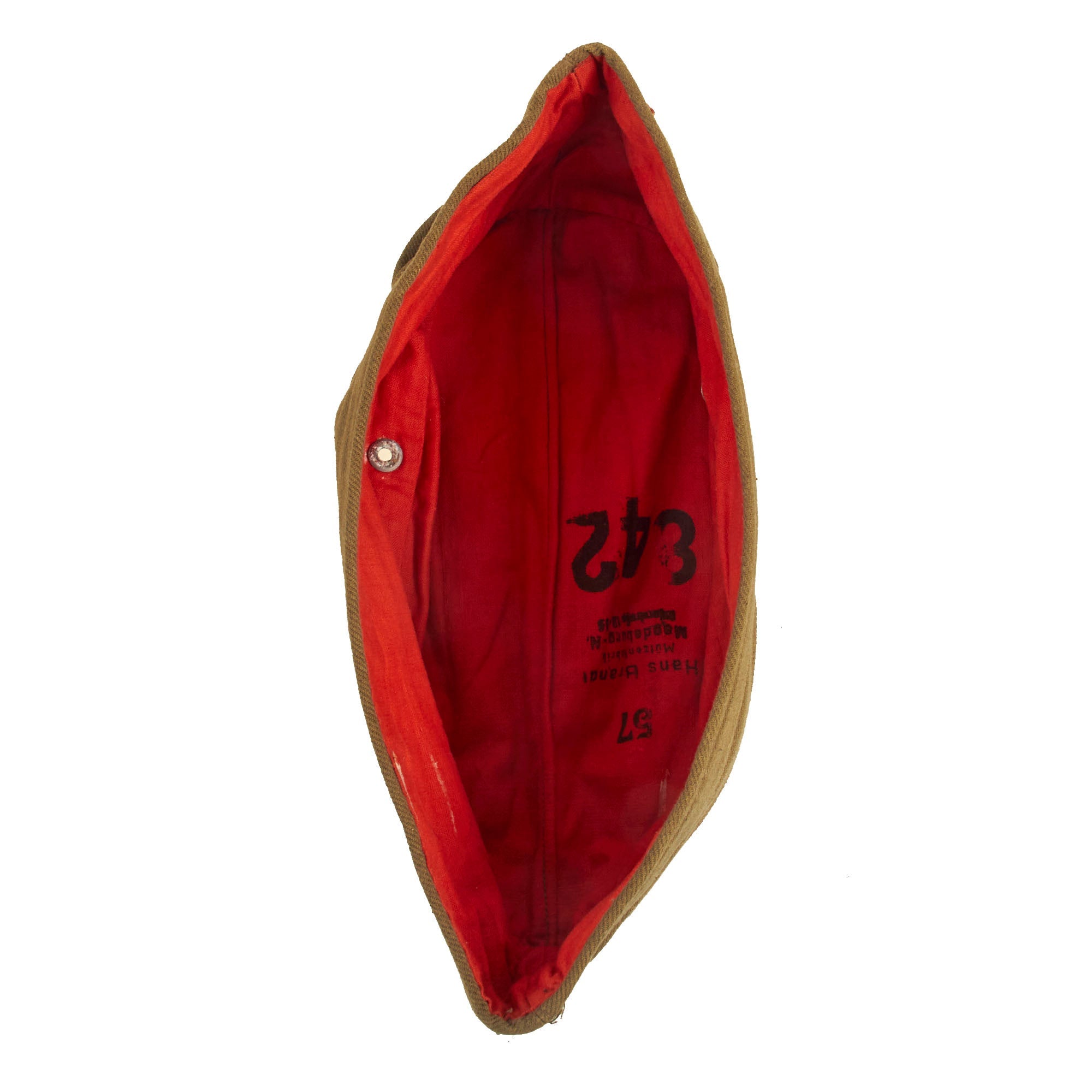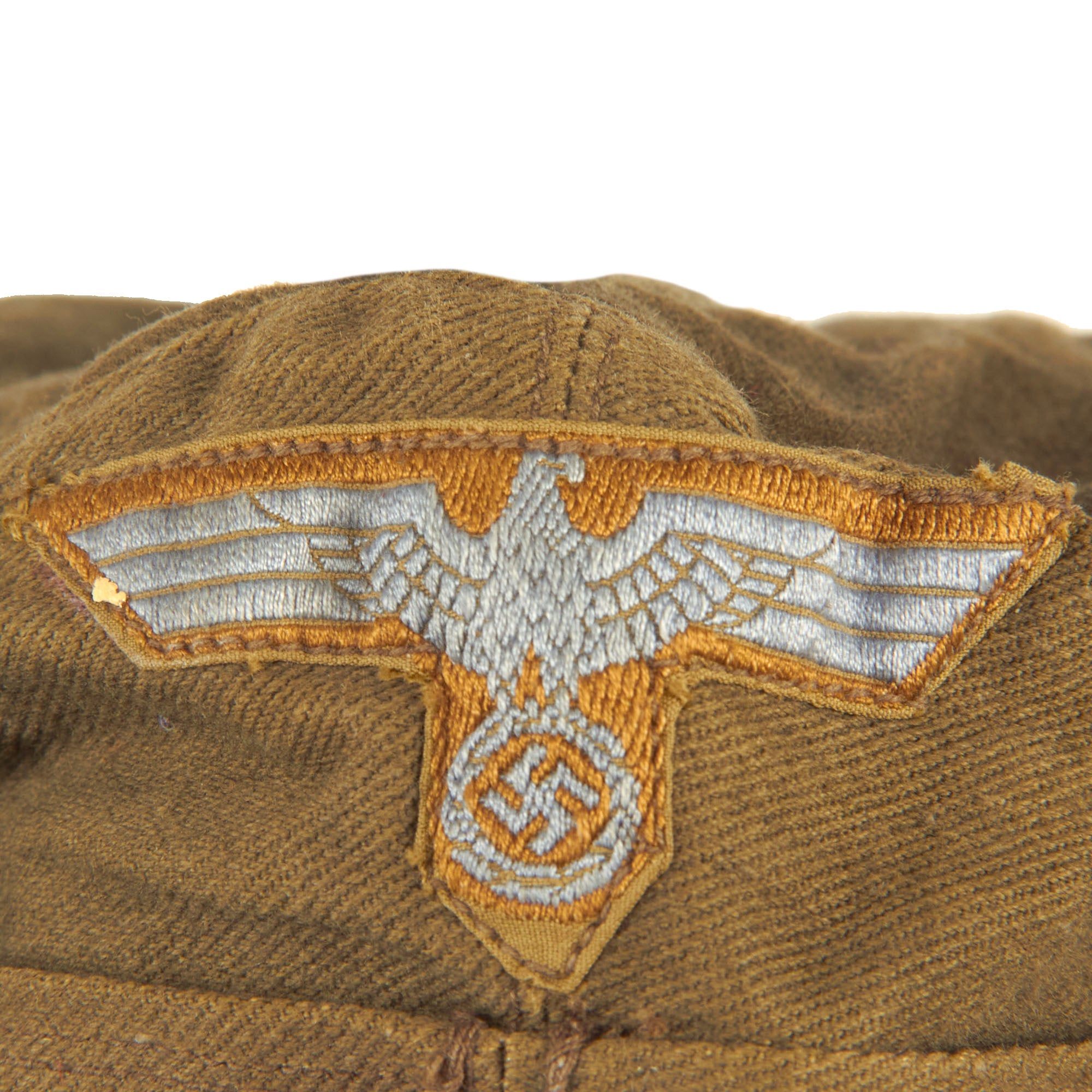 This is a very nice Heer tropical pattern overseas cap worn by NCO and enlisted ranks in the DAK and southern Europe. Styled after the 1940 pattern, it is produced in olive-brown cotton twill with decorative "faux" flaps and tan enameled alloy vent grommets. The front has a very nice BeVO style machine embroidered light blue gray on Tan tropical pattern Heer eagle with the correct tri-color Kokarde underneath. There is a very nice kupferbraun (Copper Brown) V-shaped soutache, which is the Waffenfarbe (Corps Color) for the Kradschützentruppe Motorcycle infantry soldiers. The bottom stitches do not go over the soutache, so it was added to the cap after production at arsenal. It has the correct color thread securing it from the rear.