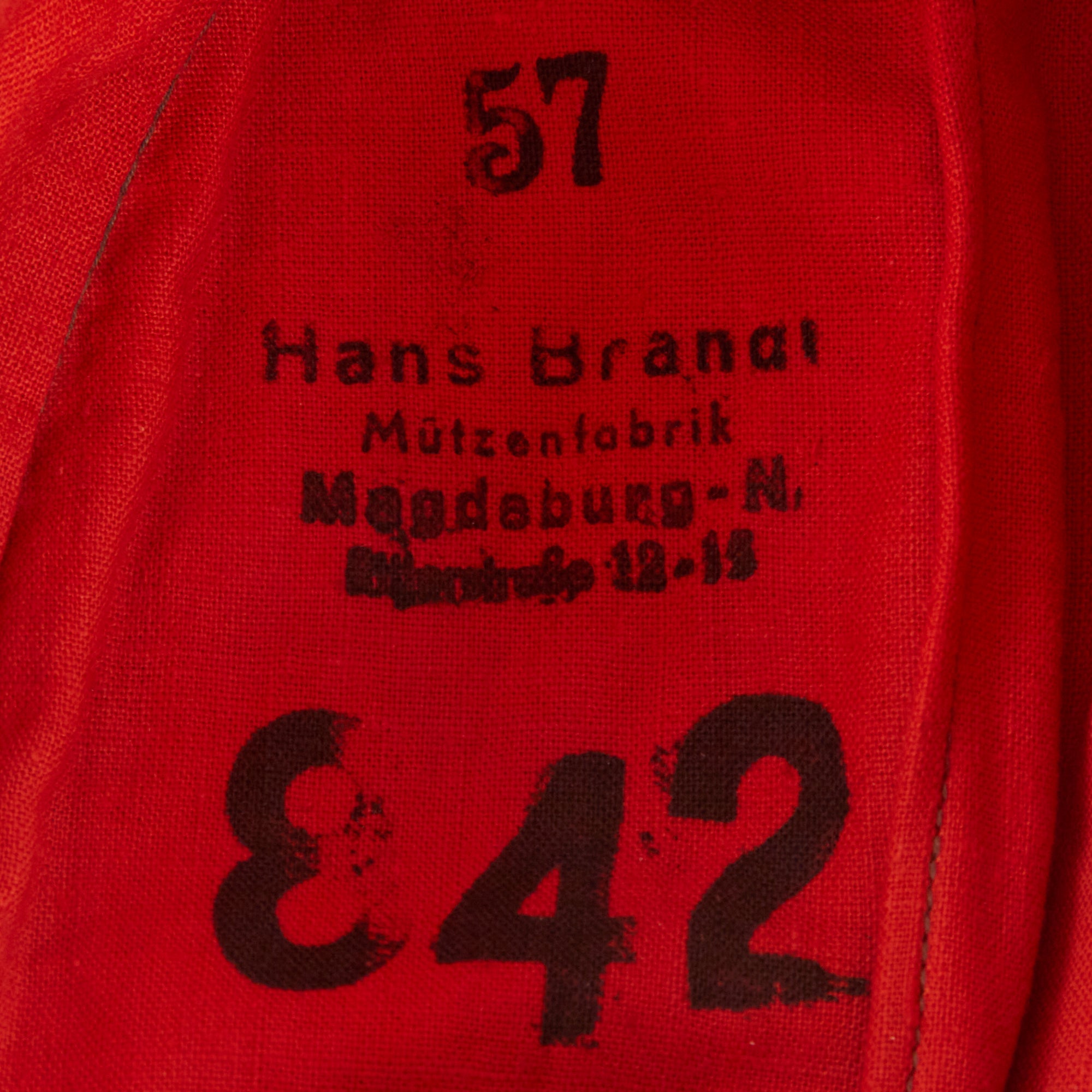 The cap was also lined with red cotton, the sides being the last to be sewn in place. The insignia was sewn to the shell before the lining was added, and used exactly the same eagle, roundel and soutache as the M-40 'Afrikamütze'. From 1943 onwards, as with the M-40 billed cap, the eagle can be seen to be sewn on some examples on a triangular backing. This was a simple measure to speed up production, although it tended to lend the cap with a less attractive appearance.