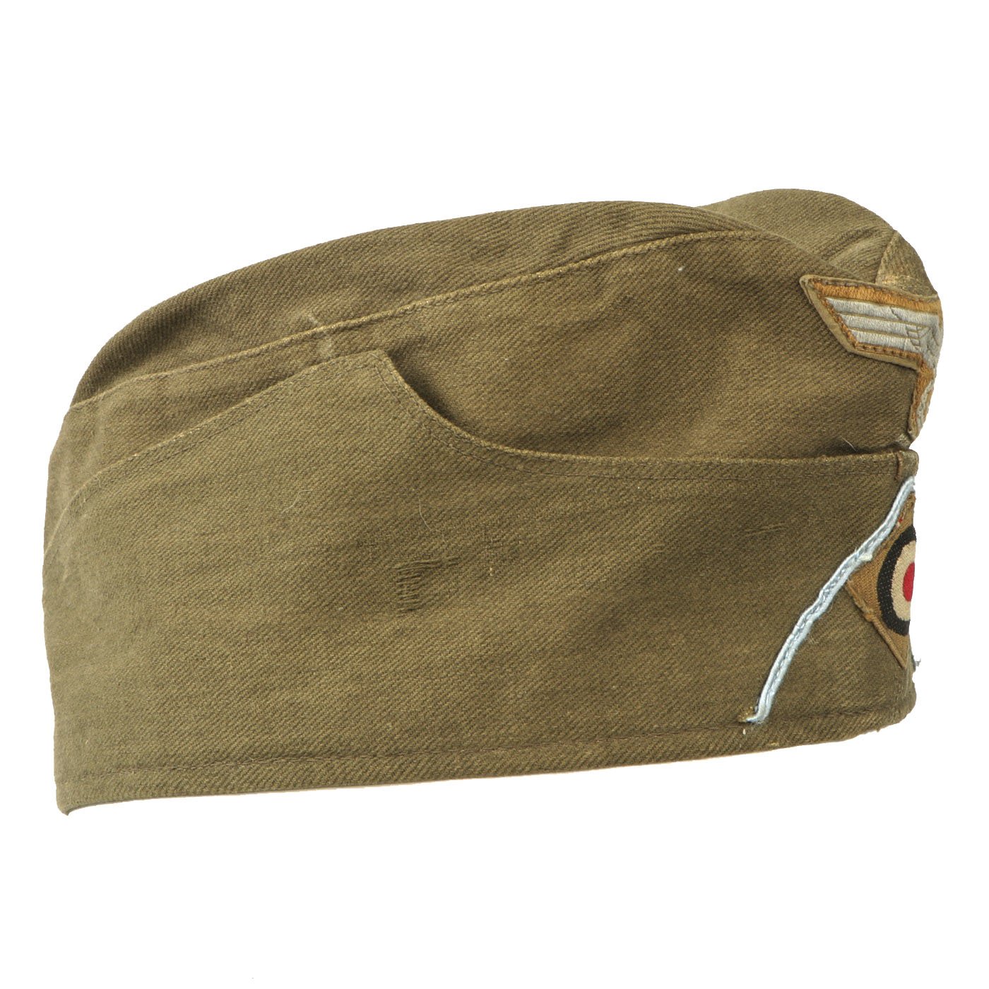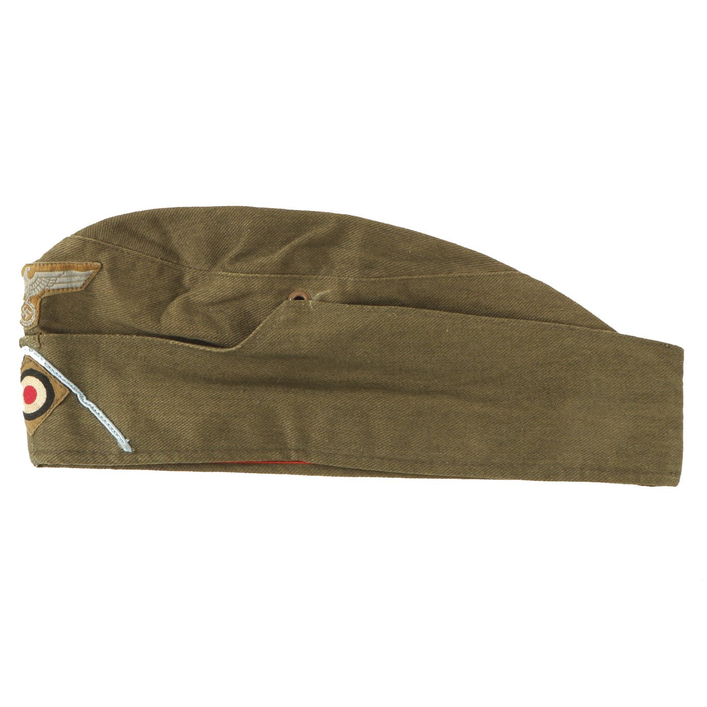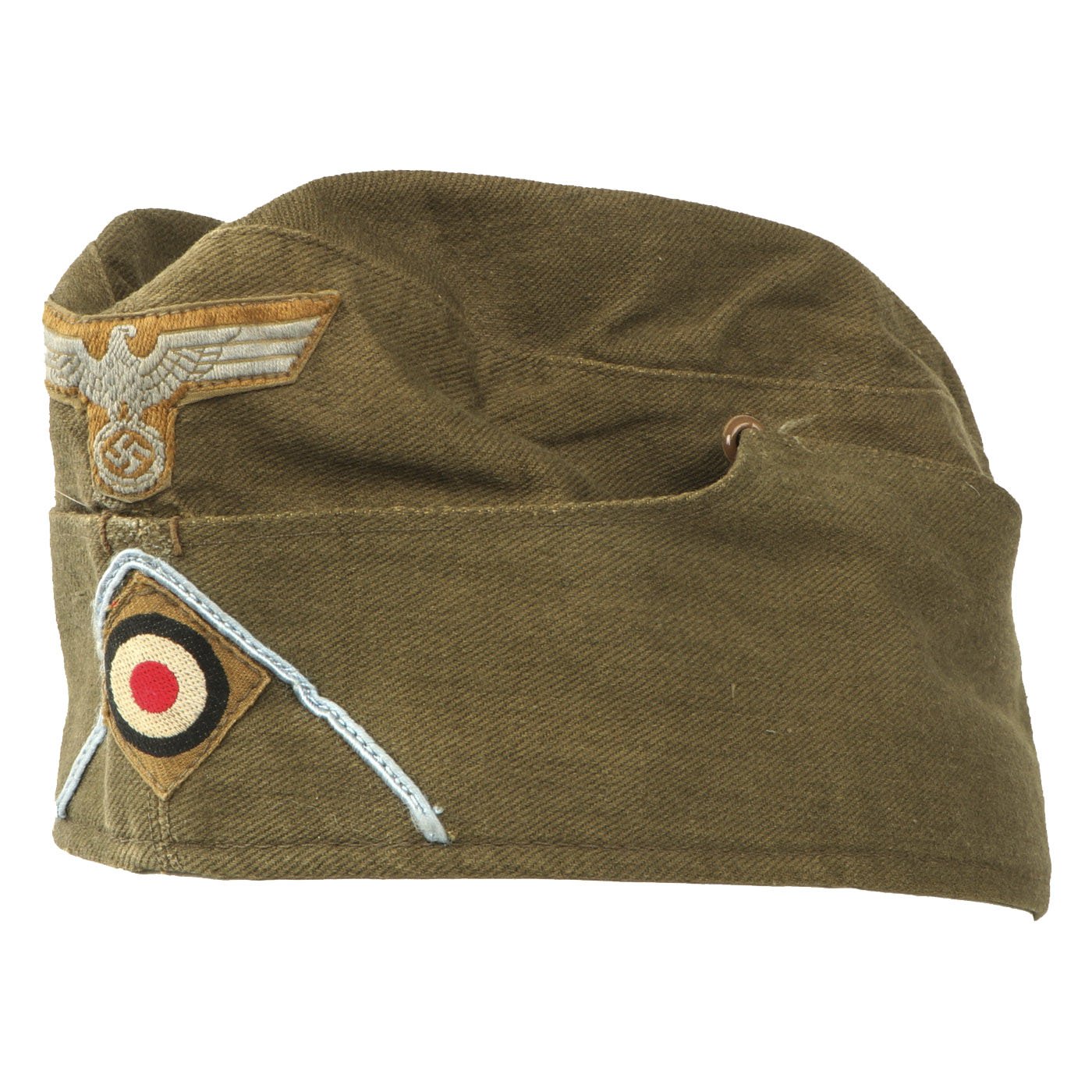 Original Item: Only One Available. The second most predominant item of Heer tropical soft headgear was based on the M-34 / 38 overseas cap, nicknamed in German army slang as Schiffchen, or literally "little ship" as it resembled an up-turned row-boat. It lacked a peak or visor, and was made in the same cotton as the M-40 'Afrikamütze' cap. The production of these also started in 1940. The schiffchen utilized the same brown enameled stock for the vent holes as the M-40.