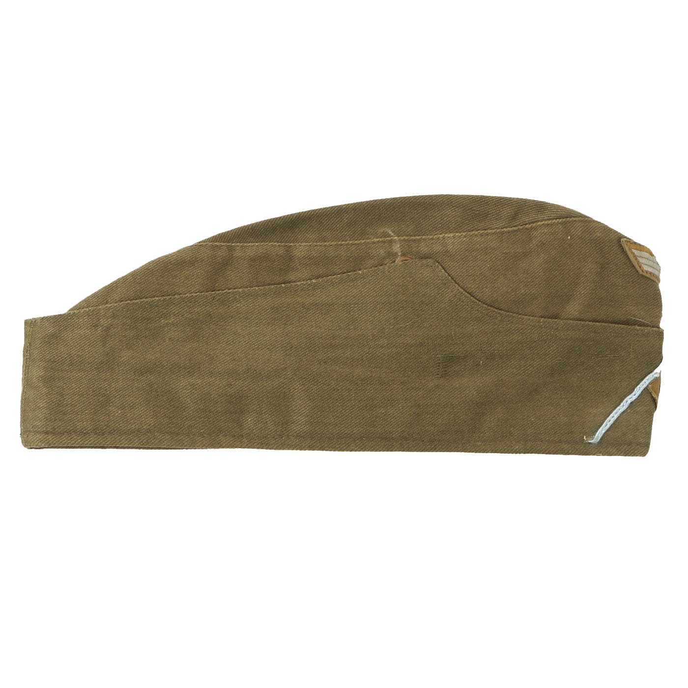 As with the continental wool version, the tropical overseas cap had turn-down sides, but these could not be folded down to cover the ears for cold weather protection because they were stitched in the front and back. Later war versions retained the seam, but were entirely sewn down, now just a separate part of the exterior.