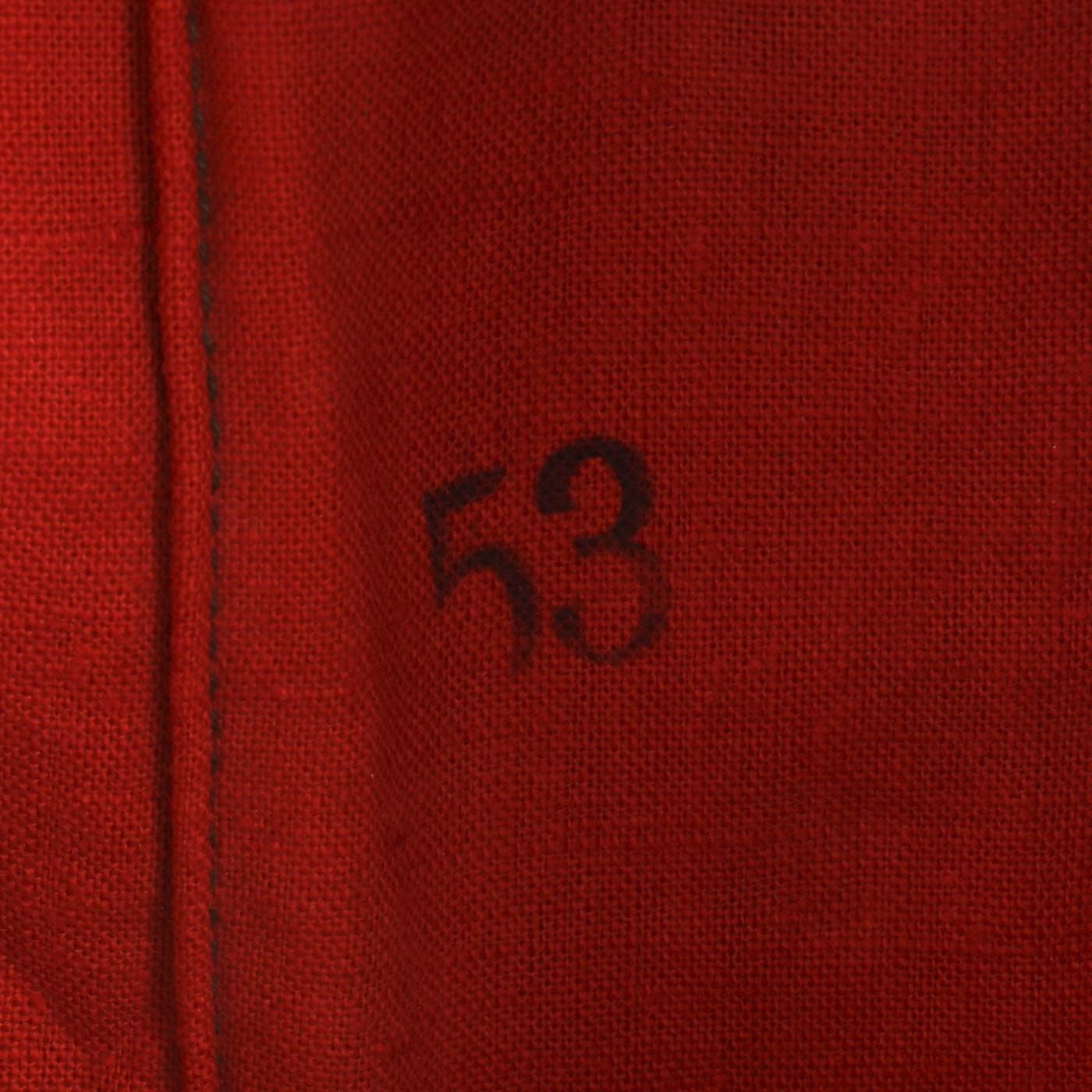 The interior has a liner of lightweight red cotton cloth that is well marked with full manufacturer and size information: