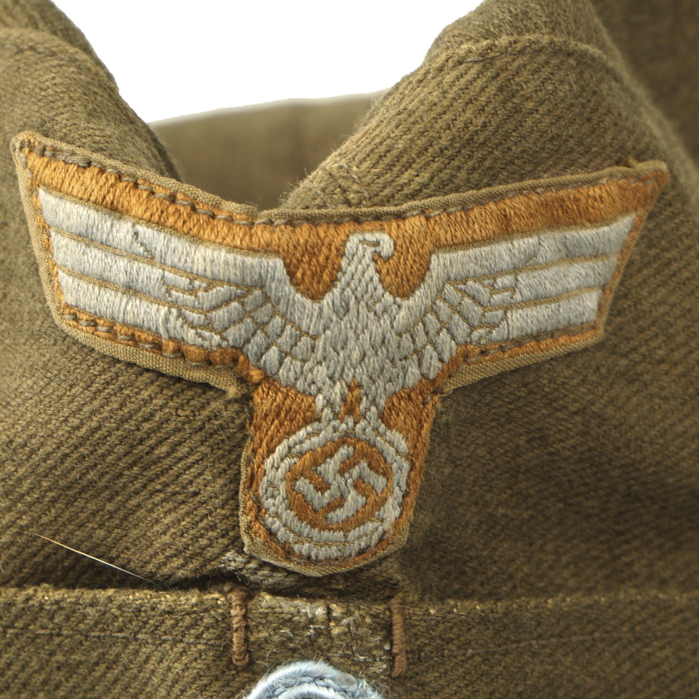 The cap was also lined with red cotton, the sides being the last to be sewn in place. The insignia was sewn to the shell before the lining was added, and used exactly the same eagle, roundel and soutache as the M-40 'Afrikamütze'. From 1943 onwards, as with the M-40 billed cap, the eagle can be seen to be sewn on some examples on a triangular backing. This was a simple measure to speed up production, although it tended to lend the cap with a less attractive appearance.