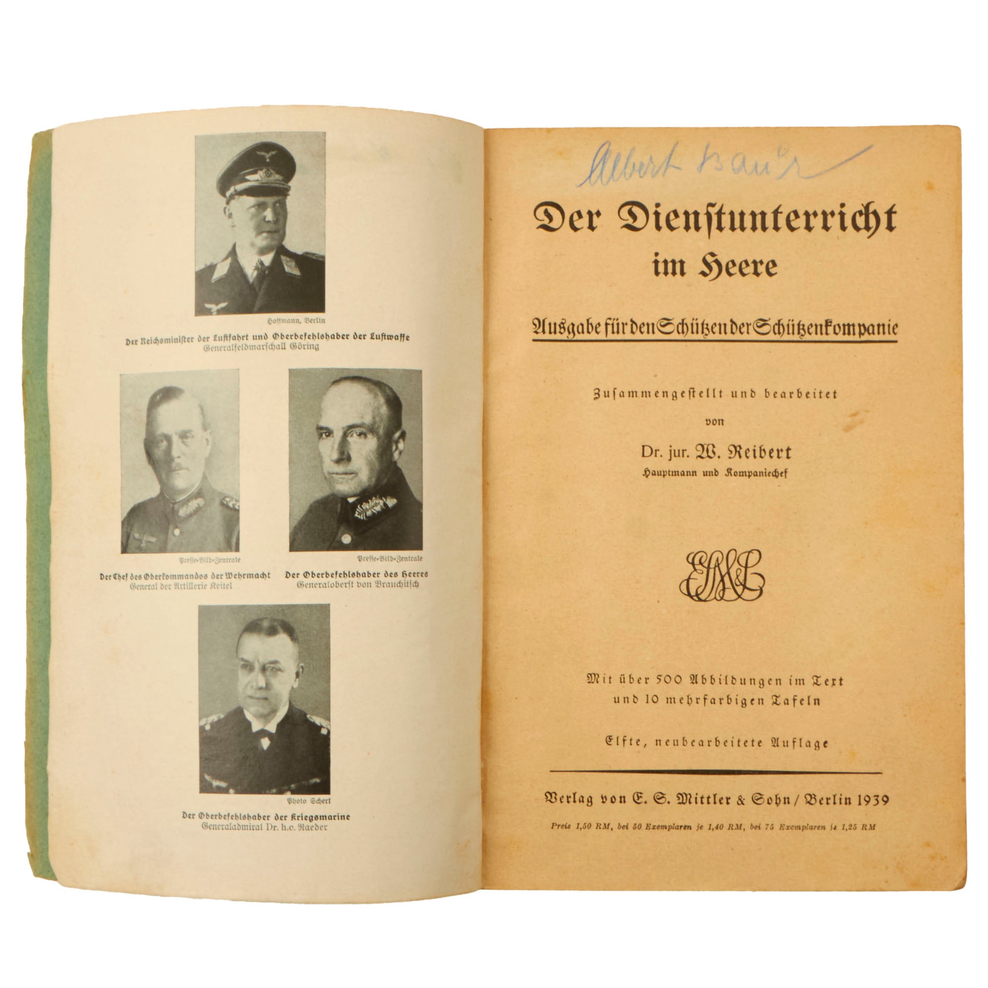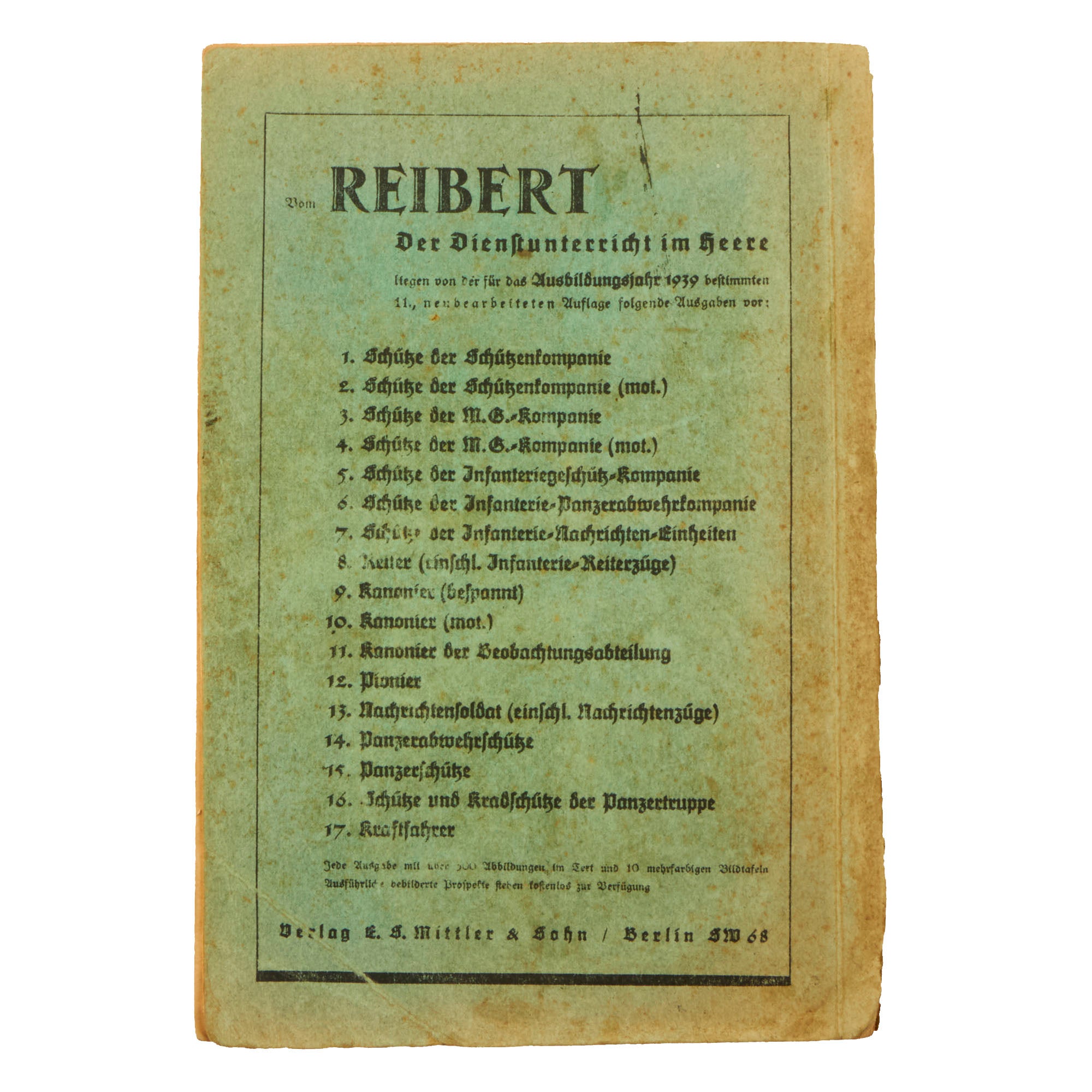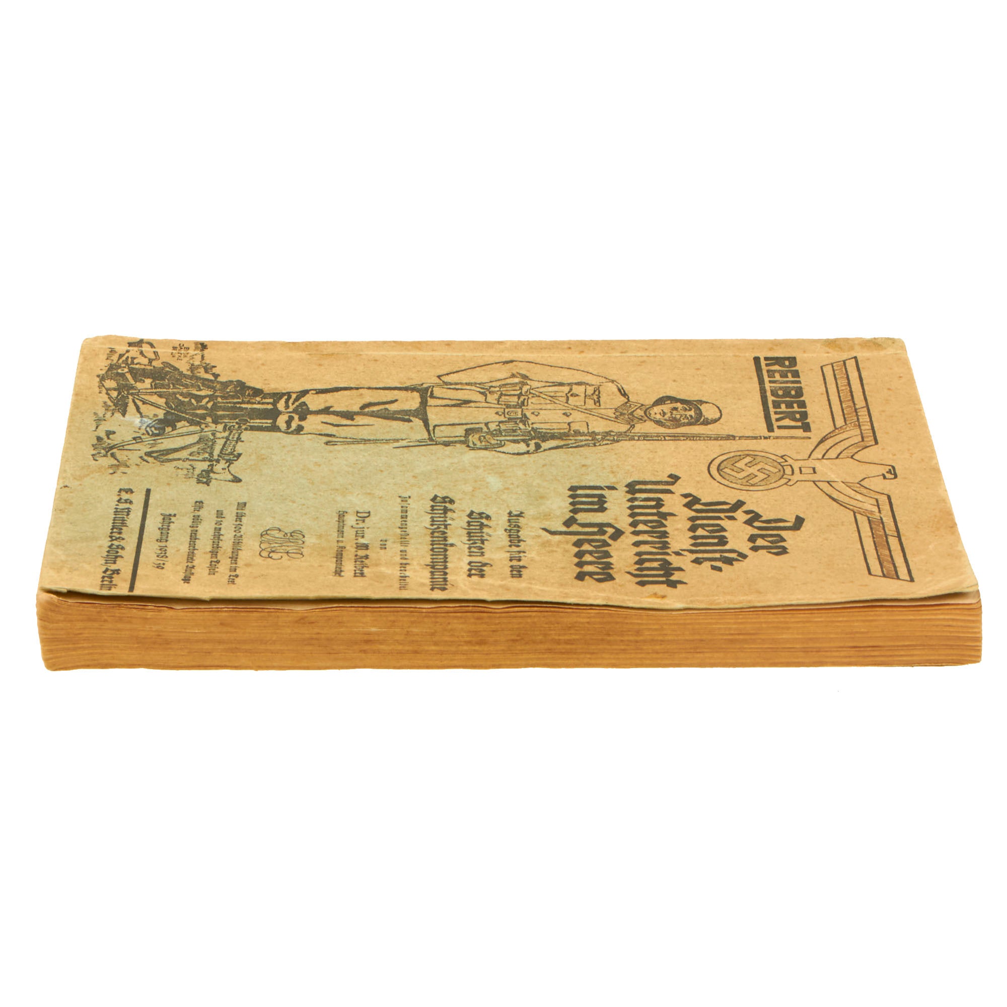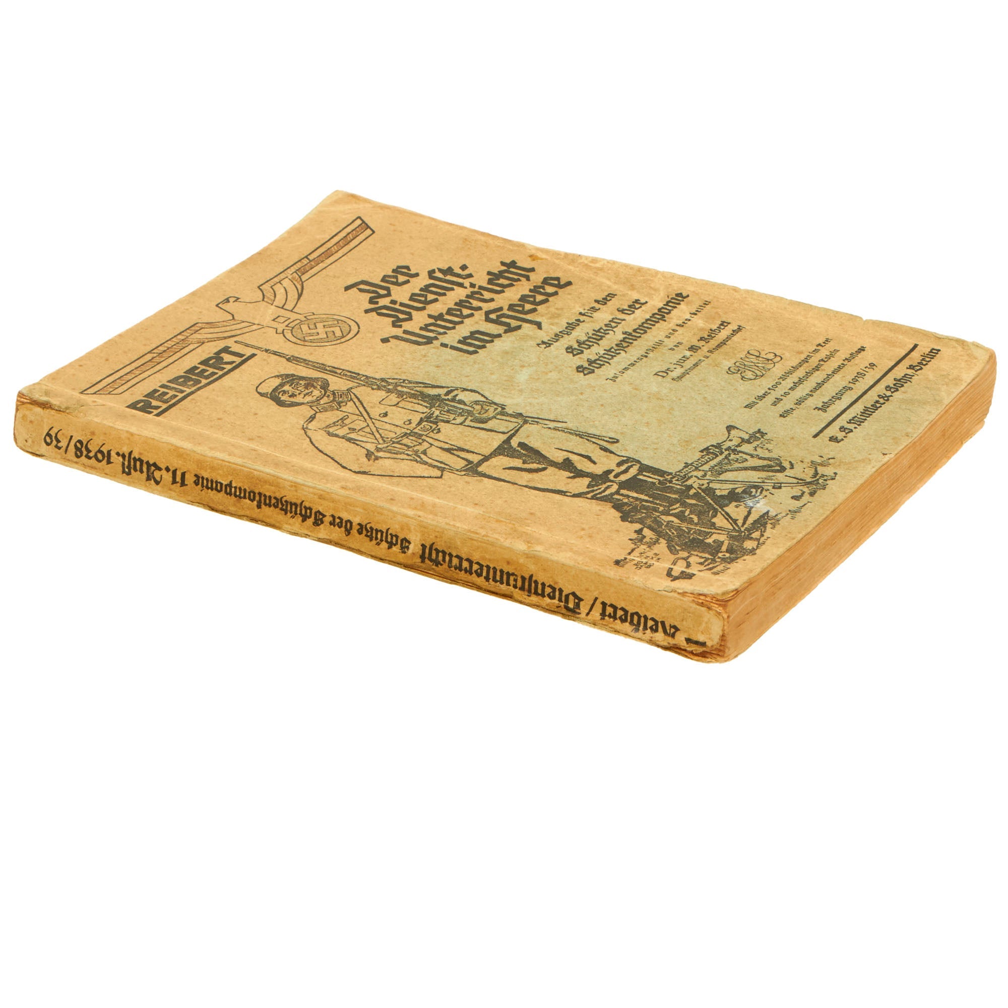 Original Item: Only One Available. This is a very nice example of a 1938/39 dated Der Dienſt-Unterricht im Heere (The Army Service Training Manual) in paperback, written by Dr. jur. W Reibert, Hauptmann u. Kompaniechef. The subtitle of this example is Ausgabe für den Schützen der Schützenkompanie (Edition for the rifleman of the rifle company), so this was the standard service manual for a member of the Heer Army Infantry soldier. It measures 5 1/2" x 8" and is approximately 325 pages long, all in German, as would be expected.