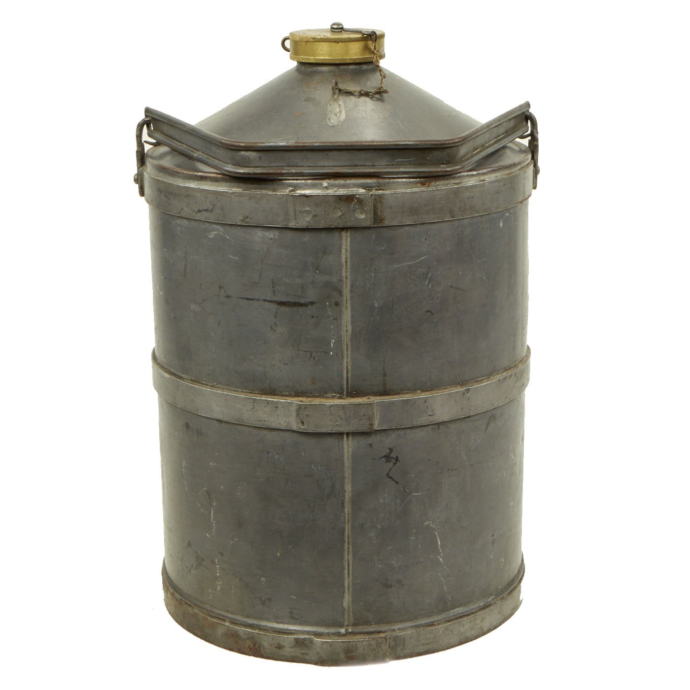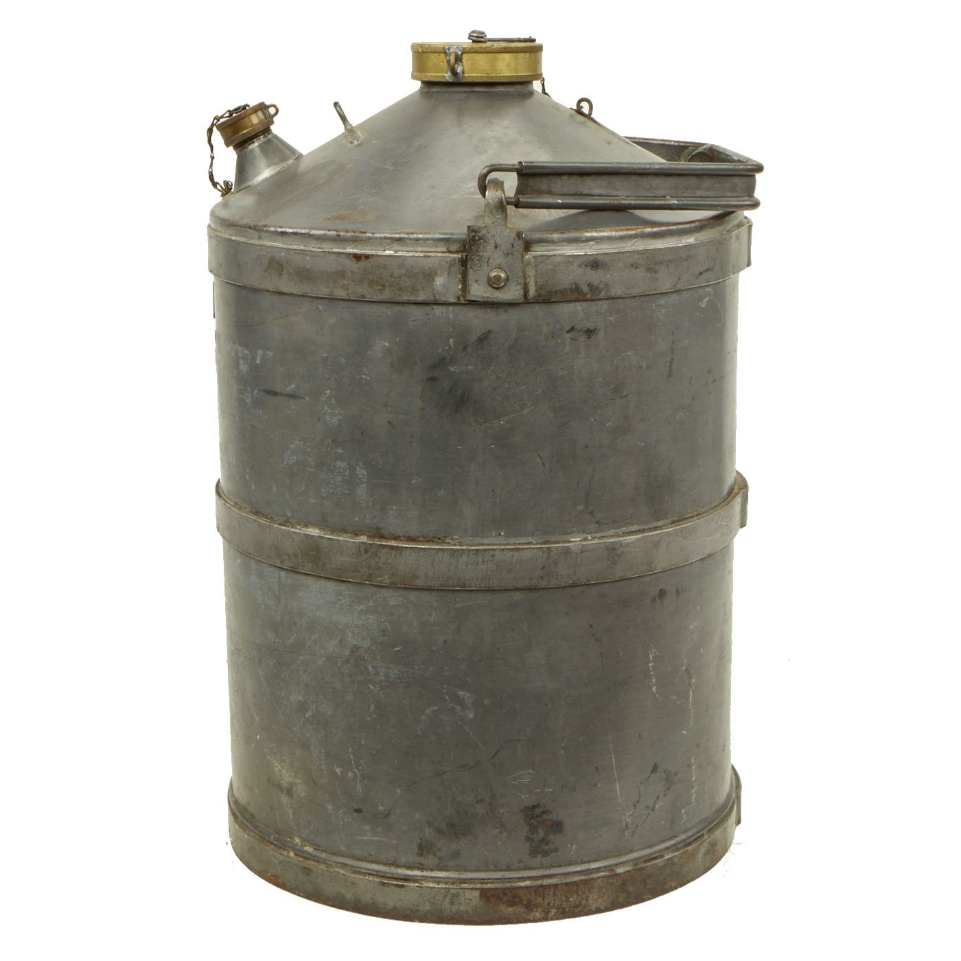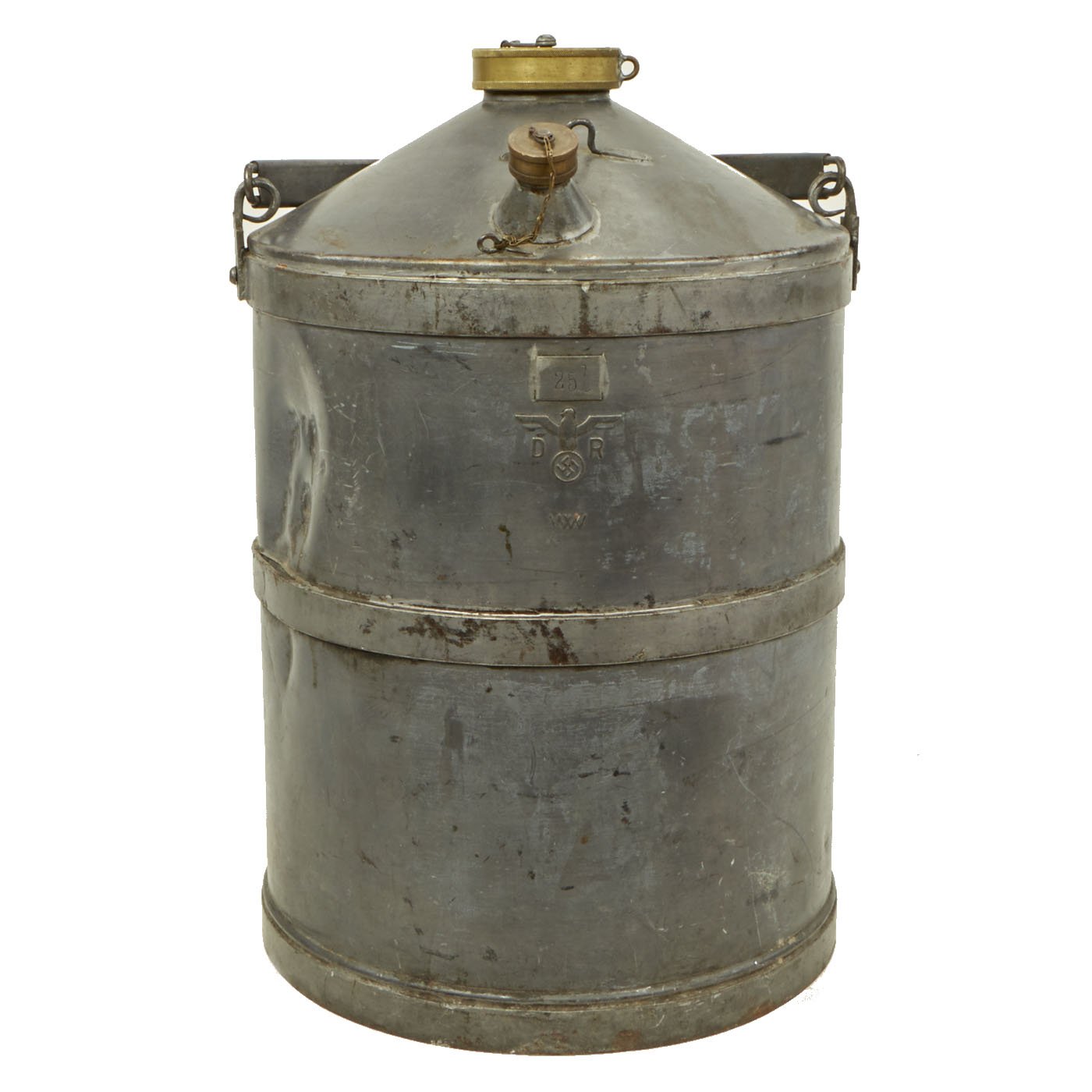 Original Item: Only One Available. This is a very nice German WWII Deutsche Reichsbahn 25L kerosene can, which measures approximately 19 inches (48cm) high with a 12 1/2 inch (32cm) diameter. Made of galvanized steel, it has a sturdy carry handle on the top, and a brass screw caps on the pouring spout and filling hole. We assume it was used to fill the many kerosene lanterns in use on trains of the period.
