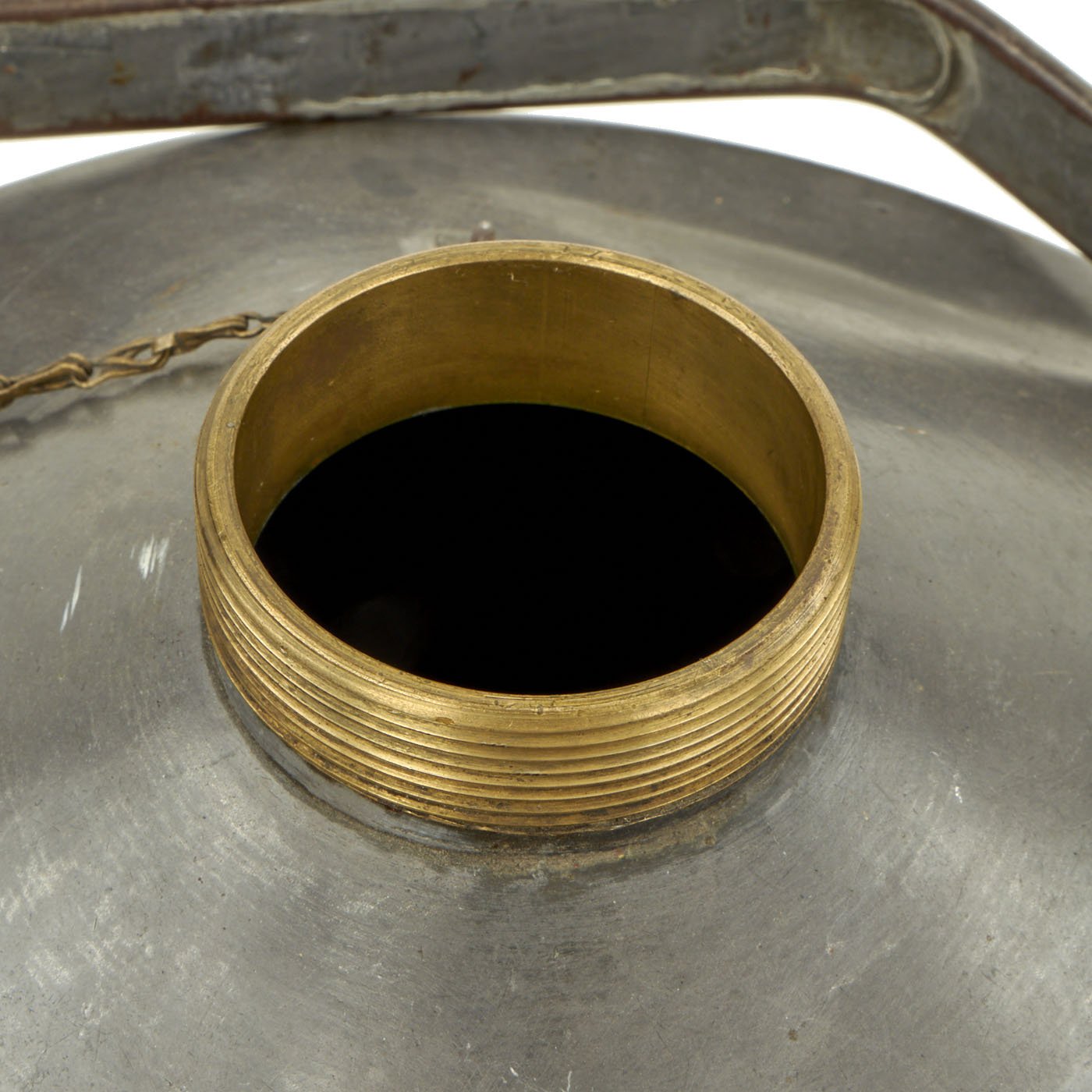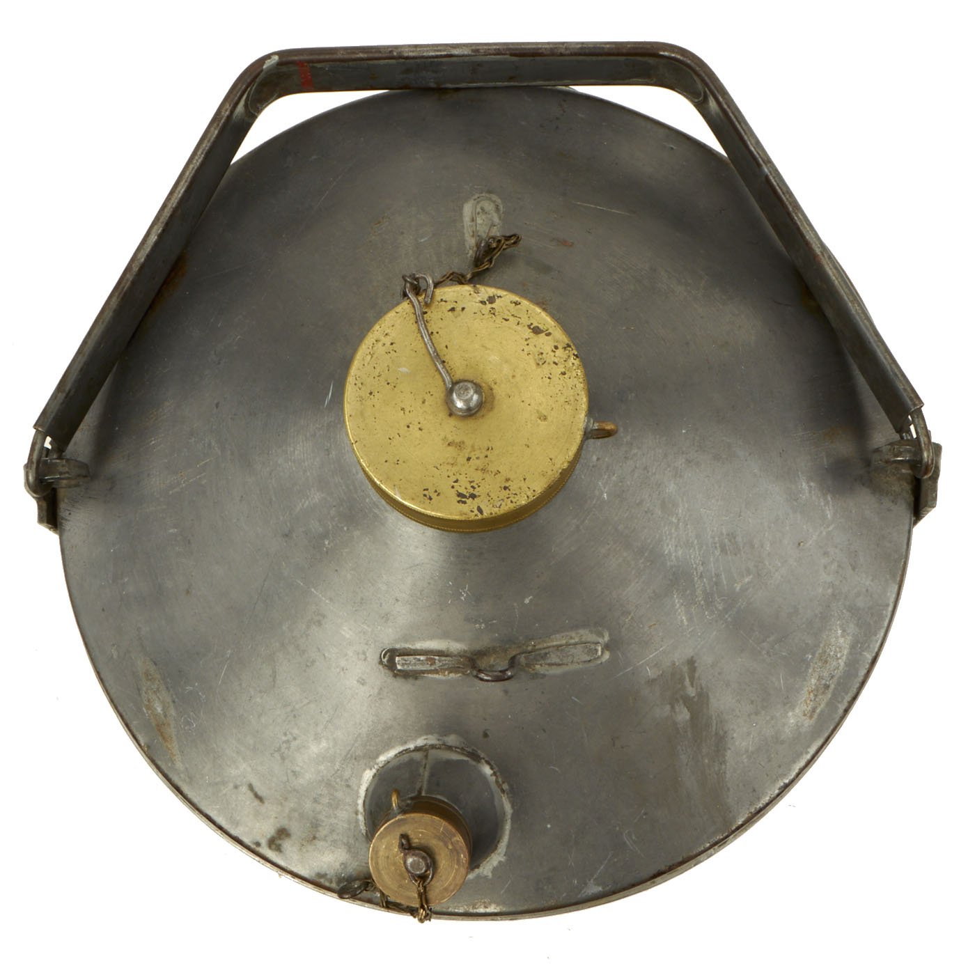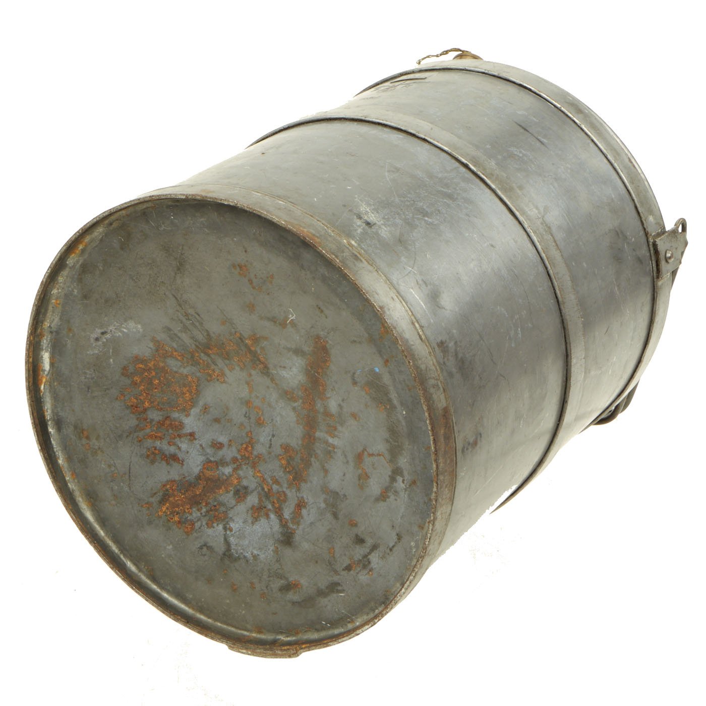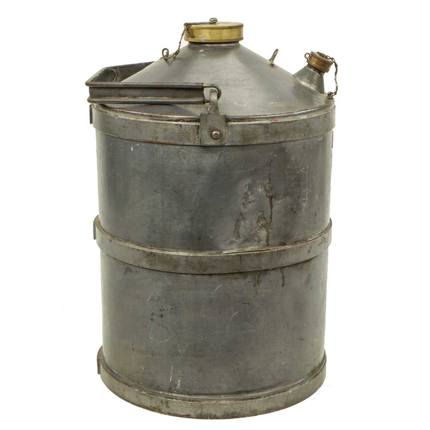 Original Item: Only One Available. This is a very nice German WWII Deutsche Reichsbahn 25L kerosene can, which measures approximately 19 inches (48cm) high with a 12 1/2 inch (32cm) diameter. Made of galvanized steel, it has a sturdy carry handle on the top, and a brass screw caps on the pouring spout and filling hole. We assume it was used to fill the many kerosene lanterns in use on trains of the period.