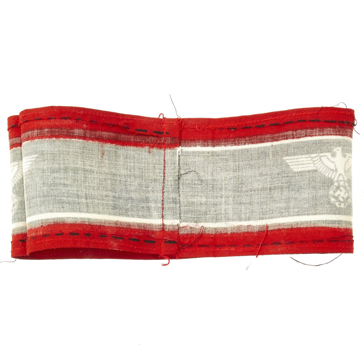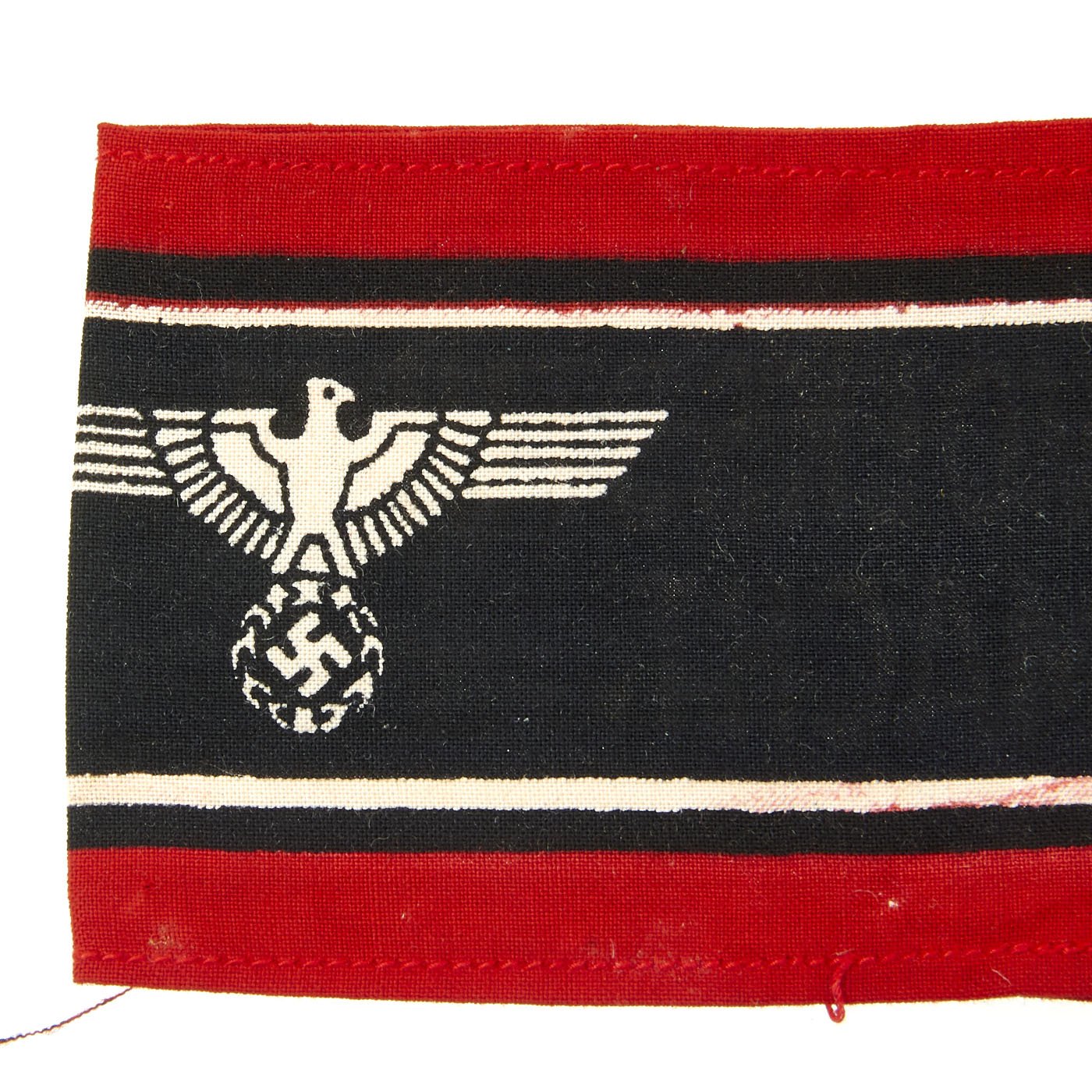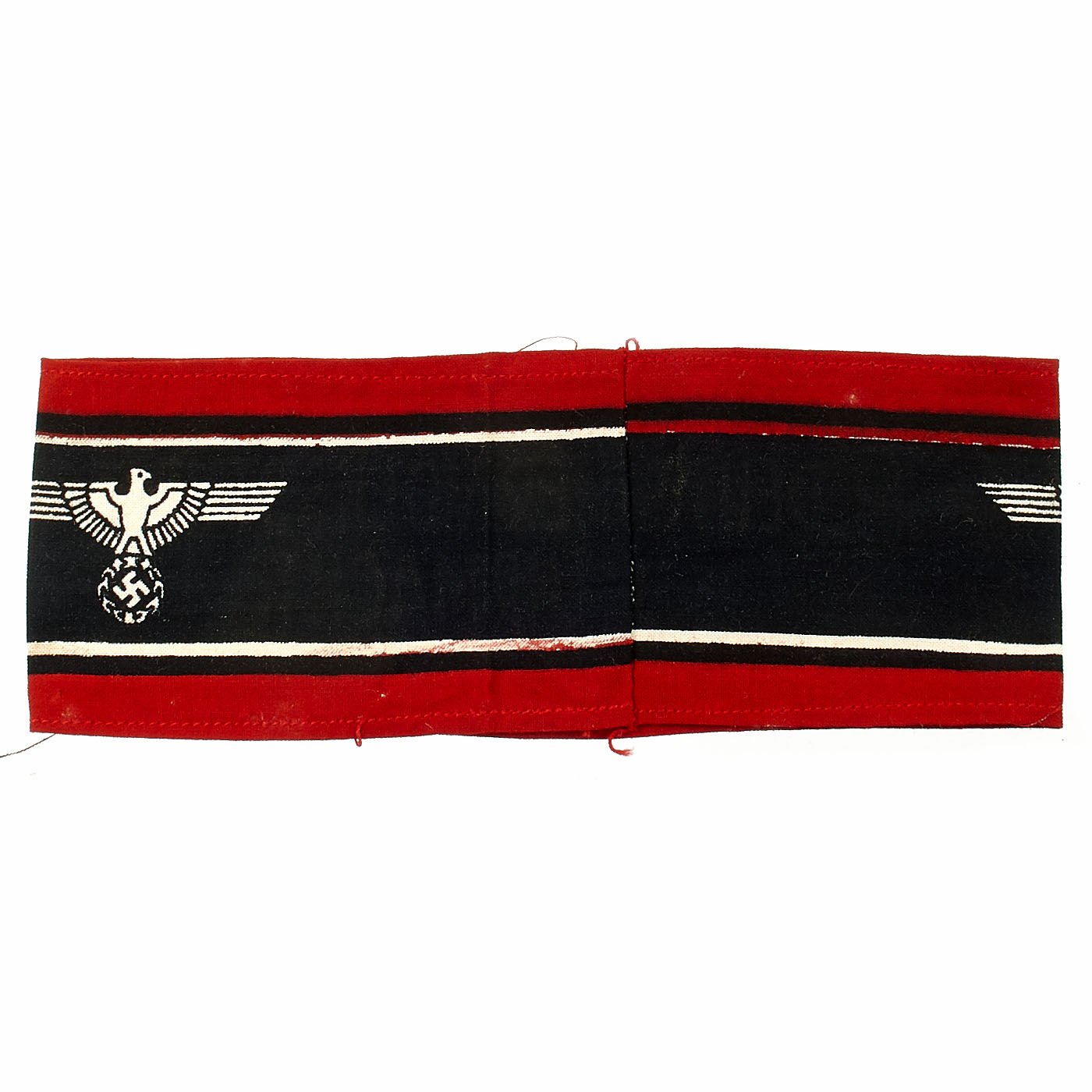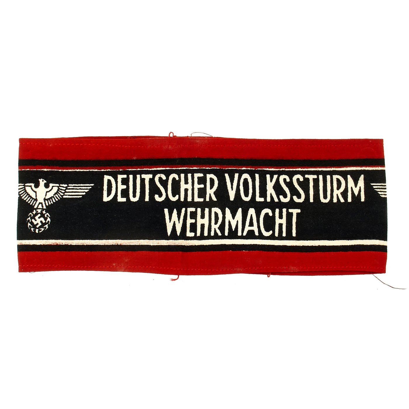 Original Item: Only One Available. This is a very nice rare example of a German WWII Deutscher Volkssturm Wehrmacht (German people's storm defense force) armband. This was basically a last ditch civic militia utilized in the end days of WWII, when German defeat was inevitable. It is constructed simply, a red, black, and white dyed cotton armband with DEUTSCHER VOLKSSTURM / WEHRMACHT marked onto the exterior. This is surrounded by two Reichsadler (German State Eagle) emblems. It measures approximately 15" x 2.75" , and is in excellent condition. There doesn't seem to be much wear at all, and the colors are vibrant. There is a bit of color bleed, due to rushed production.