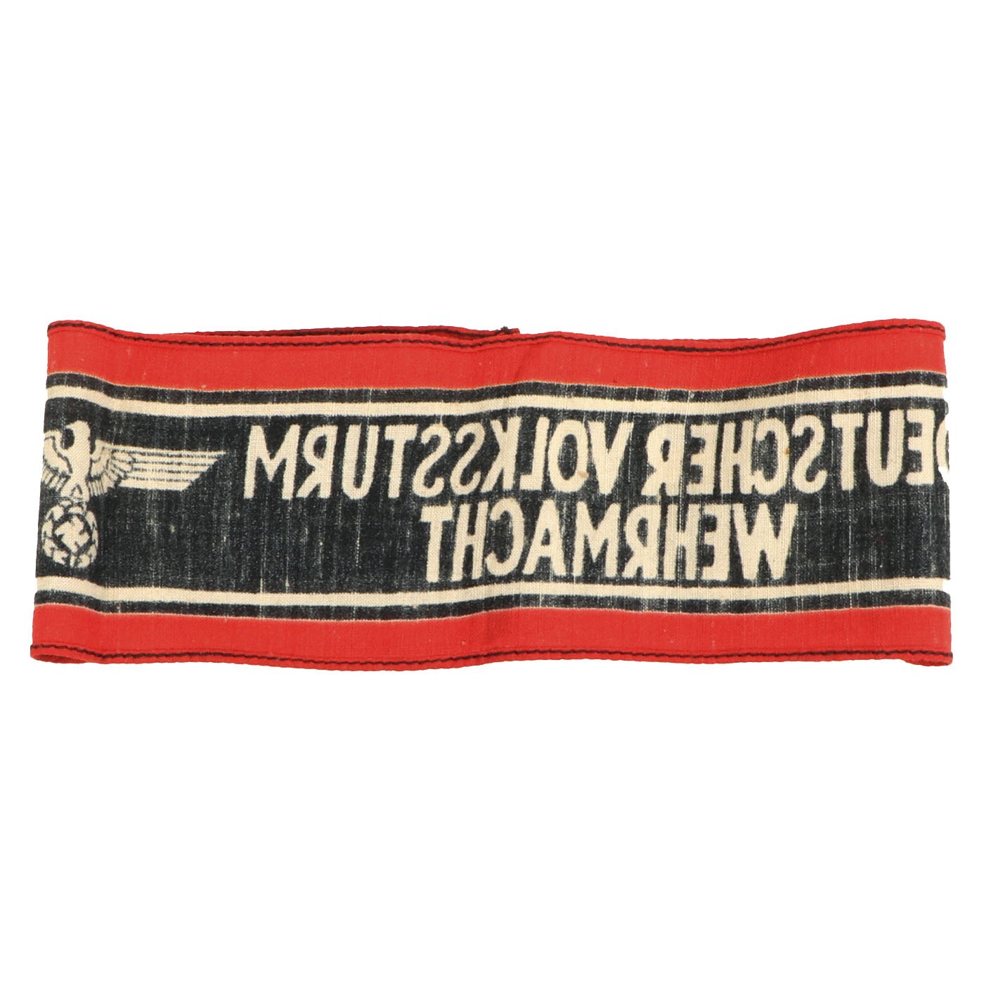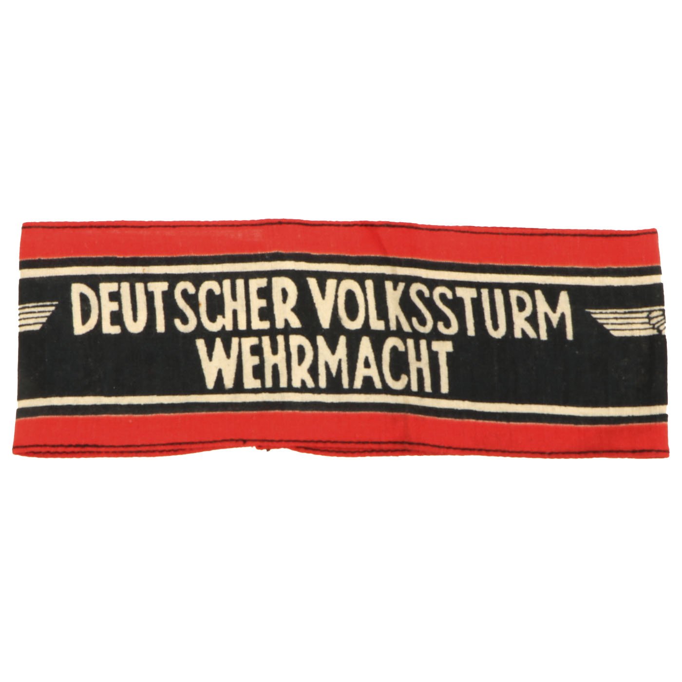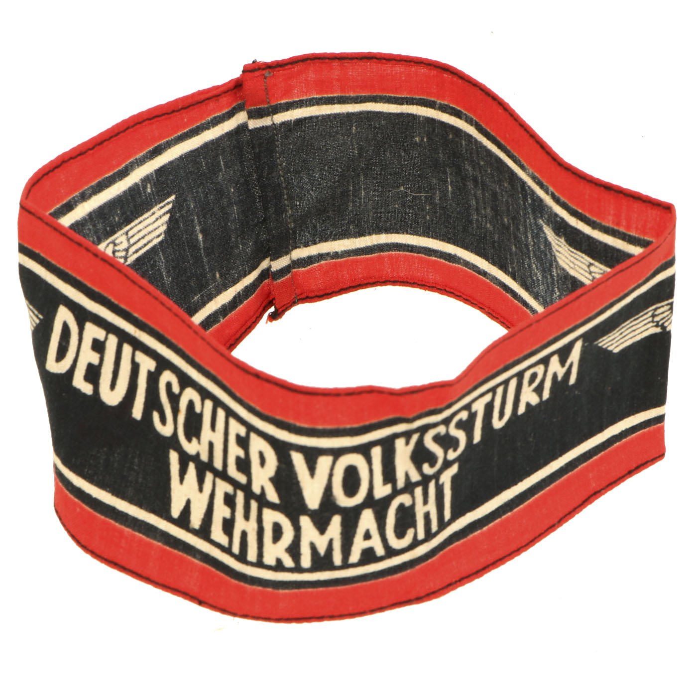 Original Item: Only One Available. This is a very nice rare example of a German WWII Deutscher Volkssturm Wehrmacht (German people's storm defense force) armband. This was basically a last ditch civic militia utilized in the end days of WWII, when German defeat was inevitable. It is constructed simply, a red, black, and white dyed cotton armband with DEUTSCHER VOLKSSTURM / WEHRMACHT marked onto the exterior. This is surrounded by two Reichsadler (German State Eagle) emblems. It measures approximately 14 1/2" x 2 5/8" , and is in very good condition. It shows only light wear, possibly from storage, and does not have any stitch holes usually seen on issued examples.