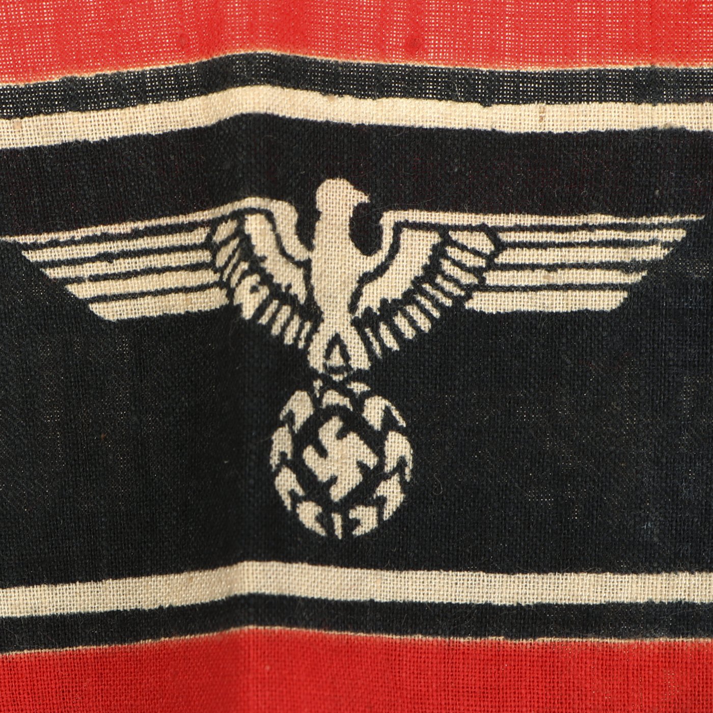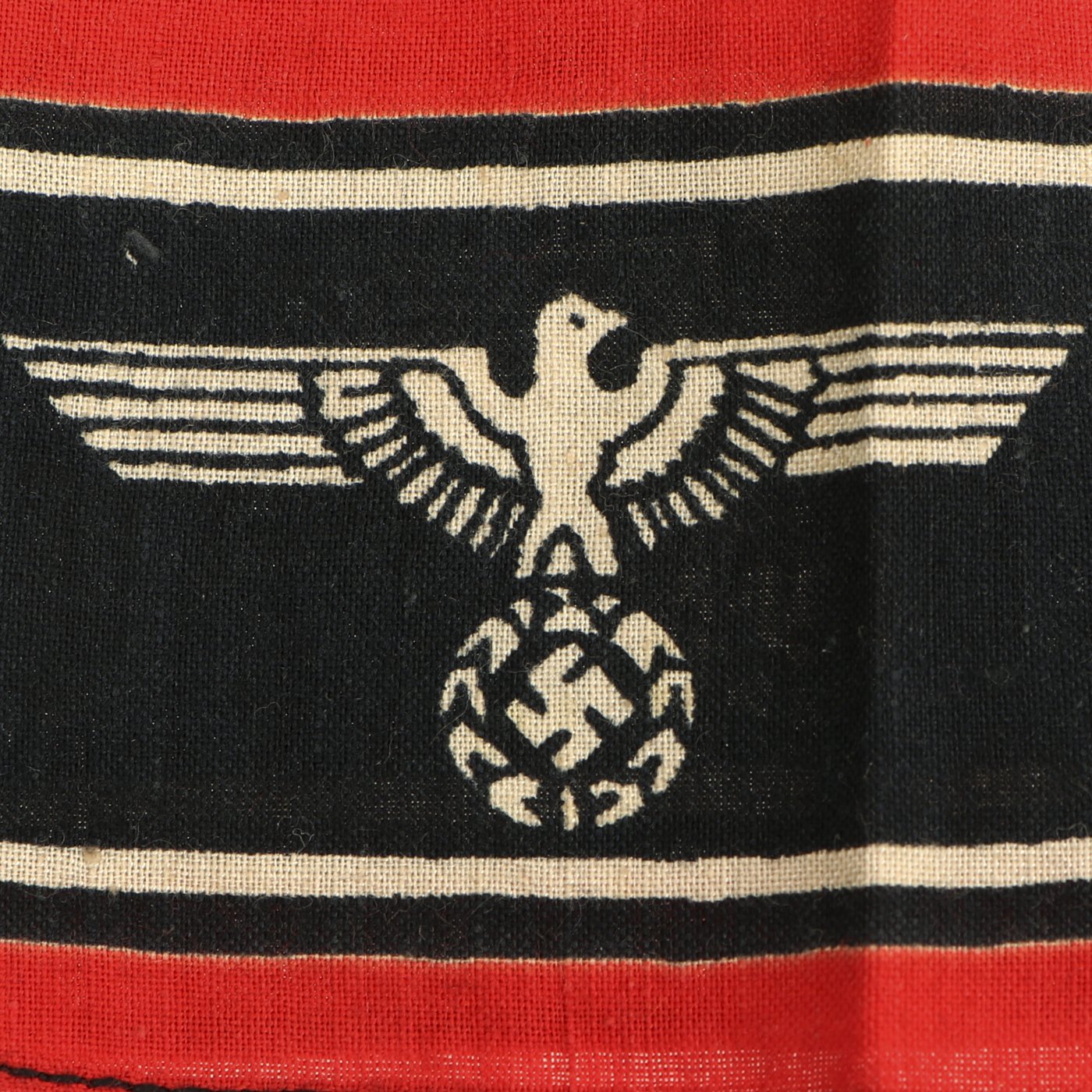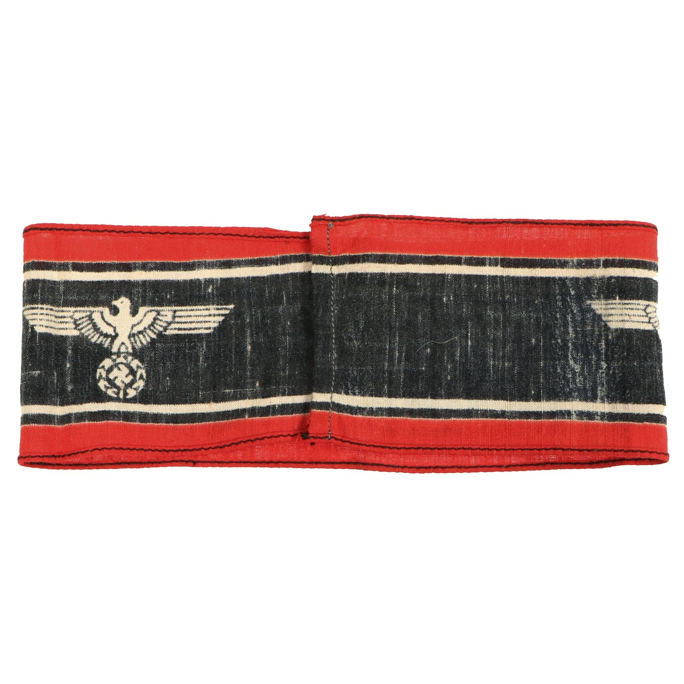Original Item: Only One Available. This is a very nice rare example of a German WWII Deutscher Volkssturm Wehrmacht (German people's storm defense force) armband. This was basically a last ditch civic militia utilized in the end days of WWII, when German defeat was inevitable. It is constructed simply, a red, black, and white dyed cotton armband with DEUTSCHER VOLKSSTURM / WEHRMACHT marked onto the exterior. This is surrounded by two Reichsadler (German State Eagle) emblems. It measures approximately 14 1/2" x 2 5/8" , and is in very good condition. It shows only light wear, possibly from storage, and does not have any stitch holes usually seen on issued examples.