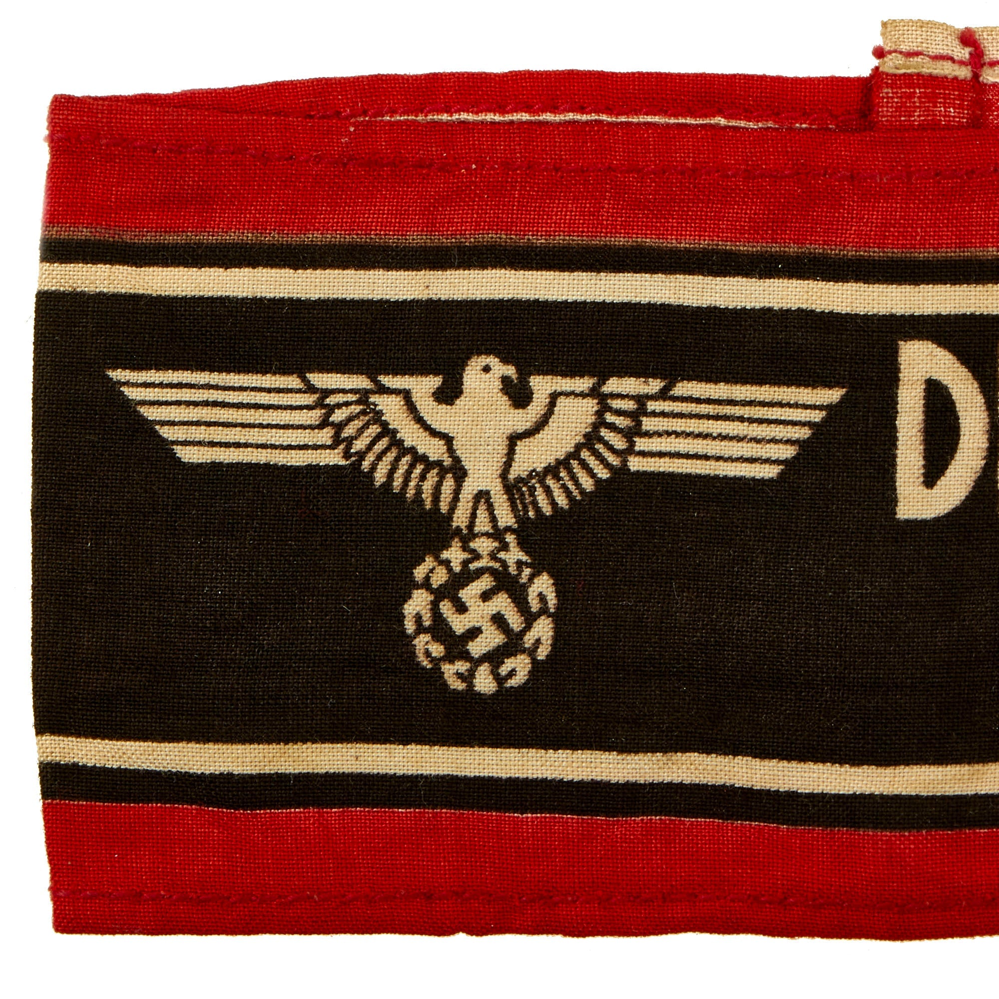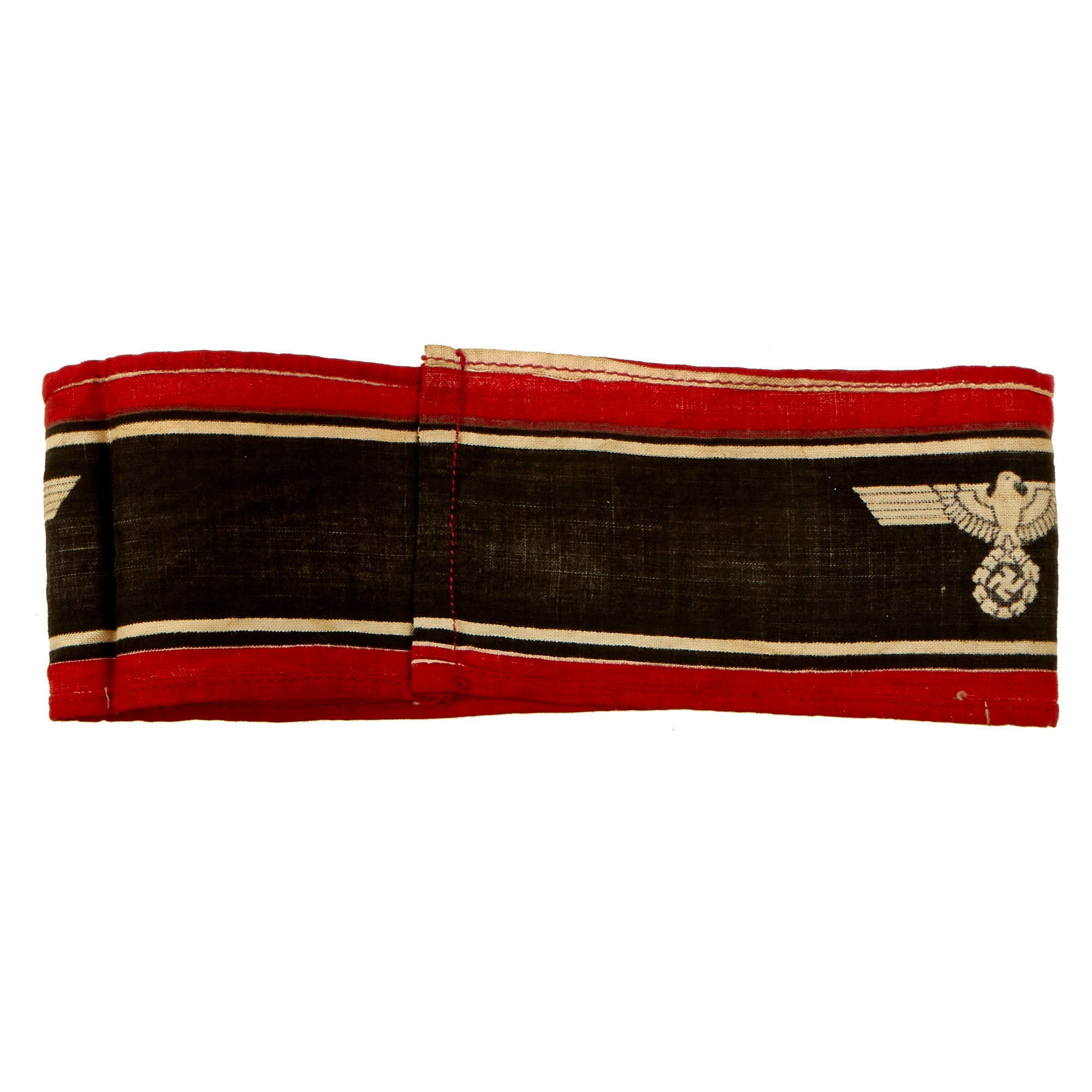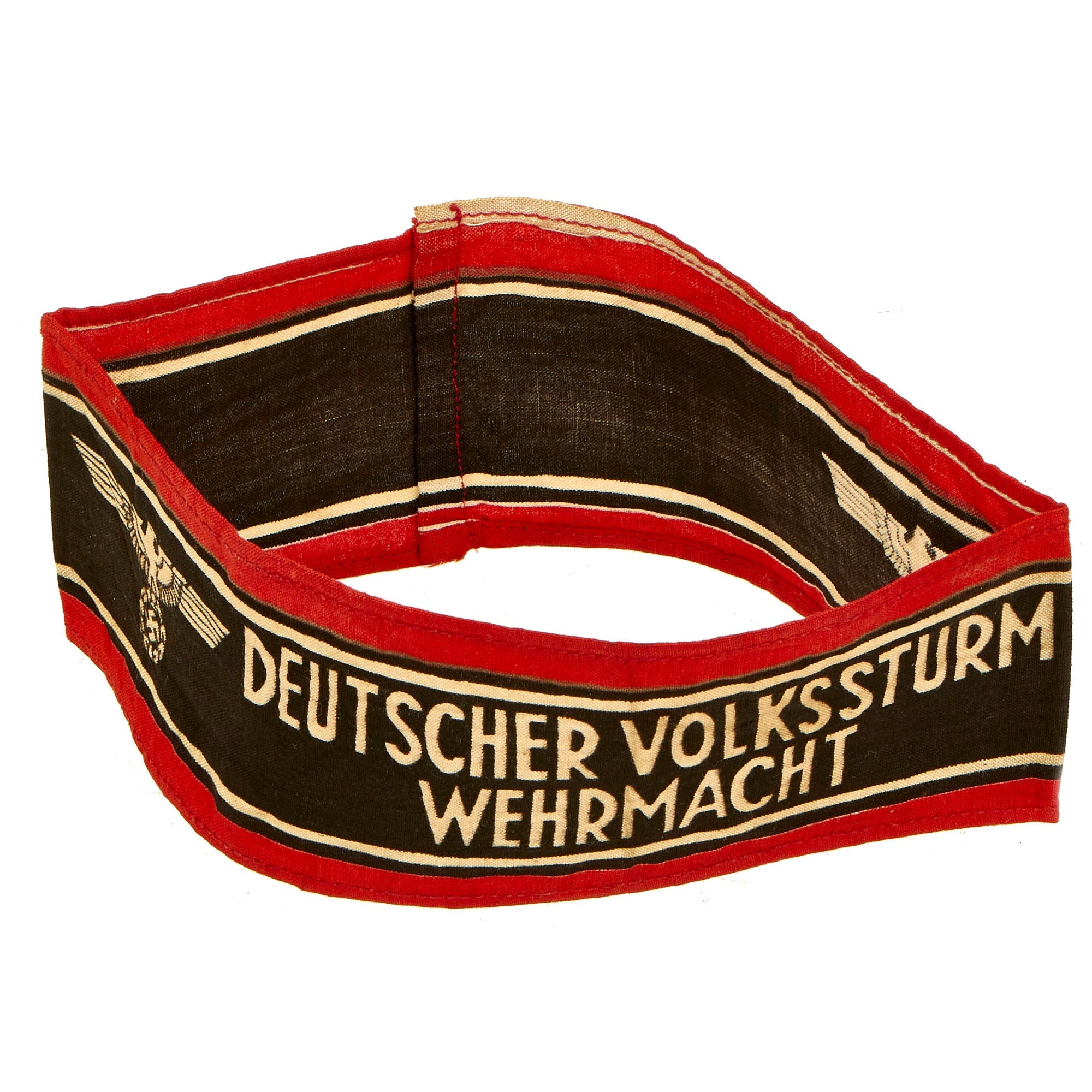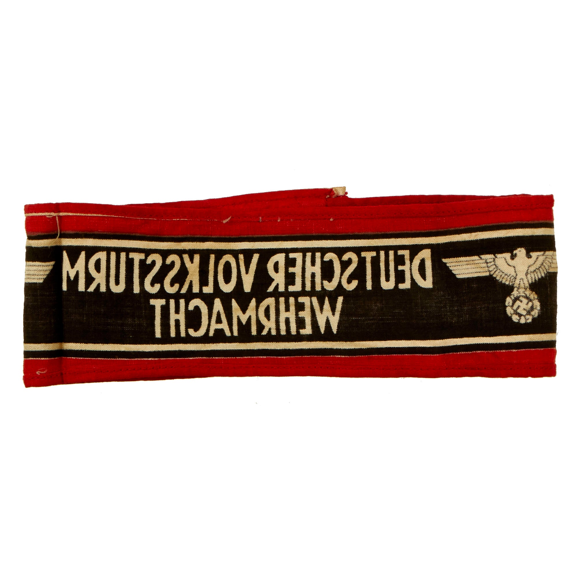 Original Item: Only One Available. This is a very nice rare example of a German WWII Deutscher Volkssturm Wehrmacht (German people's storm defense force) armband. This was basically a last ditch civic militia utilized in the end days of WWII, when German defeat was inevitable. It is constructed simply, a red, black, and white dyed cotton armband with DEUTSCHER VOLKSSTURM / WEHRMACHT marked onto the exterior. This is surrounded by two Reichsadler (German State Eagle) emblems. It measures approximately 17" x 2 5/8" , and is sewn together in the back. The armband is in very good condition, showing some light staining consistent with use in service.