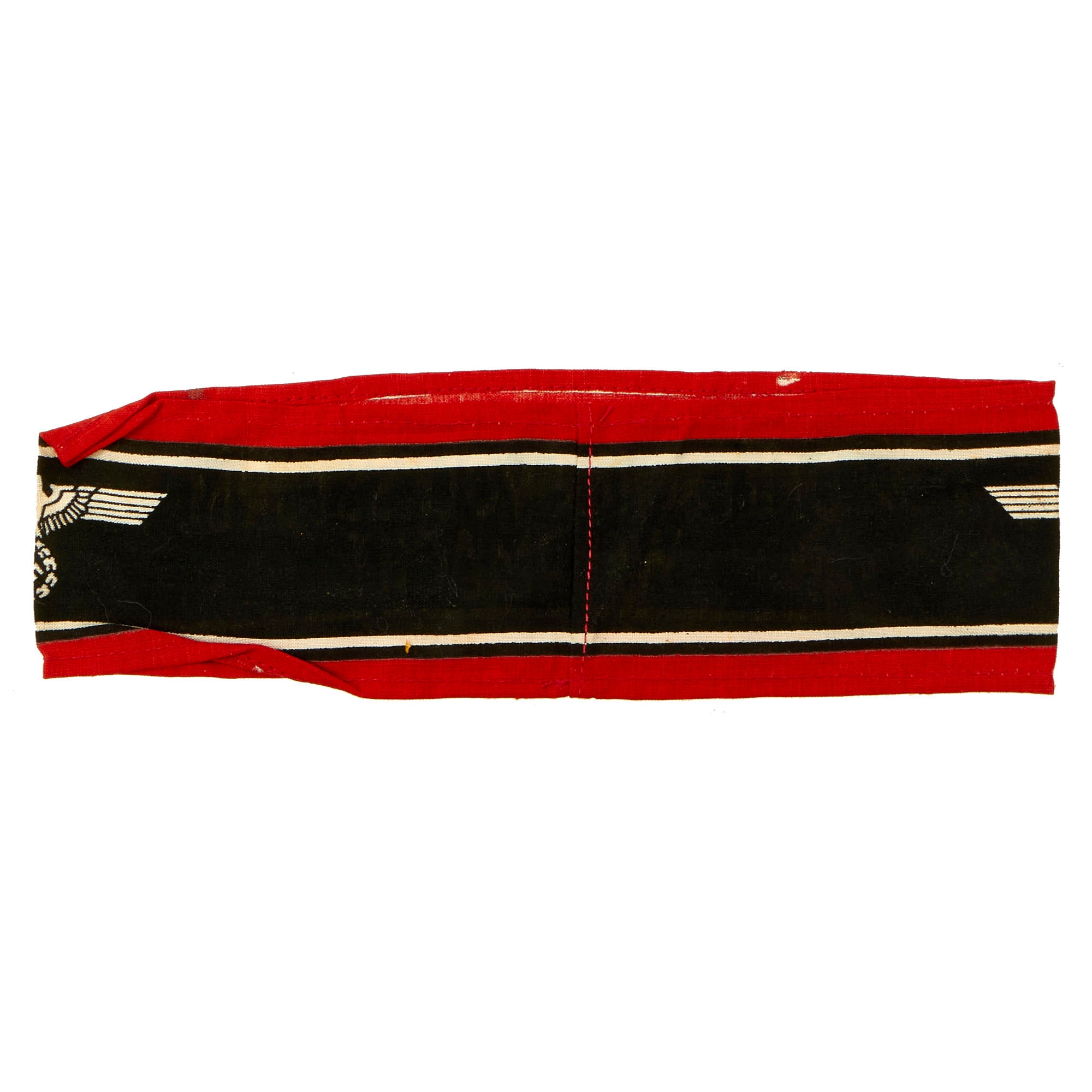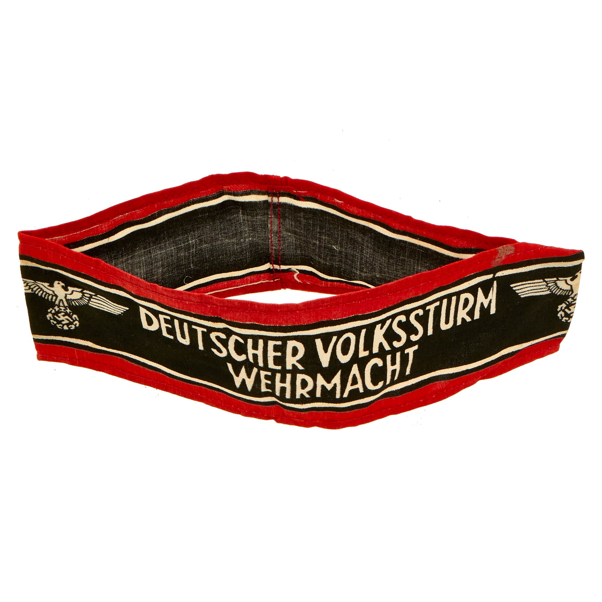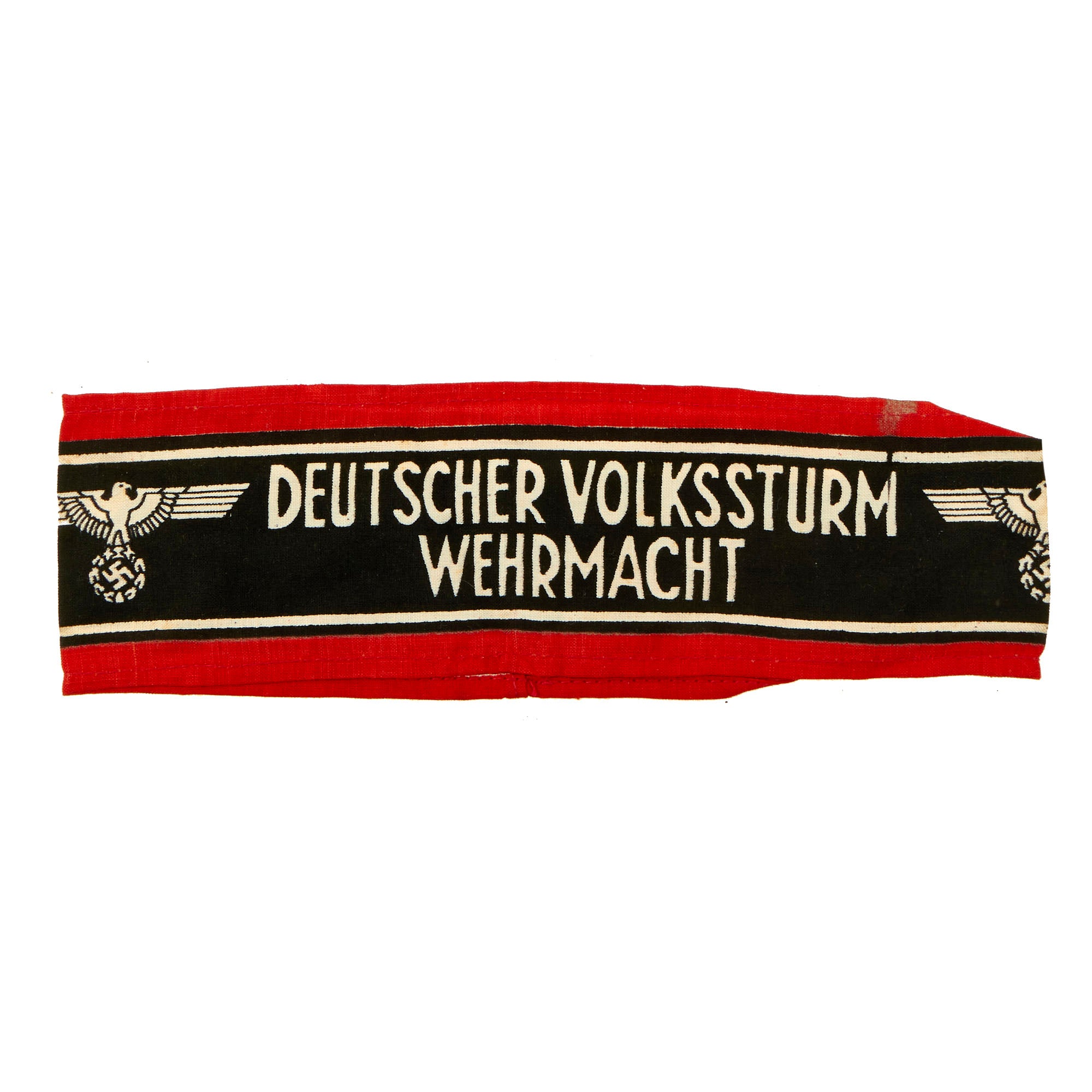 Original Item: Only One Available. This is a very nice rare example of a German WWII Deutscher Volkssturm Wehrmacht (German people's storm defense force) armband. This was basically a last ditch civic militia utilized in the end days of WWII, when German defeat was inevitable. It is constructed simply, a red, black, and white dyed cotton armband with DEUTSCHER VOLKSSTURM / WEHRMACHT marked onto the exterior. This is surrounded by two Reichsadler (German State Eagle) emblems. It measures approximately 17 3/4" x 2 5/8", and is sewn together in the back. The armband is in very good condition, showing some staining and crumpling consistent with use in service. There are also some small holes and wear along the edges.
